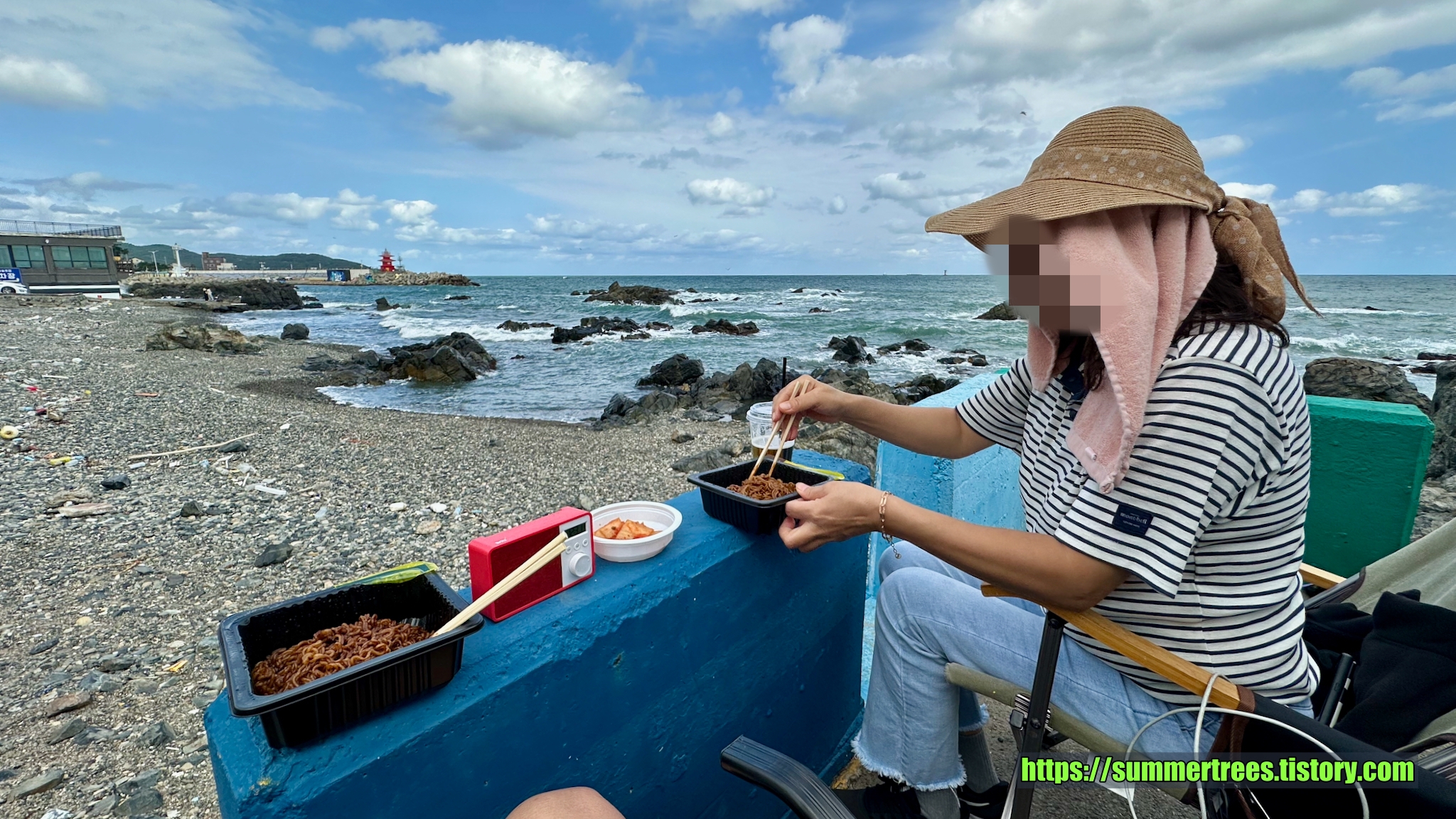 몽돌해변 주변엔 이미 사람들이 자리를 잡고 바다를 즐기고 있었다. 대개 주차장과 도로변에 차를 대고 몽돌해변에 텐트를 친다.