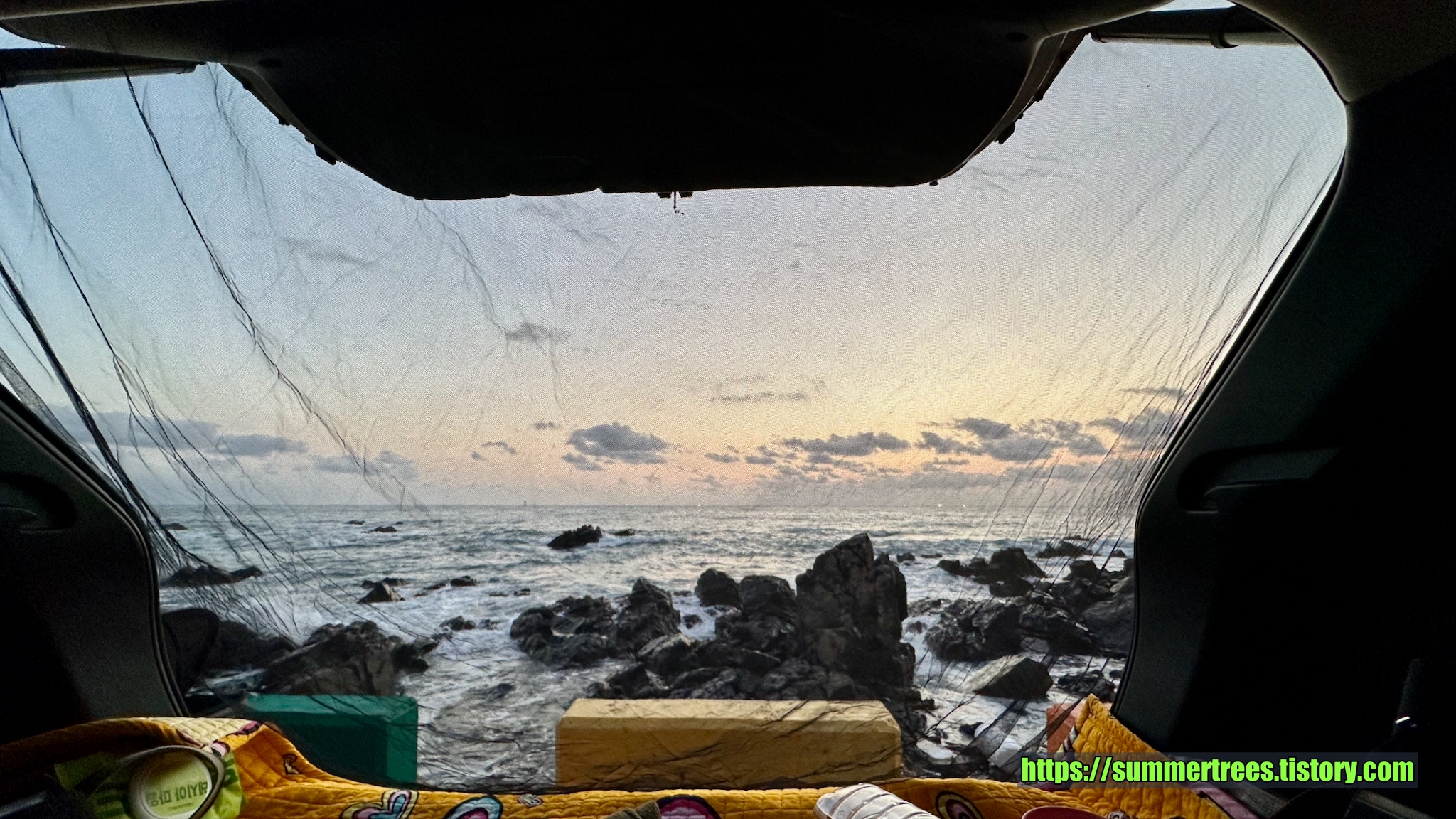 우리는 차박을 할 생각이라서 적당한 자리를 찾았지만 몽돌해변에서는 좋은 곳을 찾지 못했다. 주차장에서는 차박이 곤란해서 주변을 둘러보다 딱 좋은 자리를 찾았다.