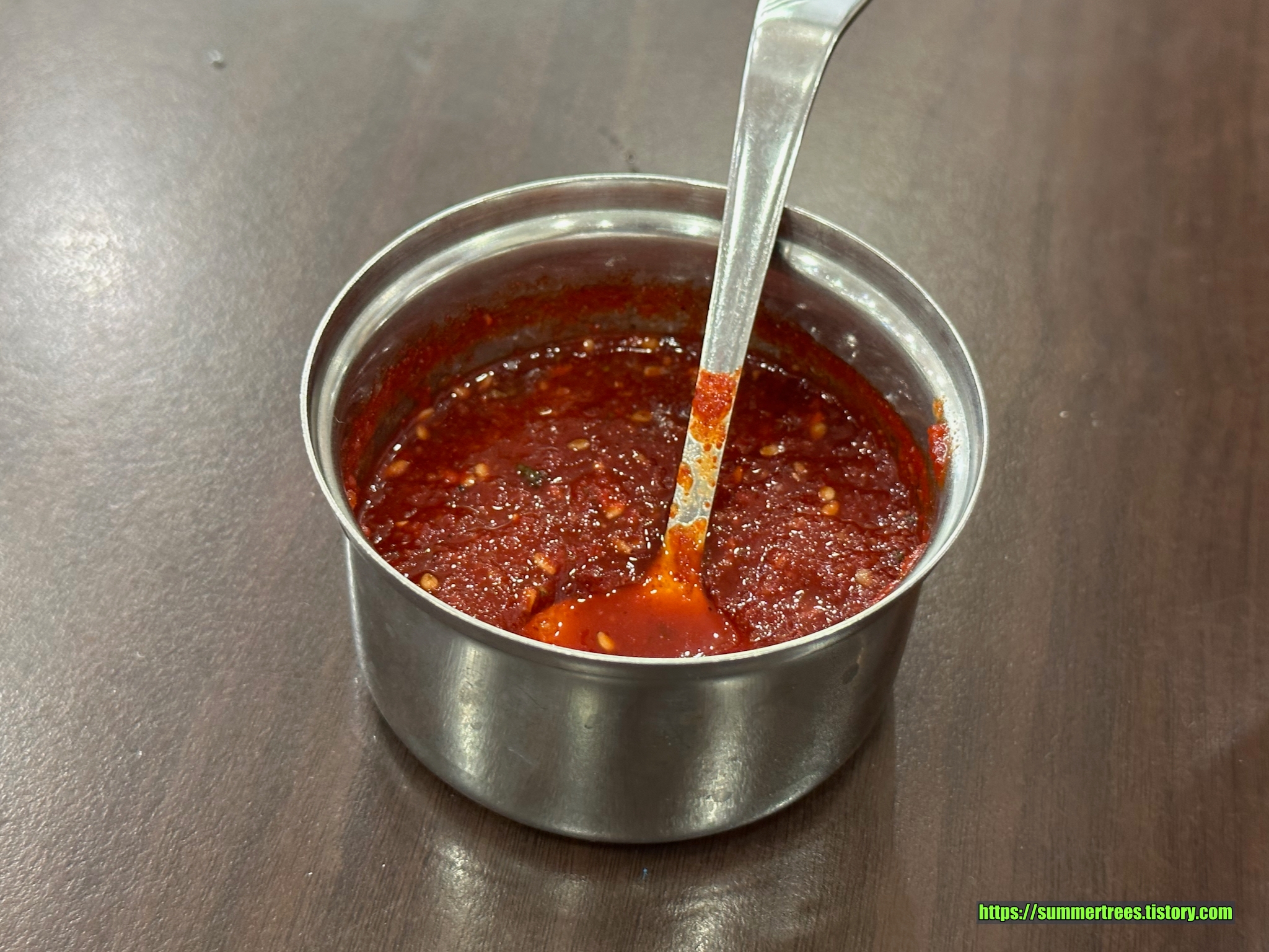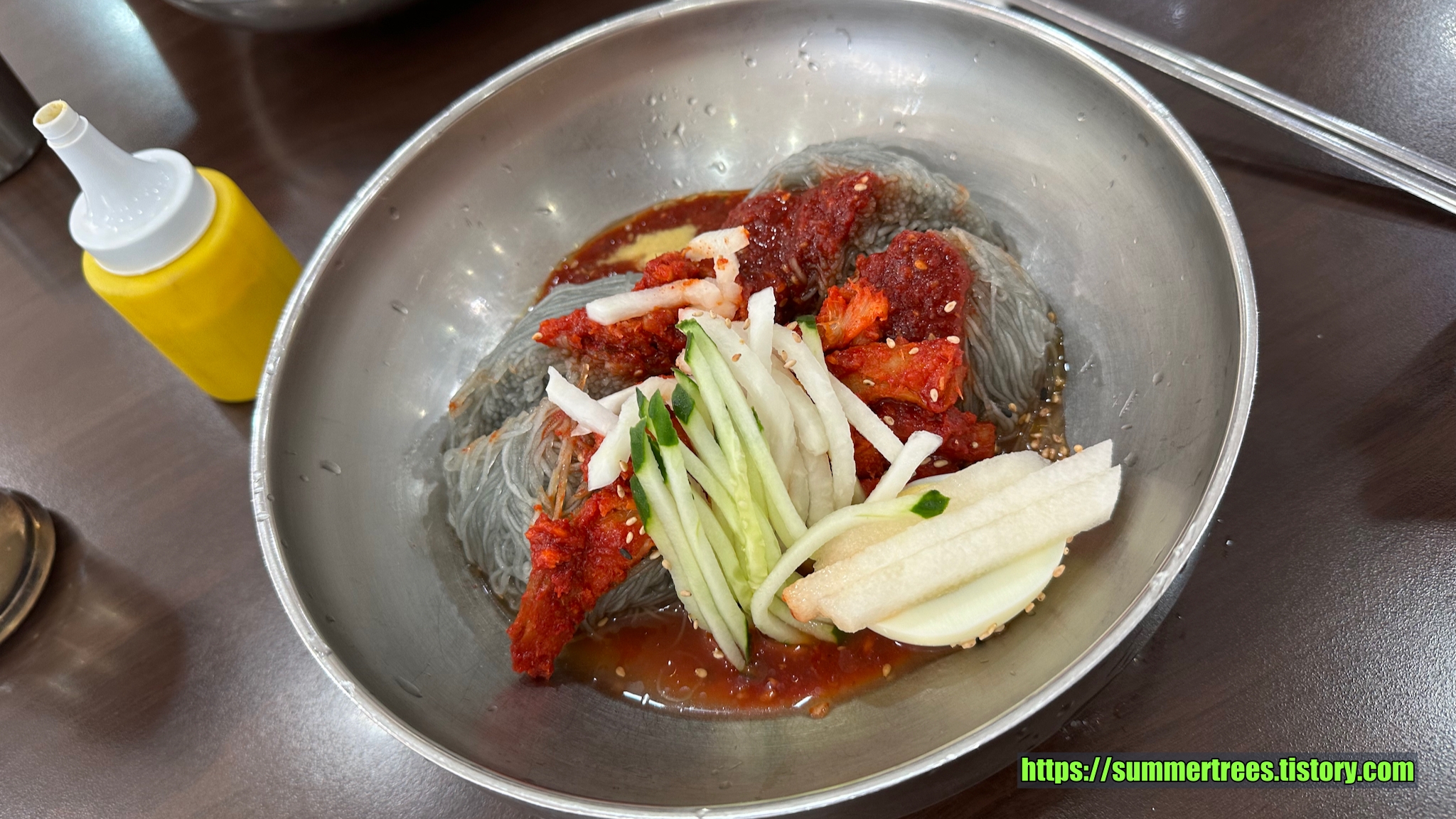 부산사람들은 아무래도 냉면보다는 밀면에 익숙해서 물냉면은 선호도가 약간 떨어질 듯 한데 다른 지역 사람들은 어떨 지 모르겠다. 물냉면 육수를 마셔보니 밀면보다 닝닝하게 느껴져서 같이 서빙되는 양념을 추가하니 밀면육수와 비슷해졌다.
