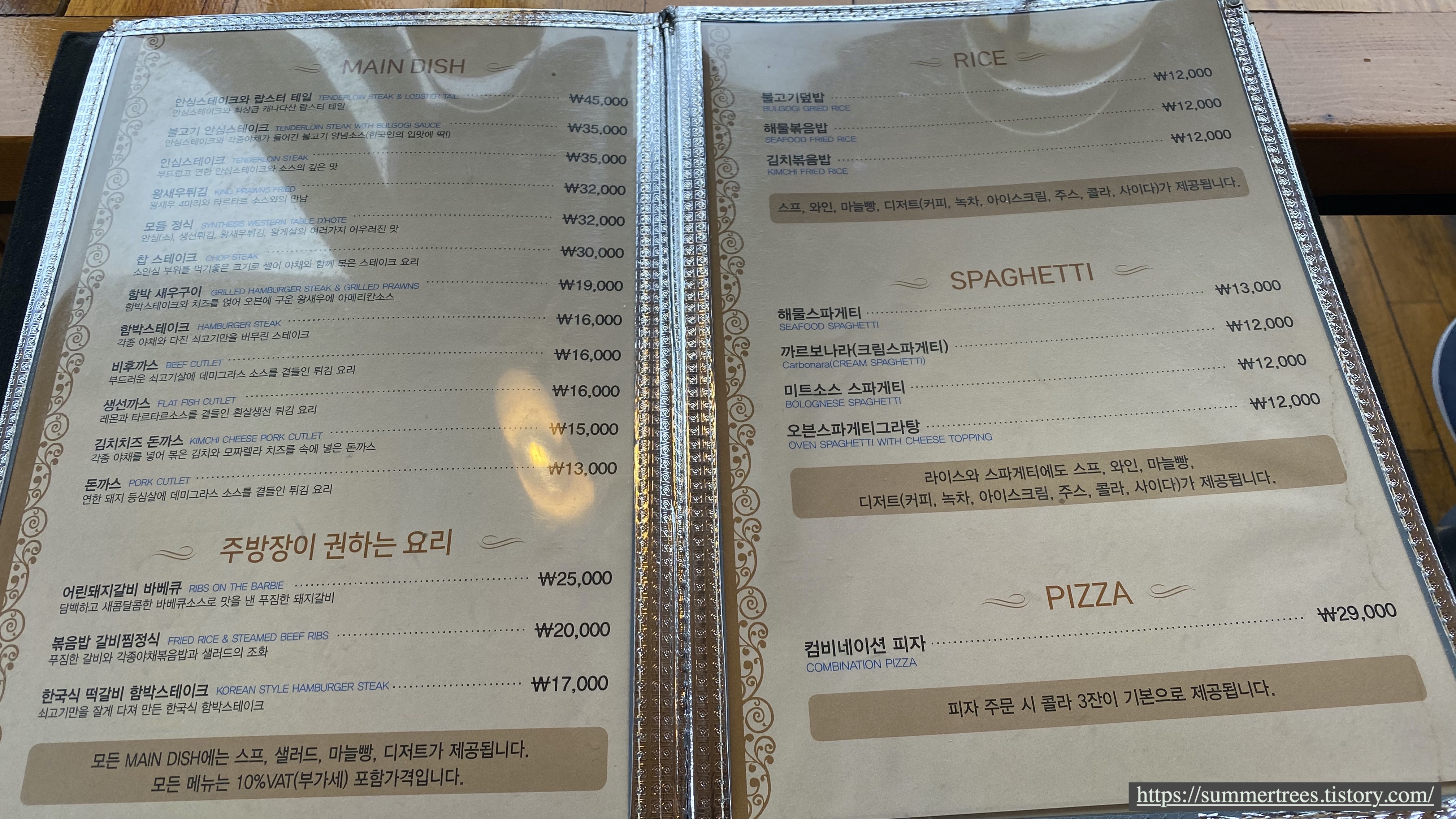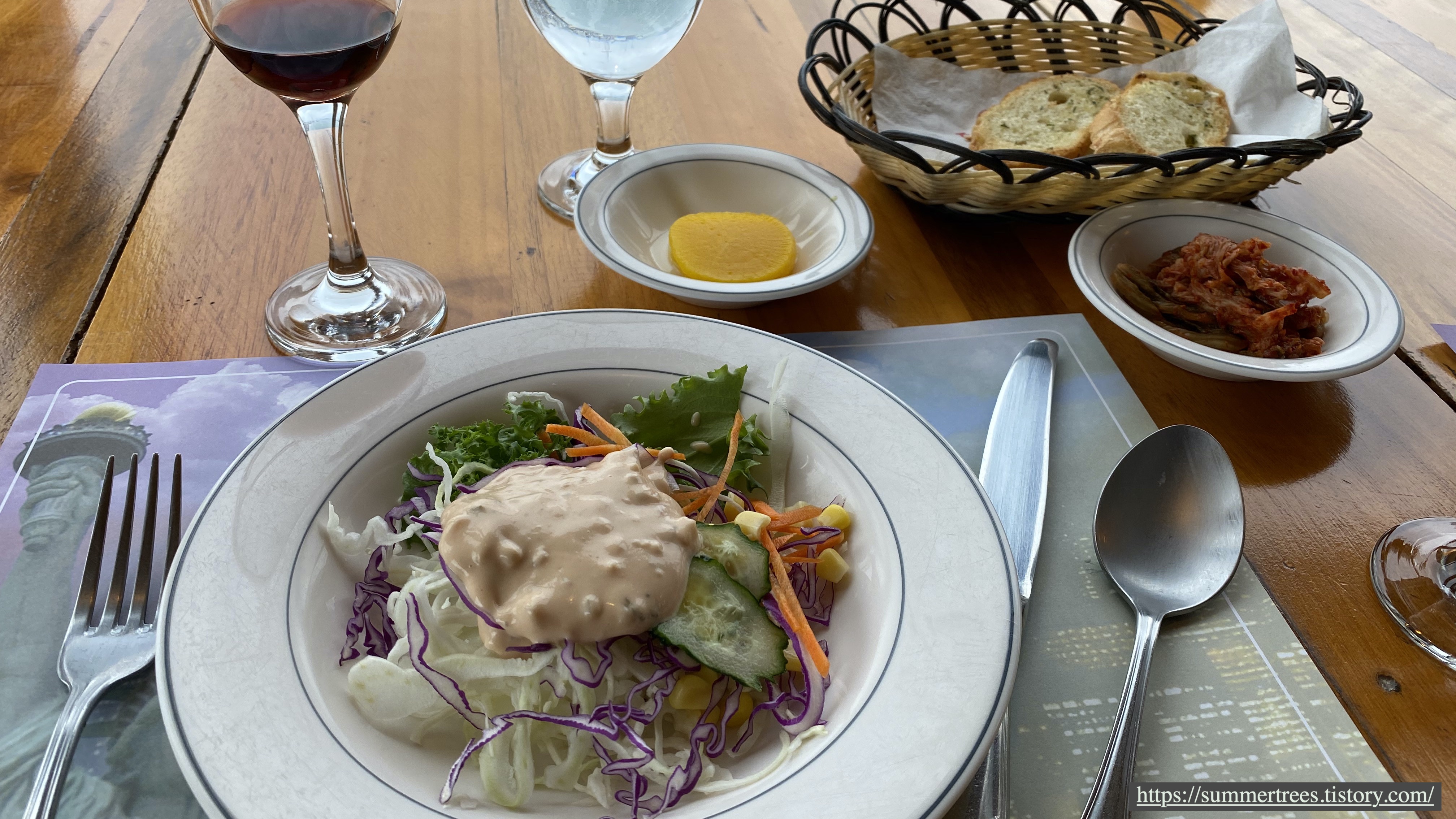 메인메뉴를 시키면 수프, 마늘빵, 와인, 디저트까지 즐길 수 있다.