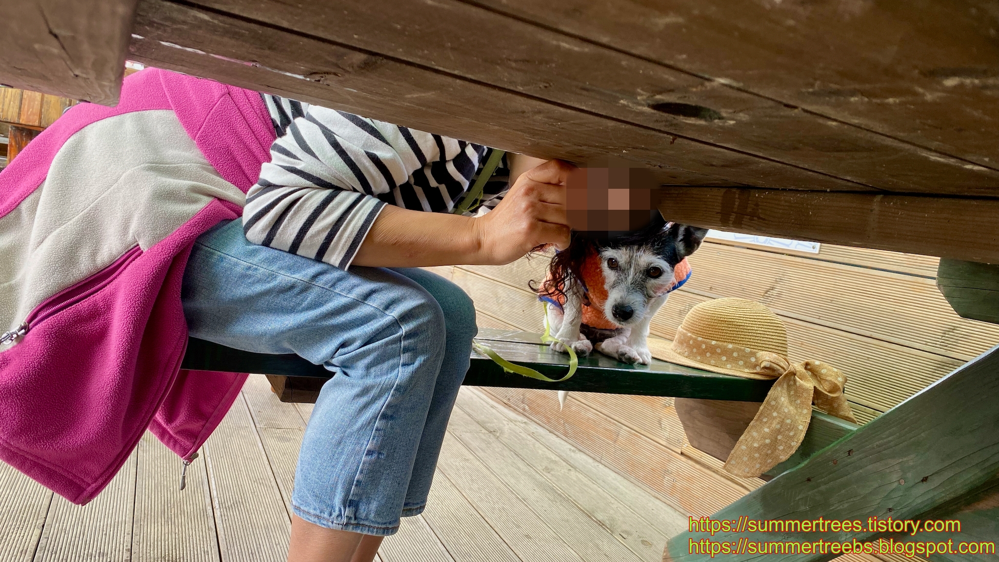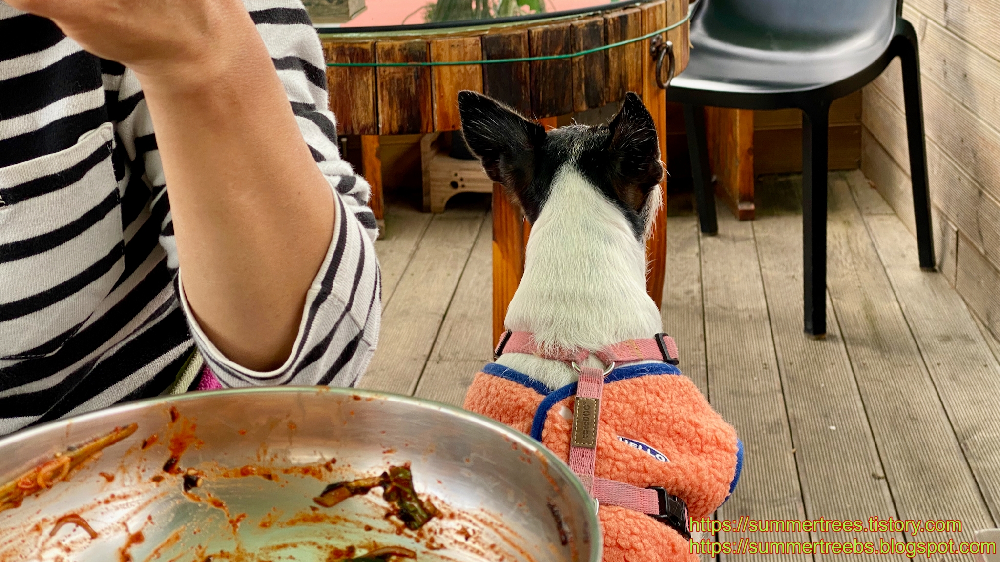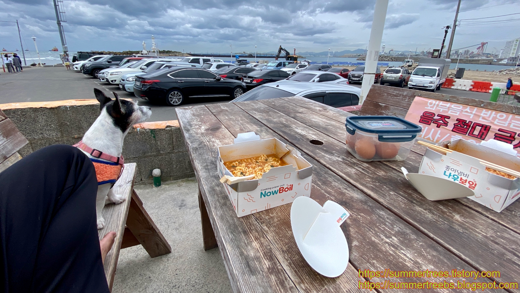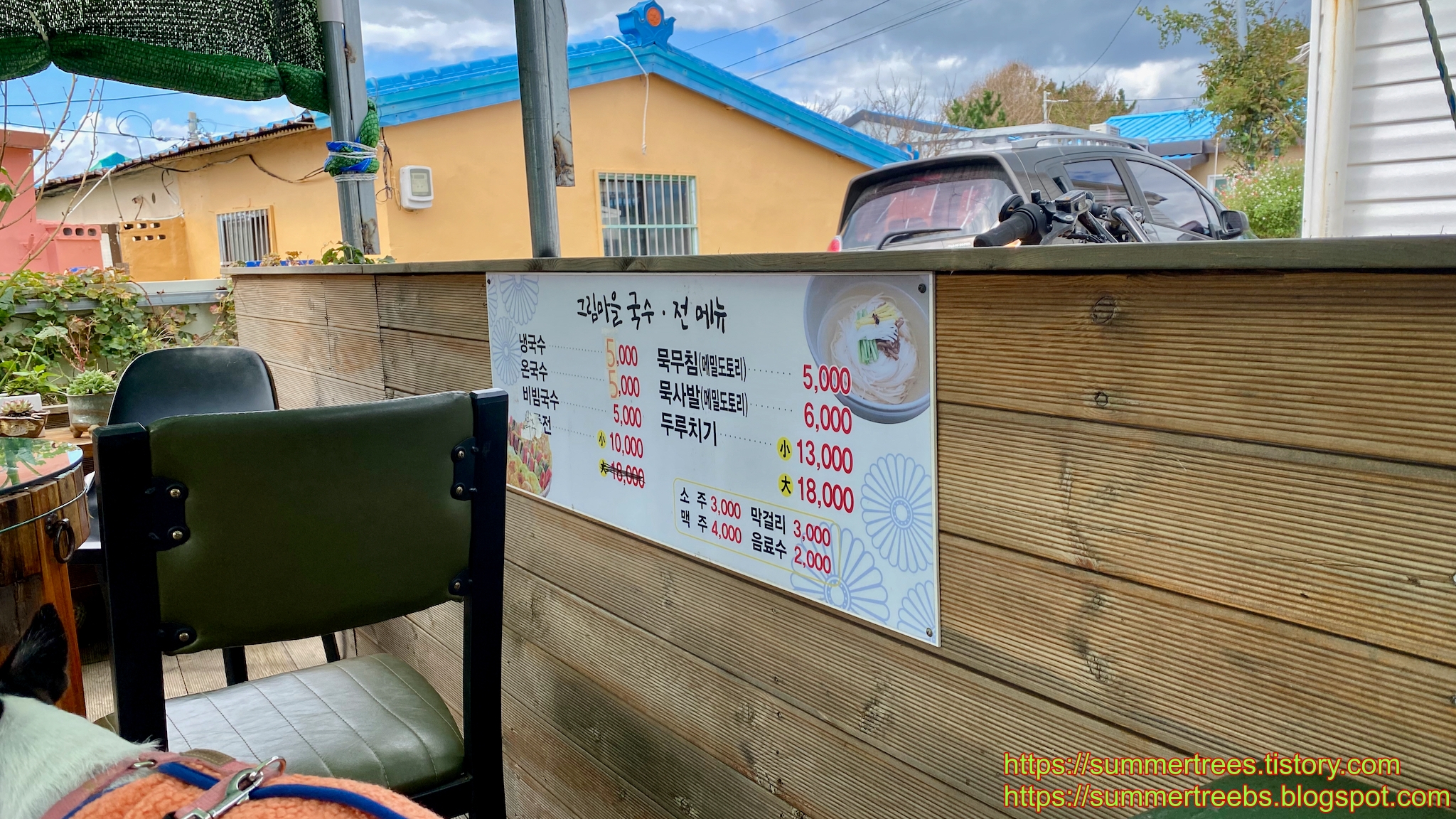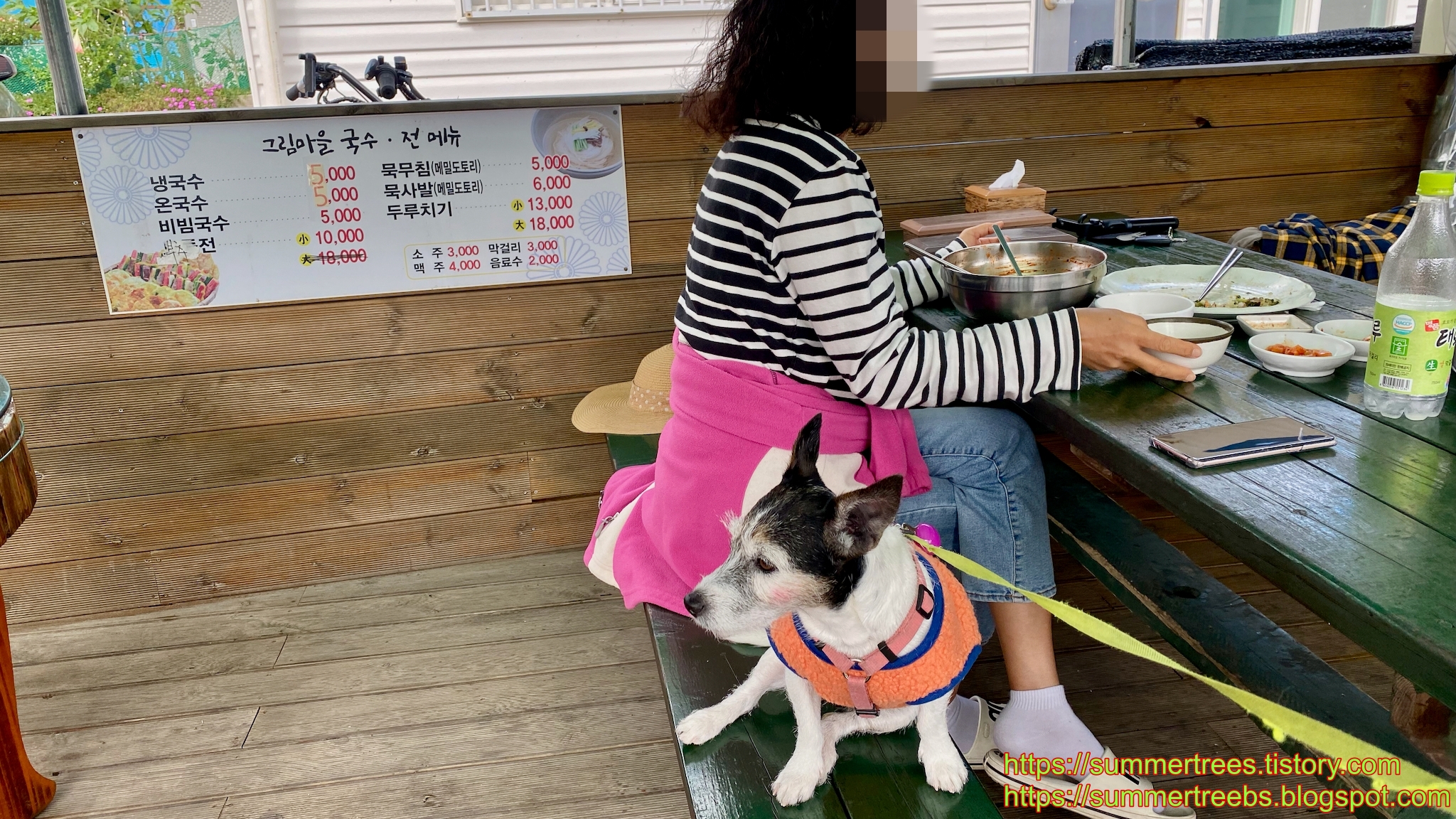 저녁 메뉴를 수제비 또는 칼국수로 정하고 마야랑 같이 야외테이블에서 먹을 수 있는 물금칼국수집을 갔는데, 우리처럼 강아지와 함께 온 사람들이 먼저 자리를 차지 하고 있었다.