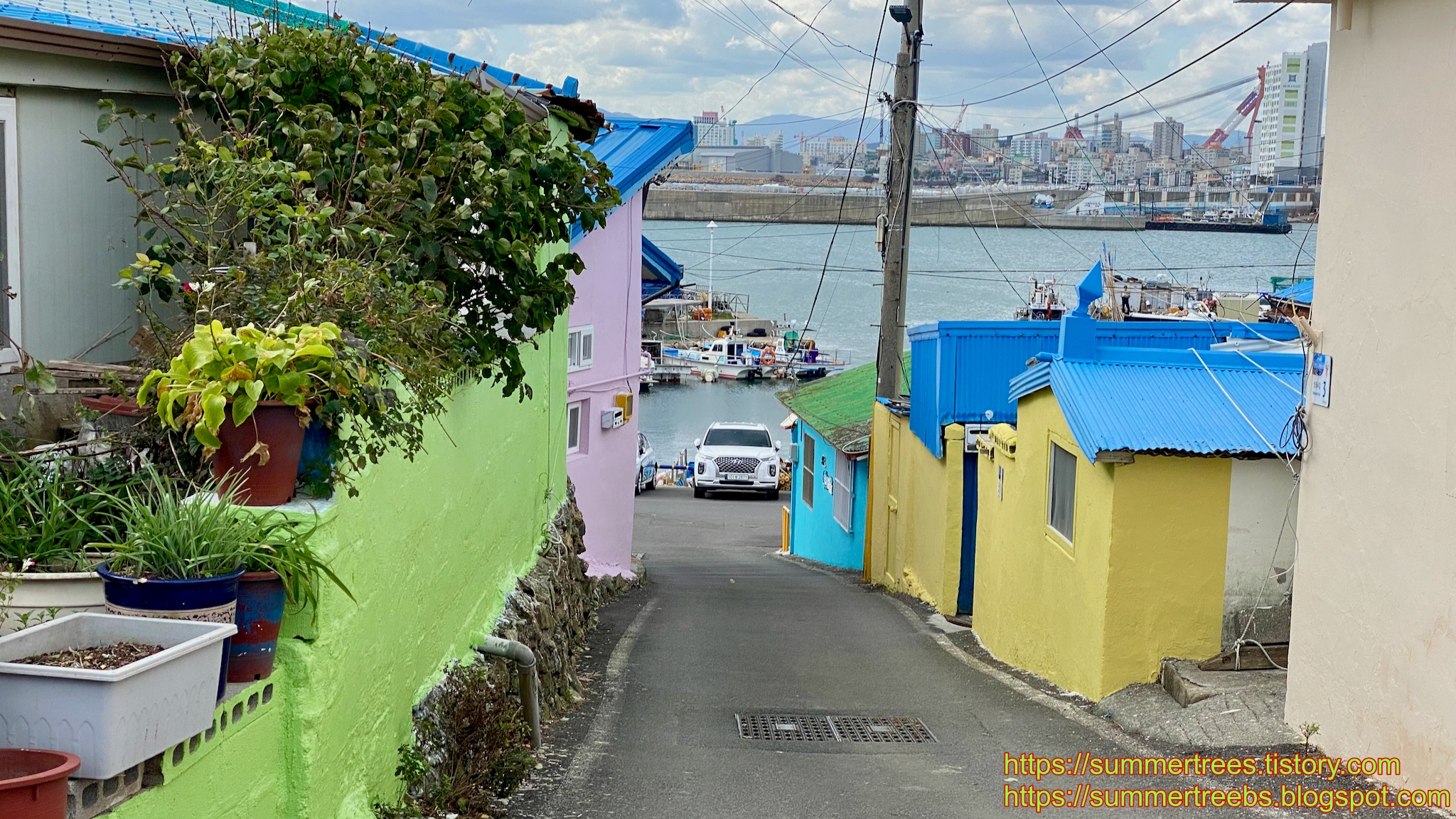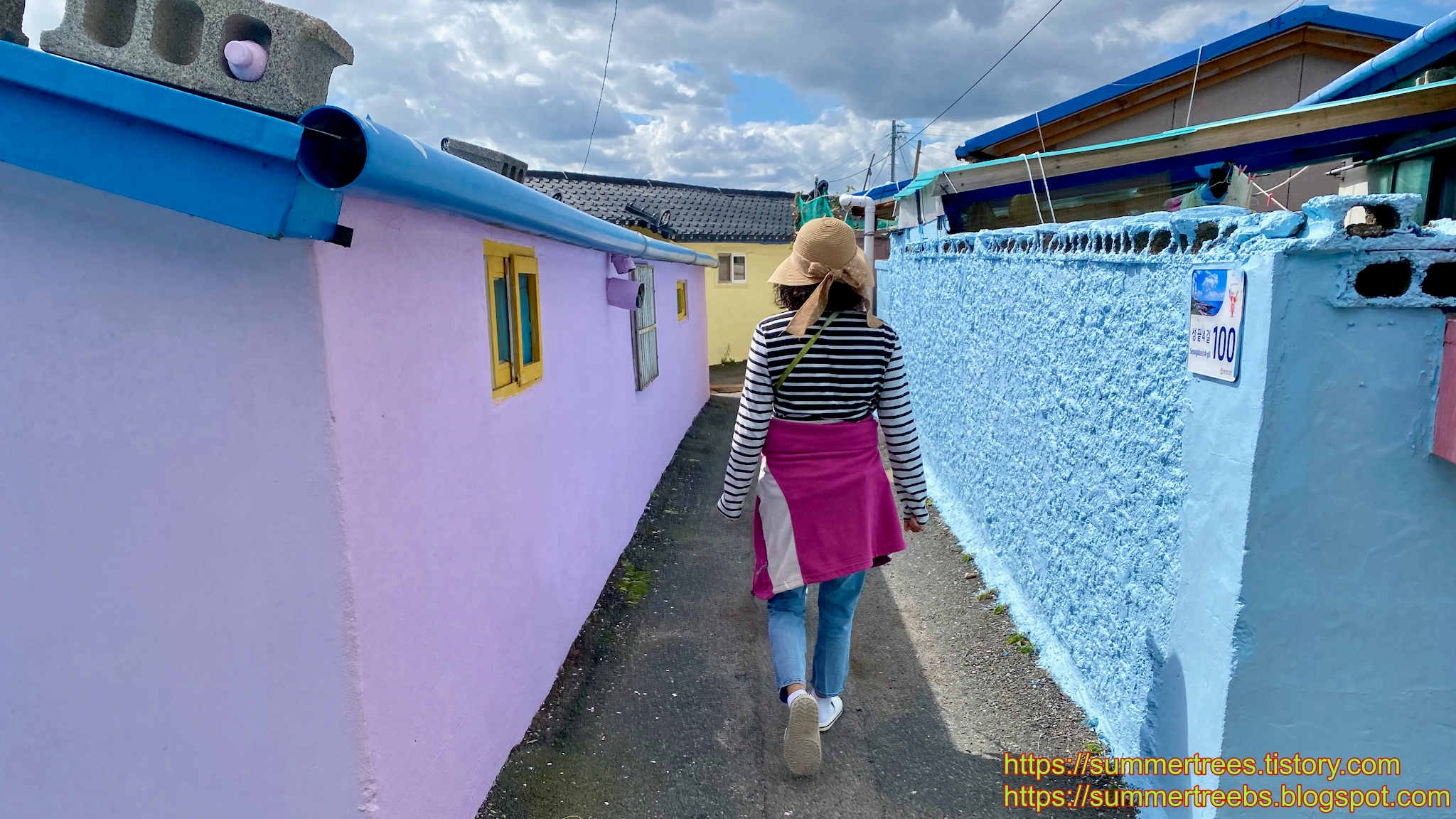 마을 골목이 파스텔톤으로 색칠되어 아기자기하다