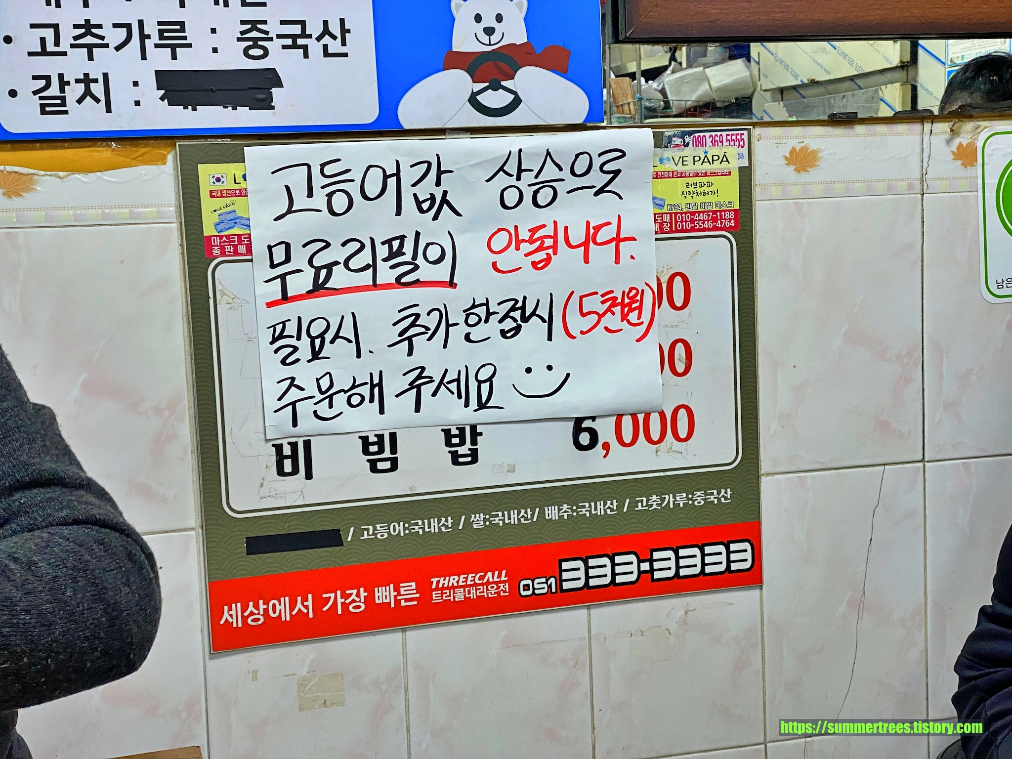 최근에 가보니 물가 급등 때문에 아쉬운 점이 생겼는데, 예전에는 고등어 굽는 시간이 오래 걸리고 손님이 몰리면 대충 몇 점 가져다주고 모자라면 보충해주는 식이었는데 이제는 추가 주문은 5000원을 더 받는다고 한다.