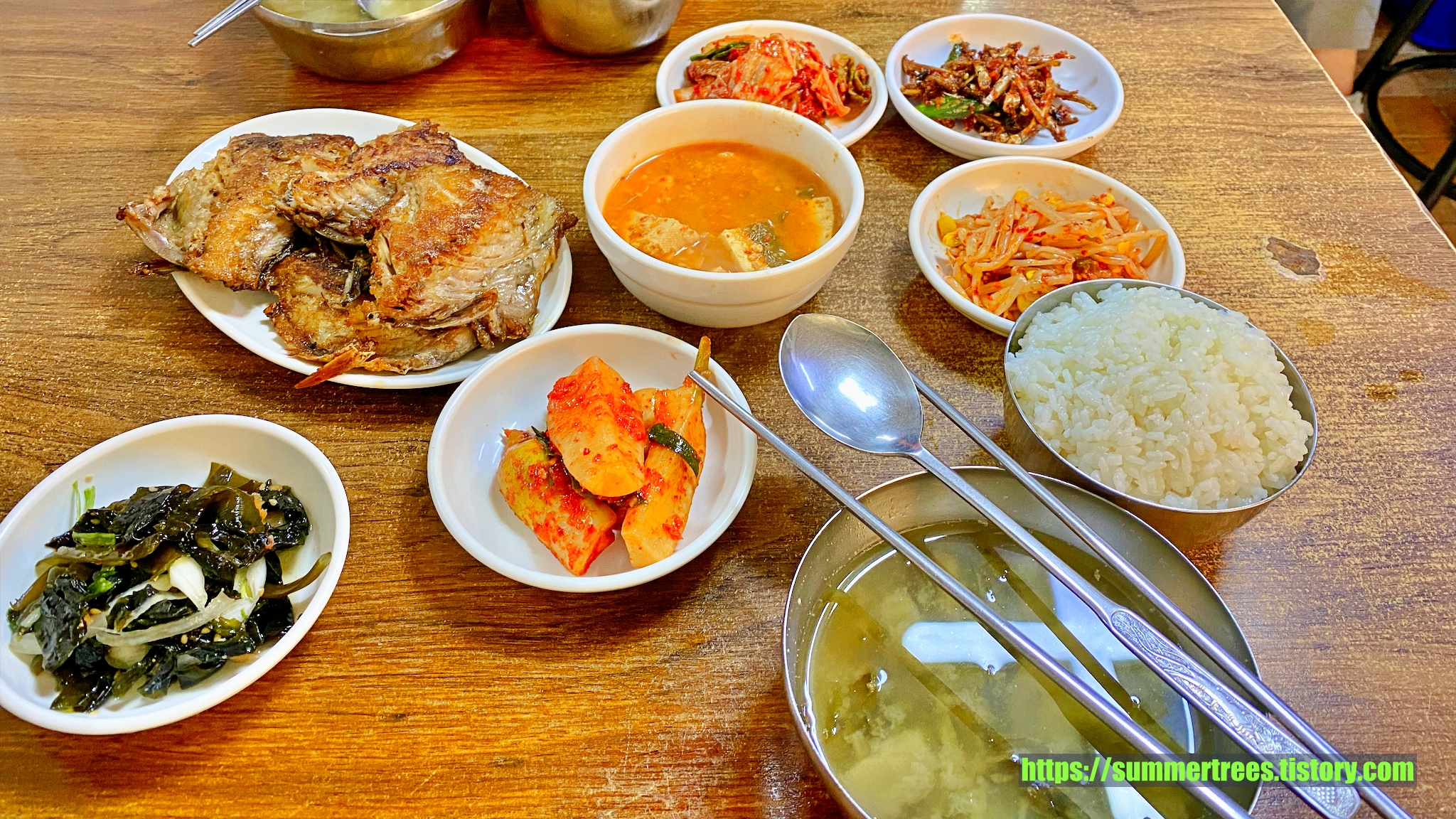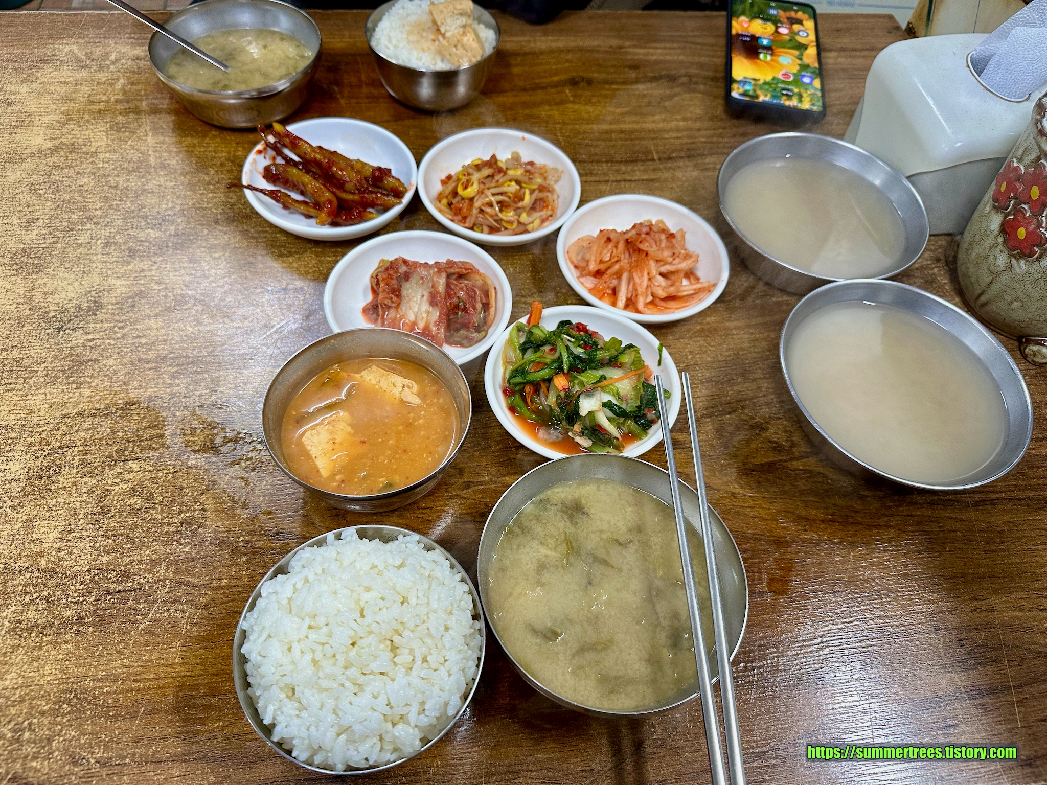밑반찬은 갈 때마다 다른데 기본적으로 양념이 맛있고 특히 된장찌개와 콩나물, 그리고 미역무침이 맛있다.