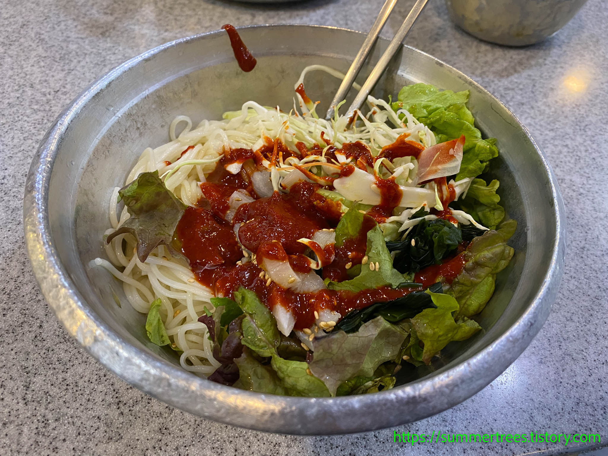 비빔장은 순한 맛과 매운 맛 두 종류를 내어주는데, 매운 맛은 한 숫갈만 넣고 순한 맛을 듬뿍 넣고 비비면 딱 알맞다.
