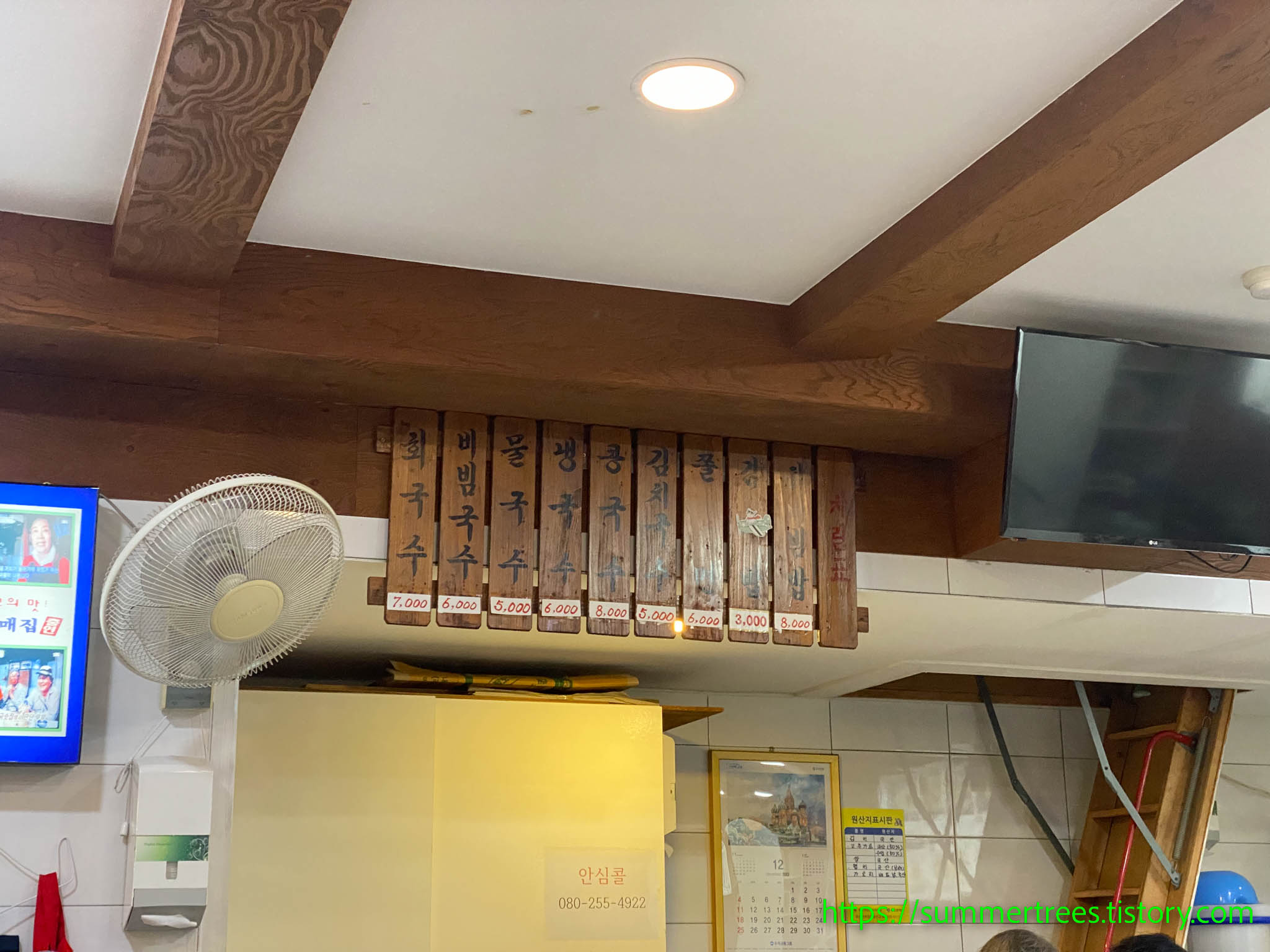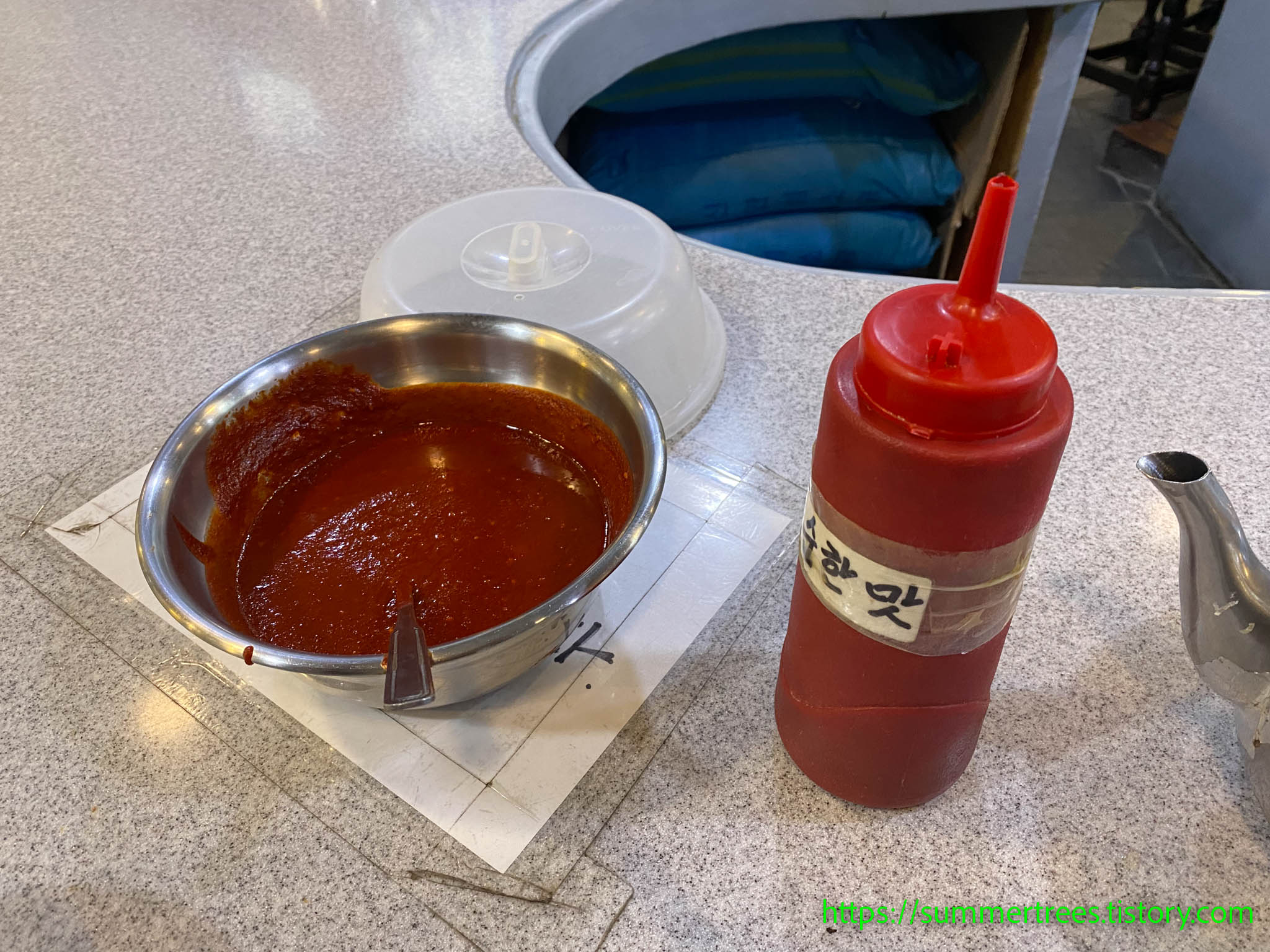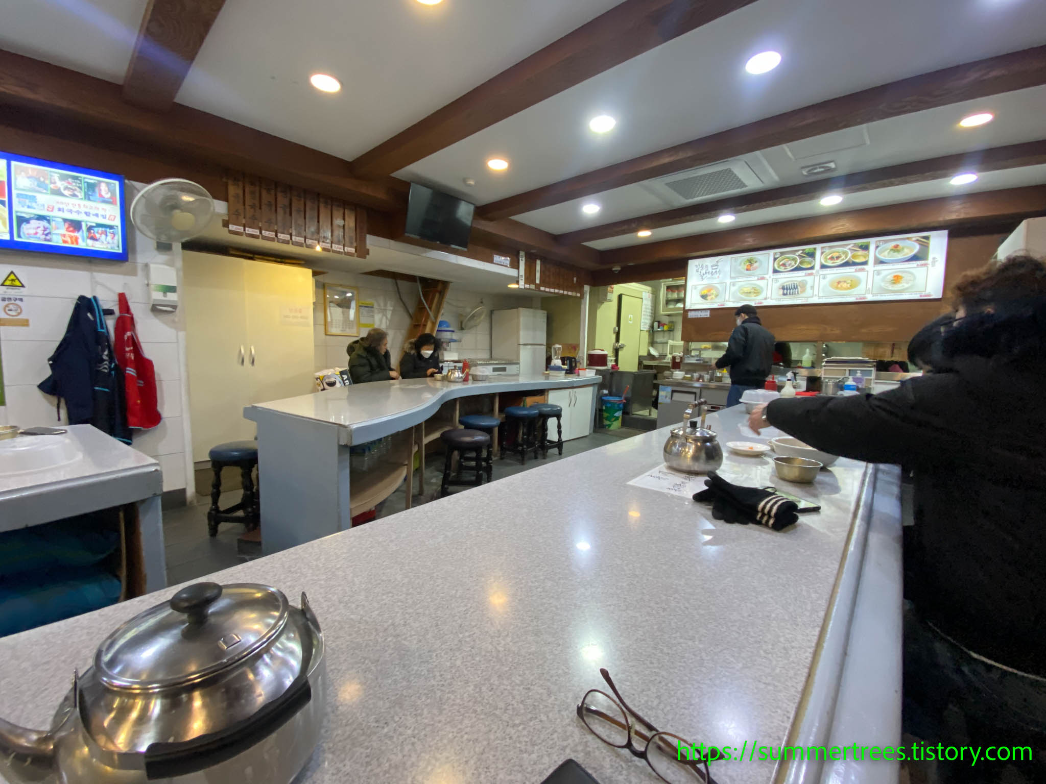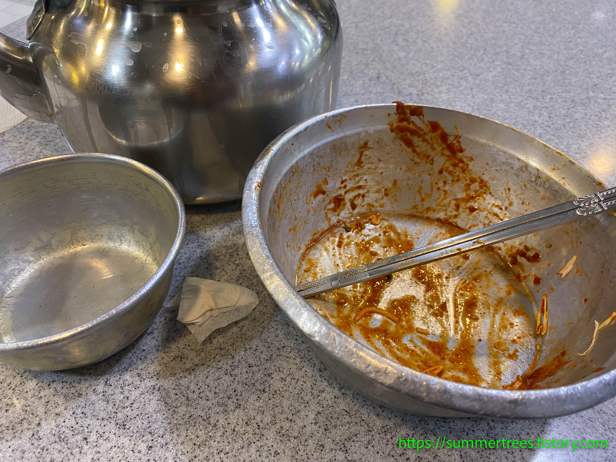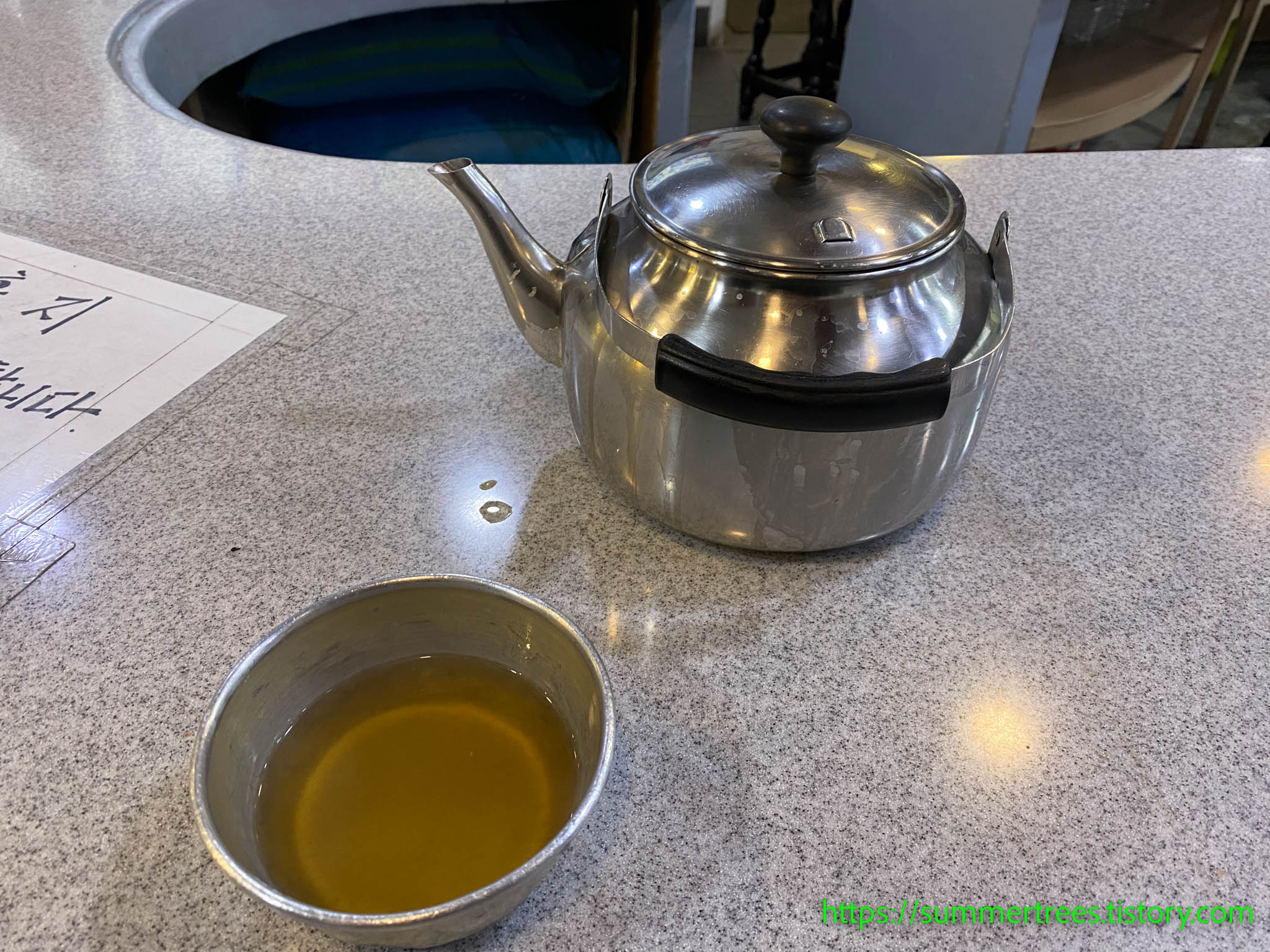 앉아서 주문을 하면 멸치육수를 주전자로 내어오는데, 그걸 마시며 국수를 기다린다.