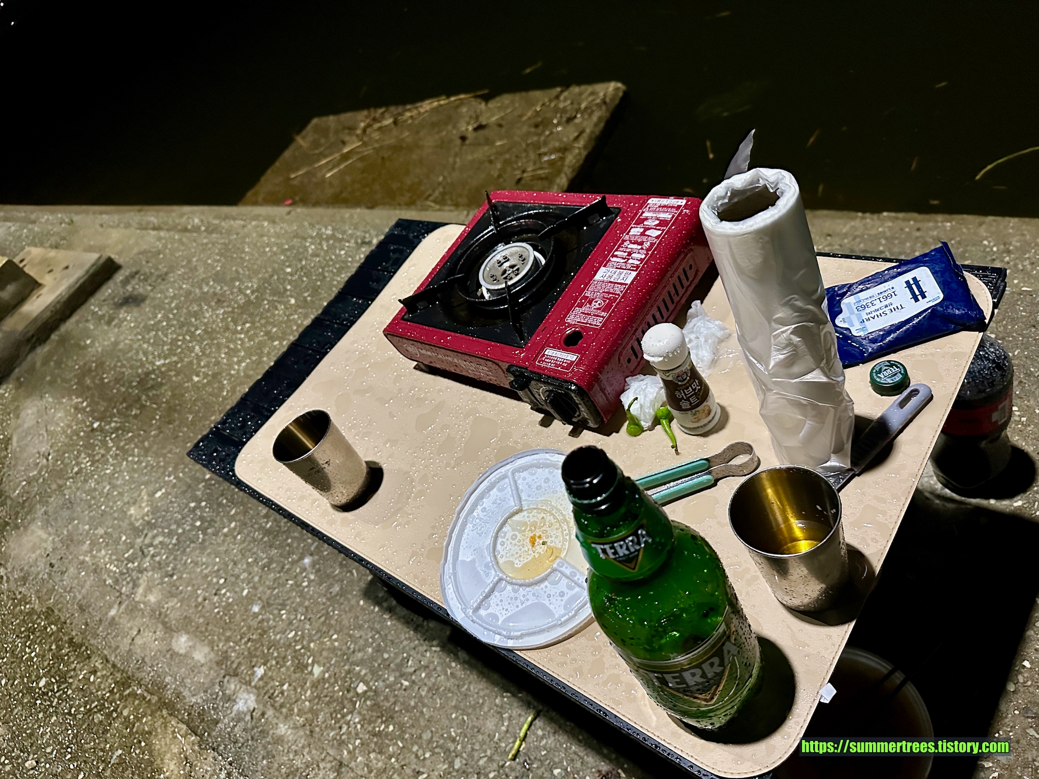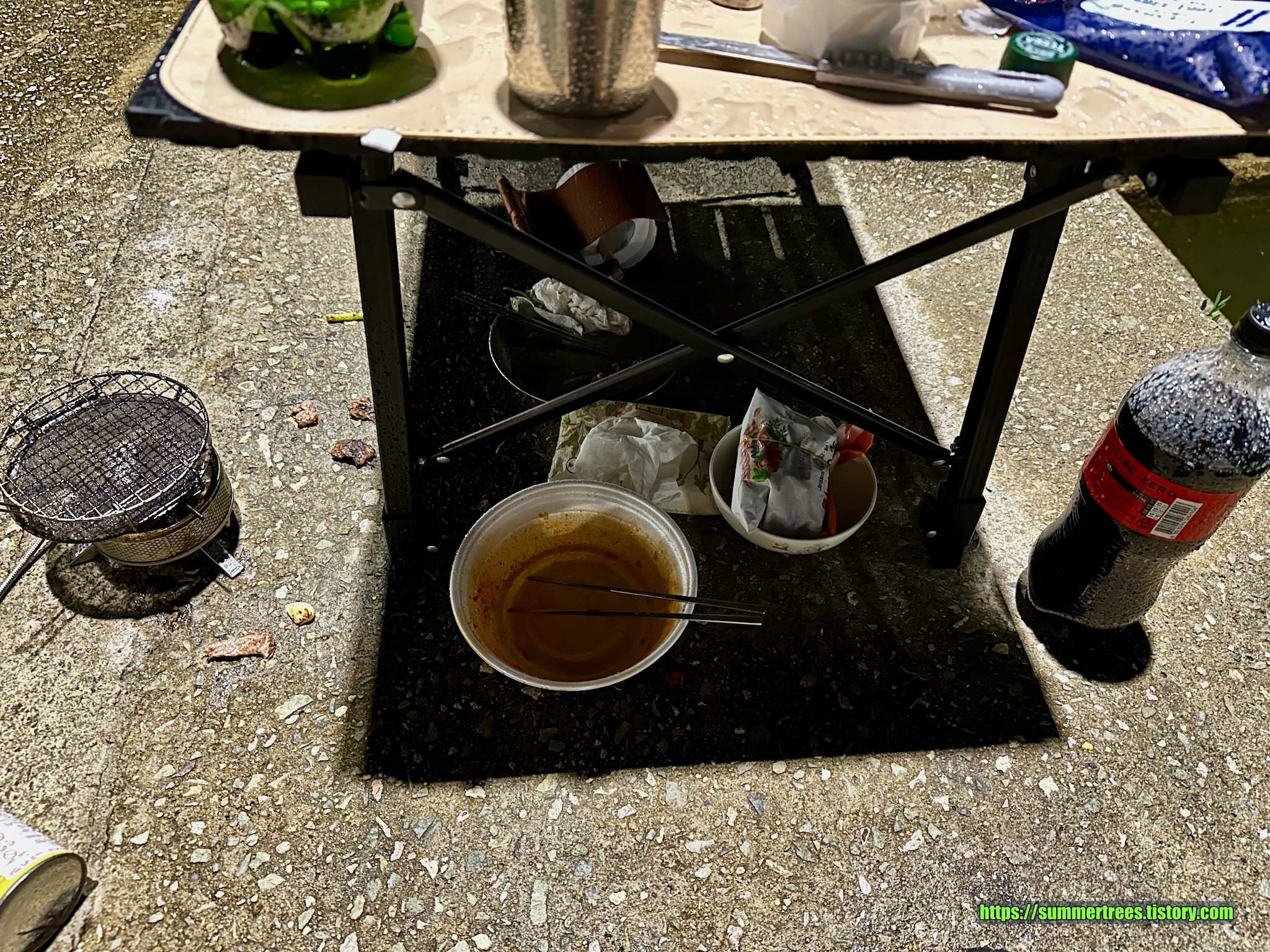 갑자기 비가 와서 철수를 했는데, 고기를 다 구워 먹고 컵라면을 먹을 때라 다행이었다.