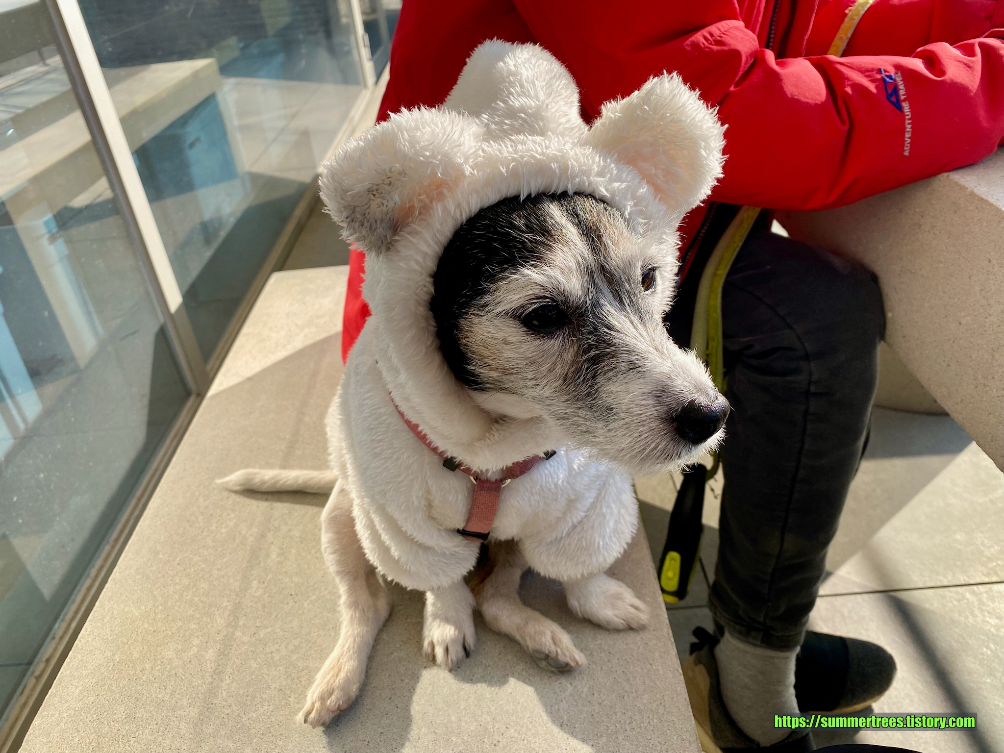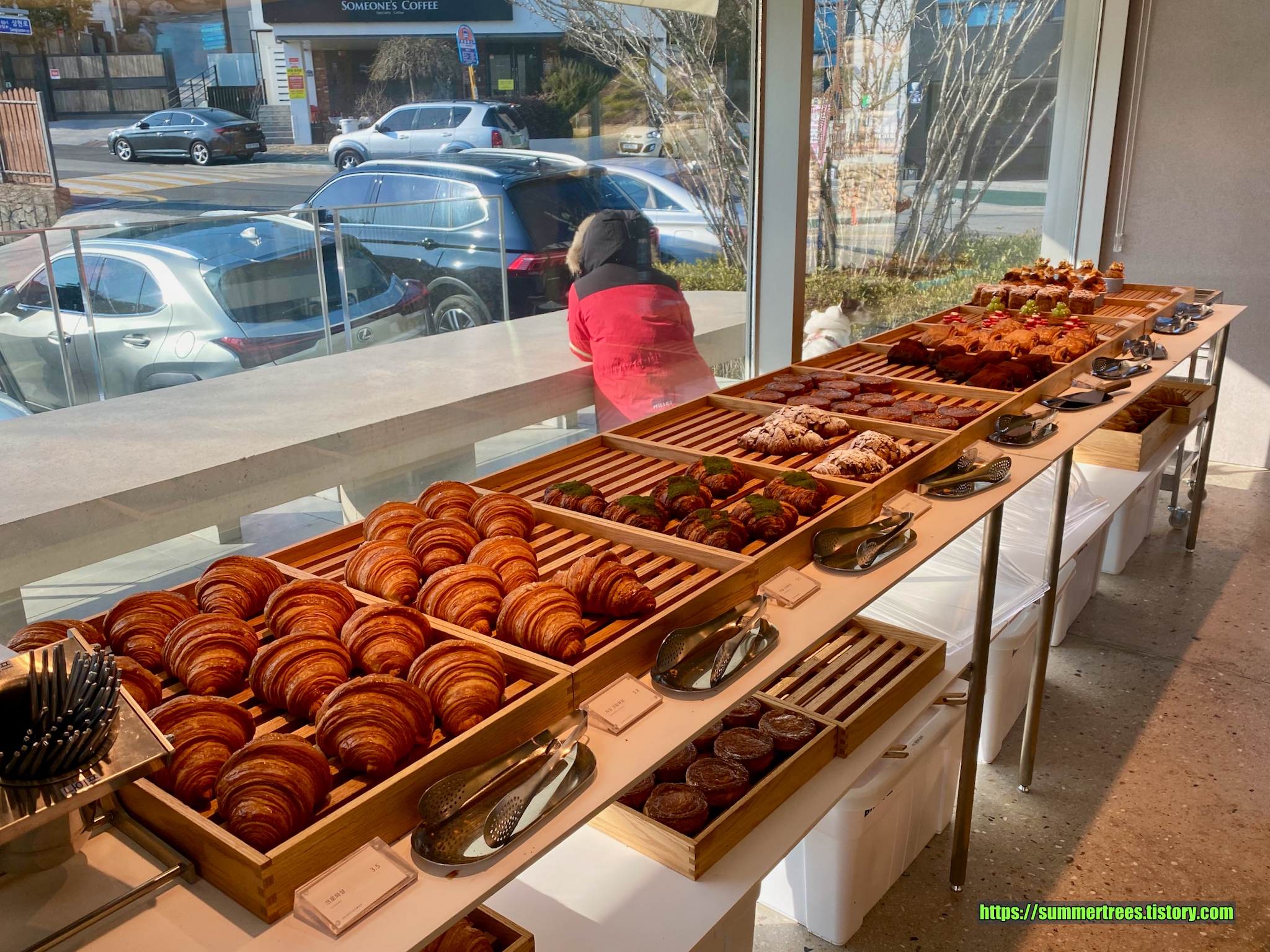 물론 테이블 위치는 좋지 않다. 주차장과 건물 중간에 길다란 석재테이블과 의자를 만들어 놓았을 뿐이다. 우리는 겨울에 간 터라 덜덜 떨면서 먹어야 했다. 여름엔 햇빛가리개를 해주나 모르겠는데 방향으로 봐서 오전에는 괜찮괬지만 오후에는 햇빛을 피할 수 없을 듯 하다. 강아지랑 다니는 사람들에겐 이것도 감지덕지이긴 하지만... 강아지 있는 사람들은 테이크아웃으로 아래쪽 공원 조금만 걸어가면 되니까 거기 가서 즐기는 게 낫겠다.