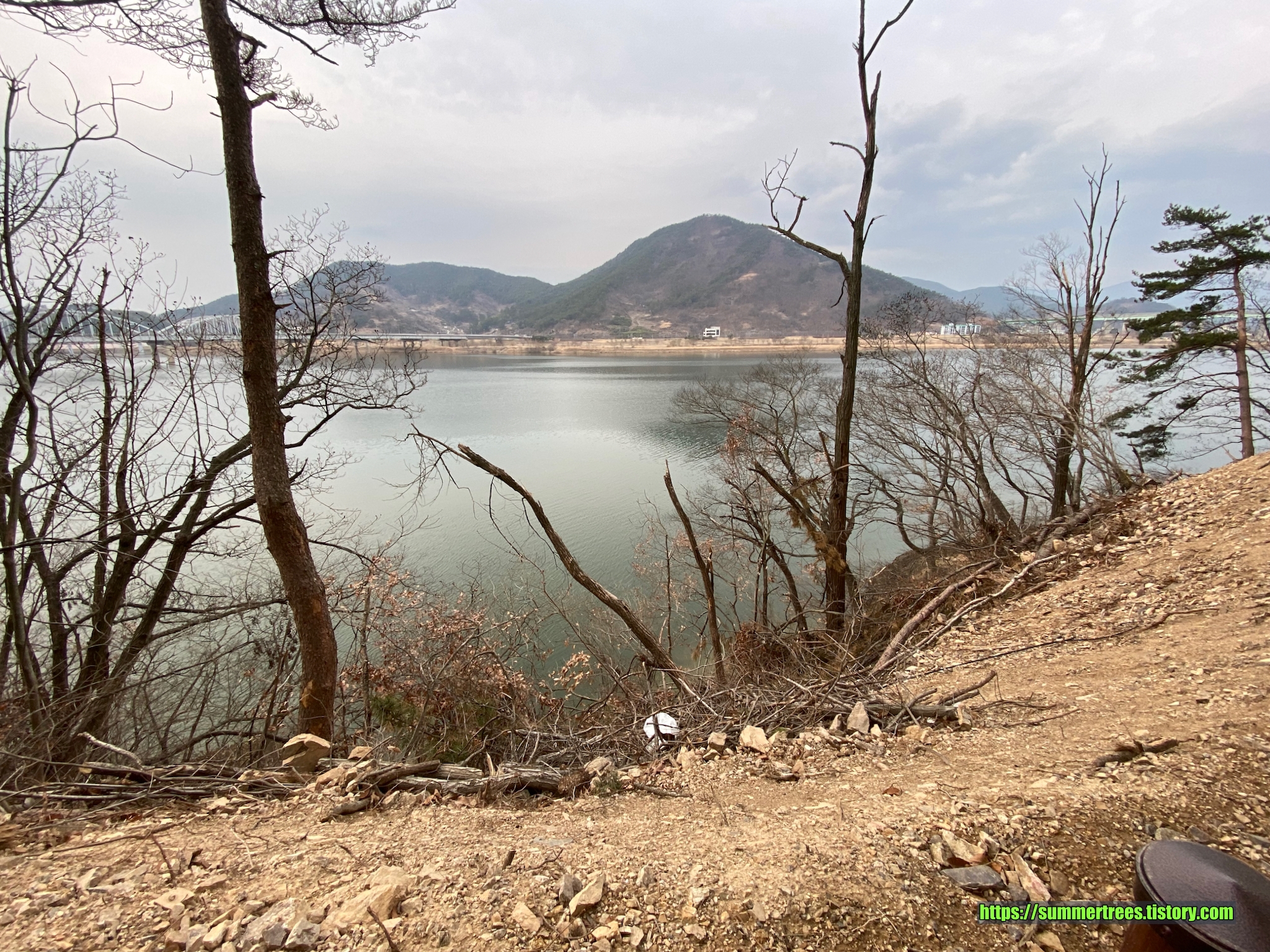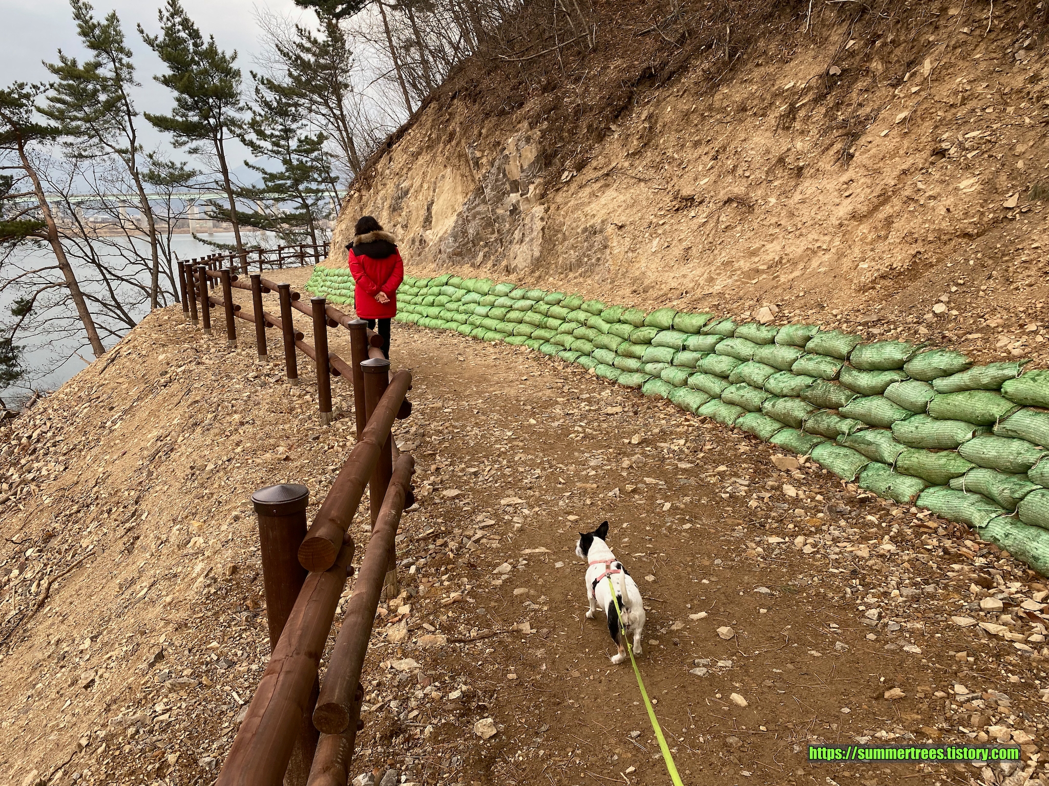 여기서 마을 방향으로 가 보면 강변쪽에 산책길이 있는데, 산기슭길을 새로 단장하는 듯 했다.