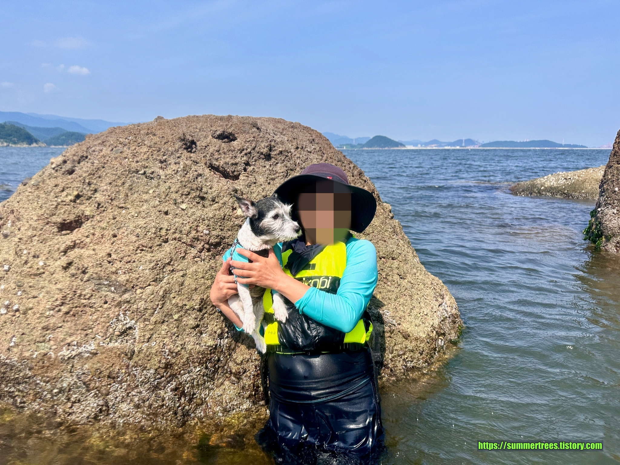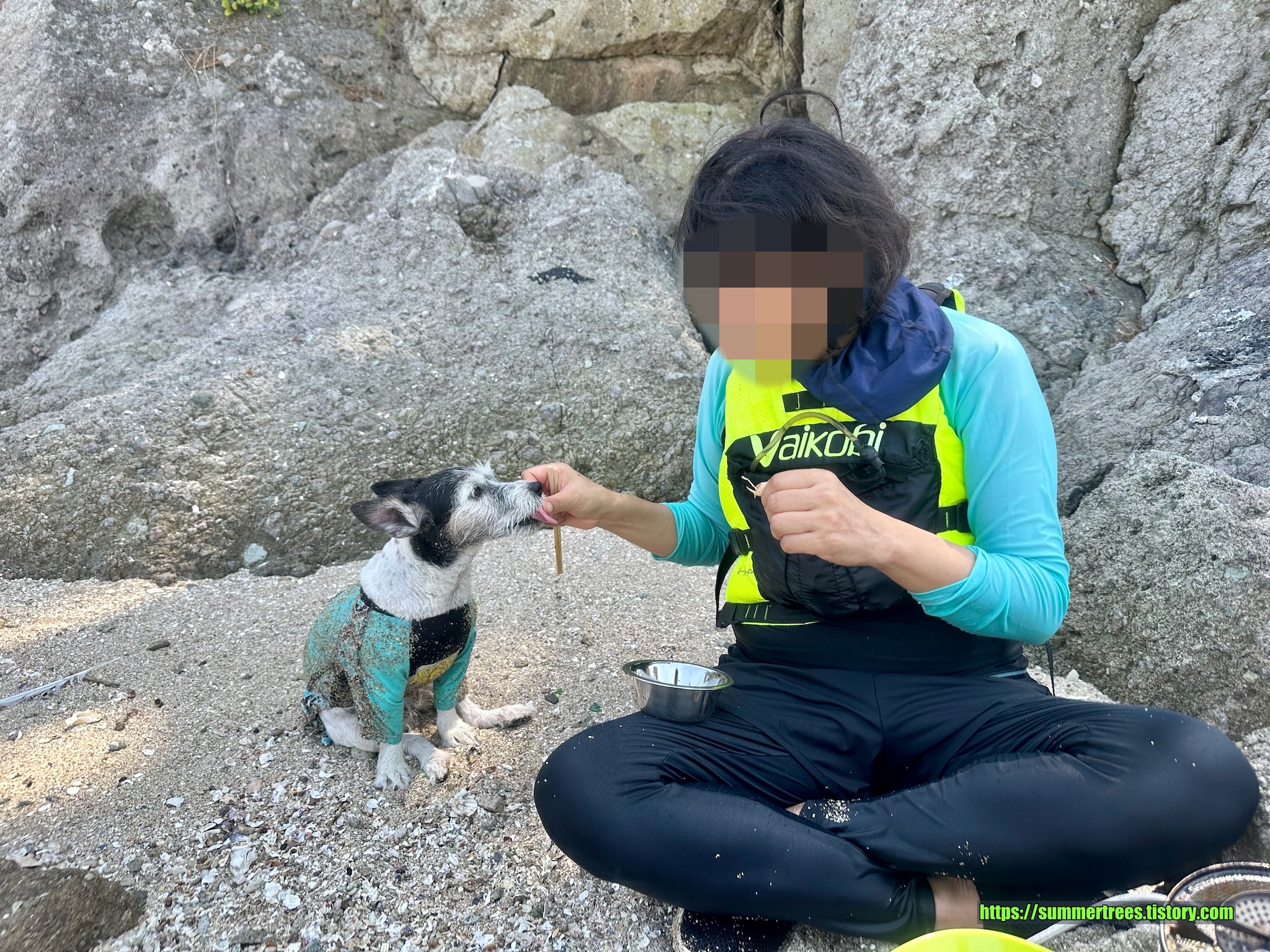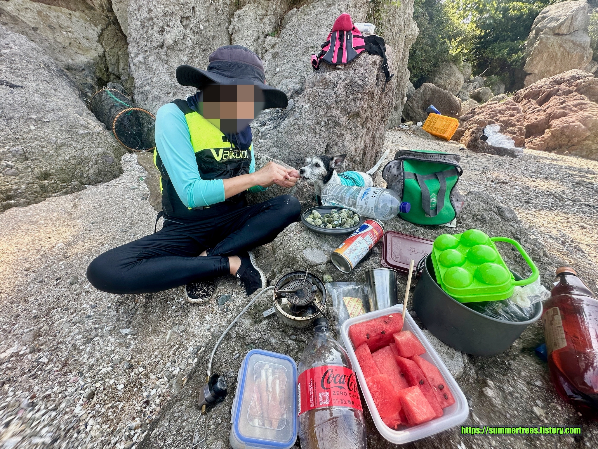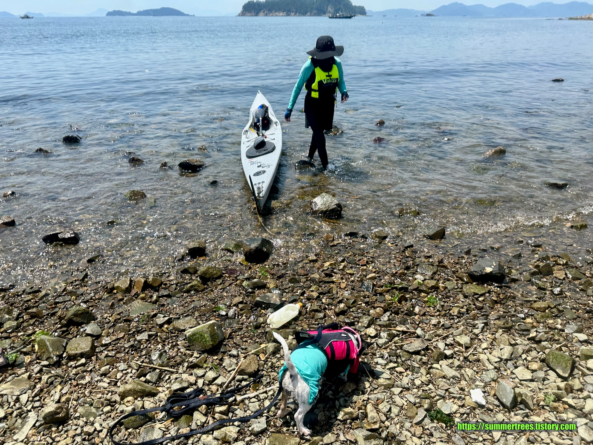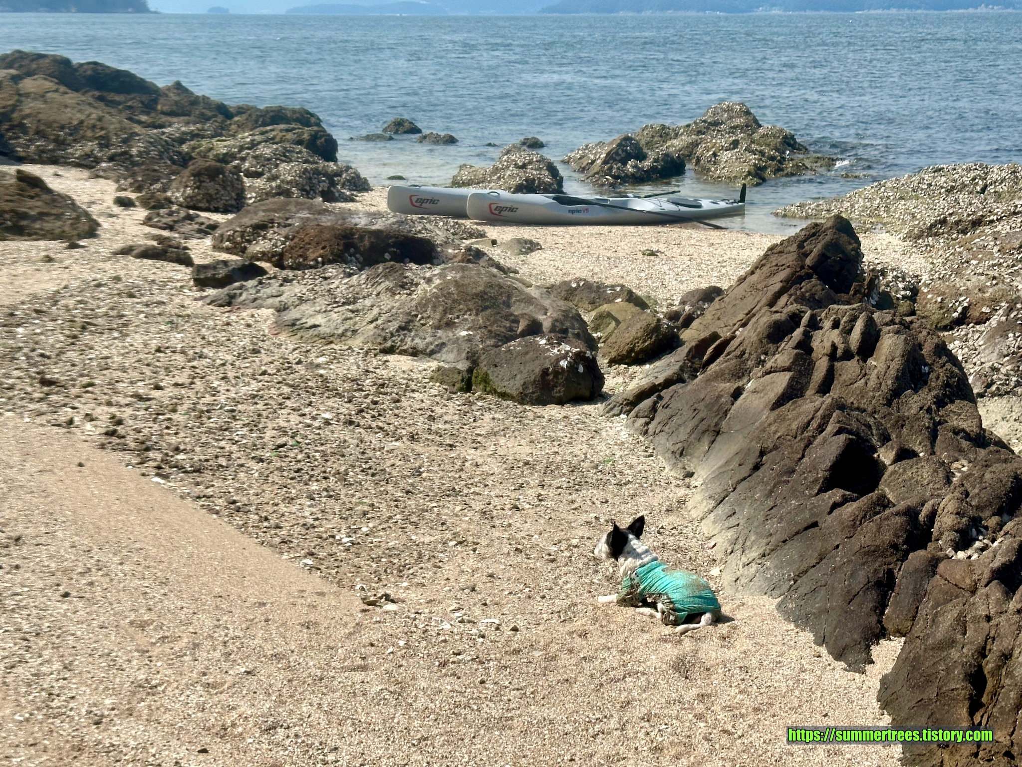 명동항을 출발 후 소쿠리섬까지 가서 소쿠리섬 소쿠리랑 인사. 소쿠리는 물에 트라우마가 있어 수영을 싫어한댄다.