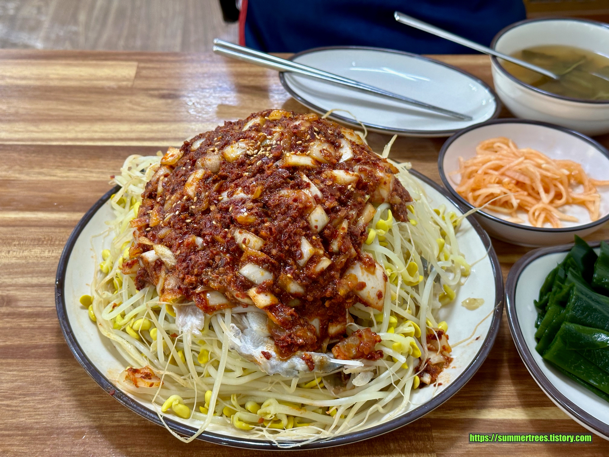 처음부터 양념과 재료들을 섞어서 먹는 사람도 있는데, 나는 개인적으로 나온 상태 그대로 콩나물과 대구를 끄집어내고 양념을 조금씩 얹어 먹는 것을 좋아한다. 양념이 약간 매운 편이라 나처럼 매운 음식에 약한 사람은 모두 비벼버리면 아주 맵게 느껴지기 때문이다.