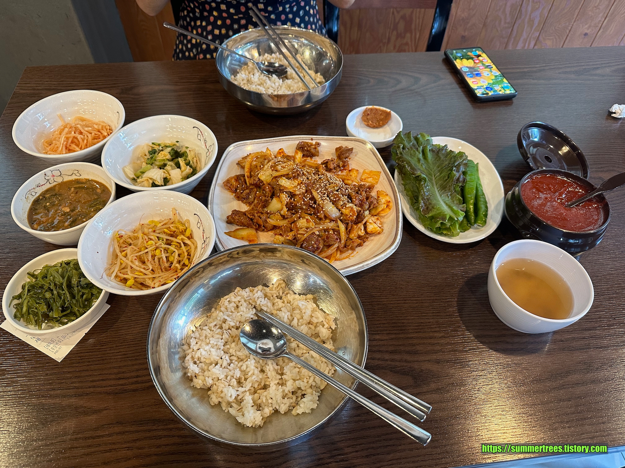 보리밥 가격은 싸지만 나물 외에 반찬으로 주는 것이 없다보니 부족해보여 사이드메뉴를 시킬 수 밖에 없는데, 제육볶음을 시키니 싼 가격은 아니게 됐다. 따로 시키는 메뉴라 양이 많아서 다 먹기가 힘들었다. 메뉴구성이 좀 더 조화로우면 했다.