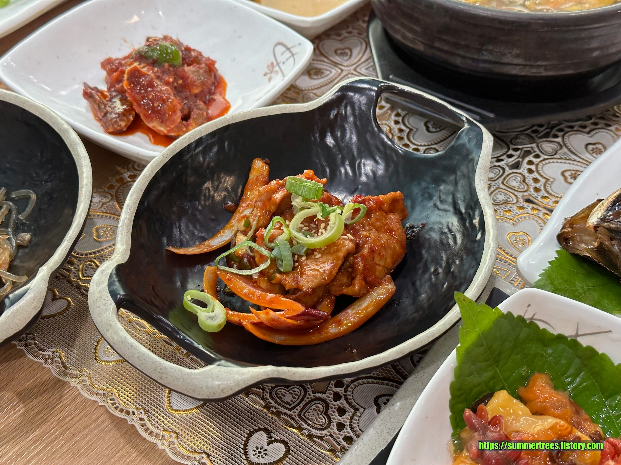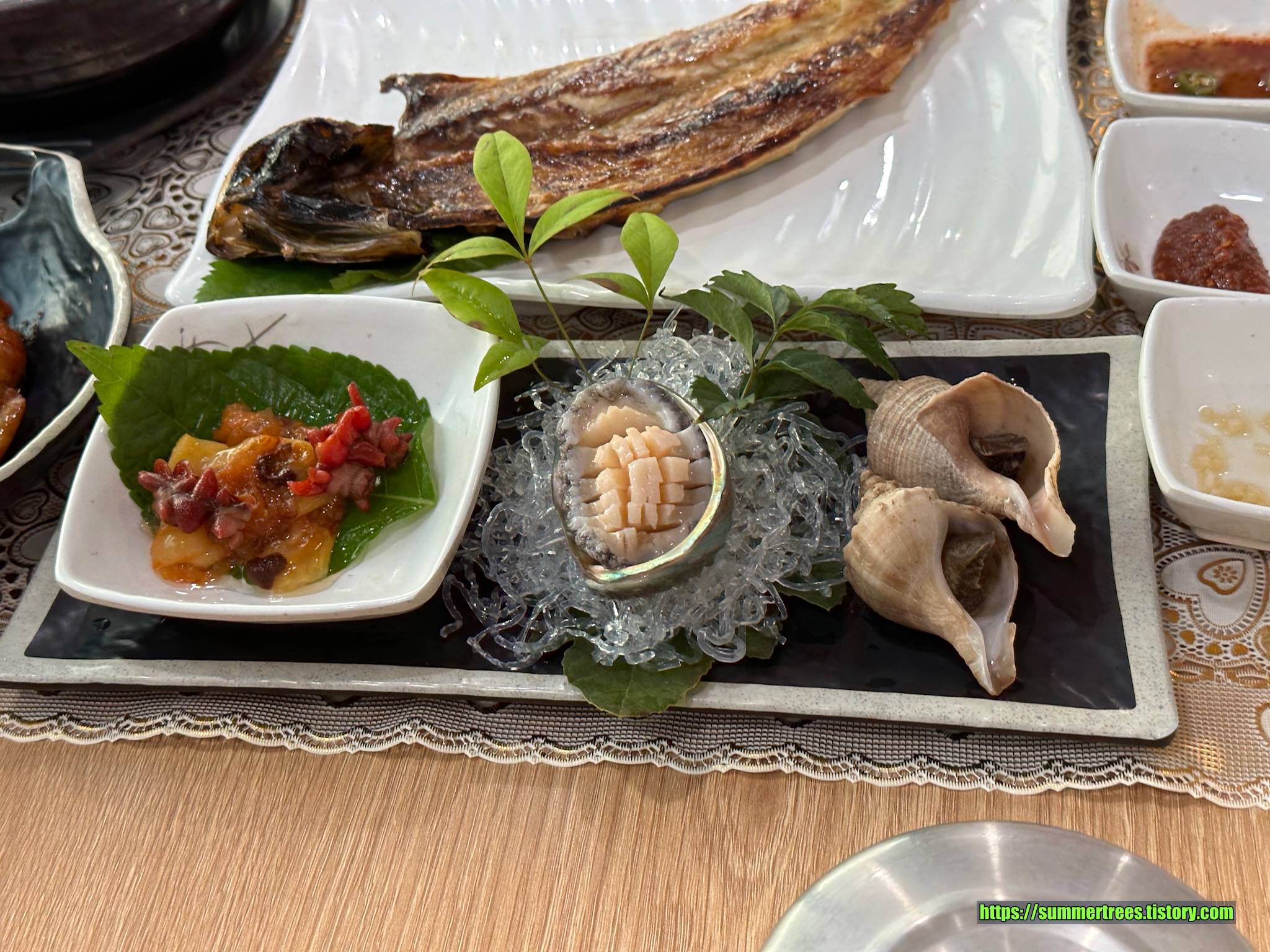 수육과 돼지두루치기, 그리고 해산물 - 멍게, 전복, 소라 - 등 다양한 재료가 나와 좋다.