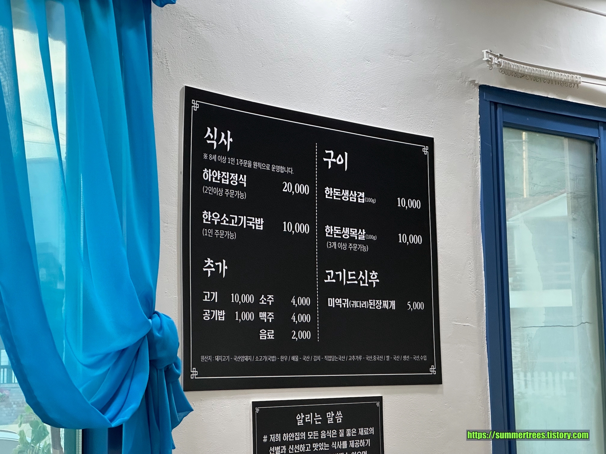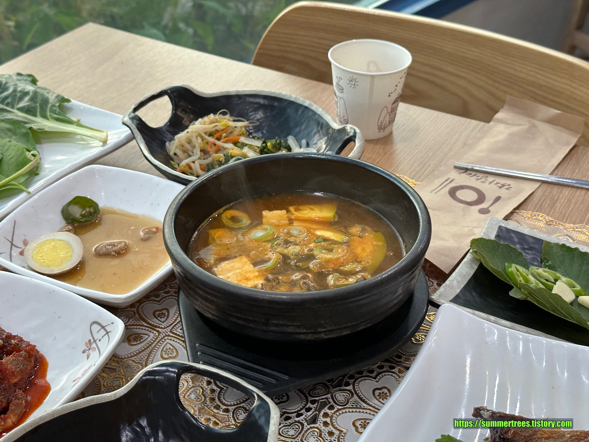 마당에 테이블이 있어 우리같이 강아지와 방문하는 사람들은 많이 덥거나 춥지 않다면 야외에서 식사를 할 수도 있다. 단, 정식메뉴는 곤란하고 소고기국밥 정도 서빙이 가능하며 손님이 많은 날에는 곤란할 수도 있다고 한다.