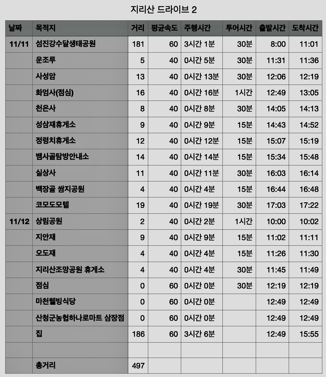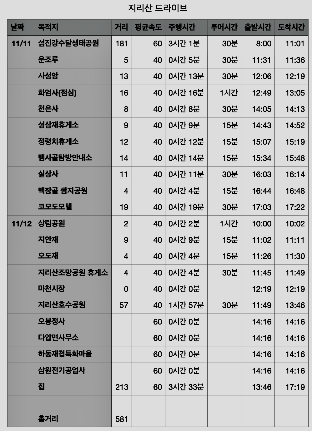 아래처럼 스케줄을 준비했지만 차가 밀리는 바람에 실상사와 쌈지공원은 가지 못했다. 차가 밀리고 신호 대기 시간을 고려하면 평균 속도 60은 비현실적이었다.