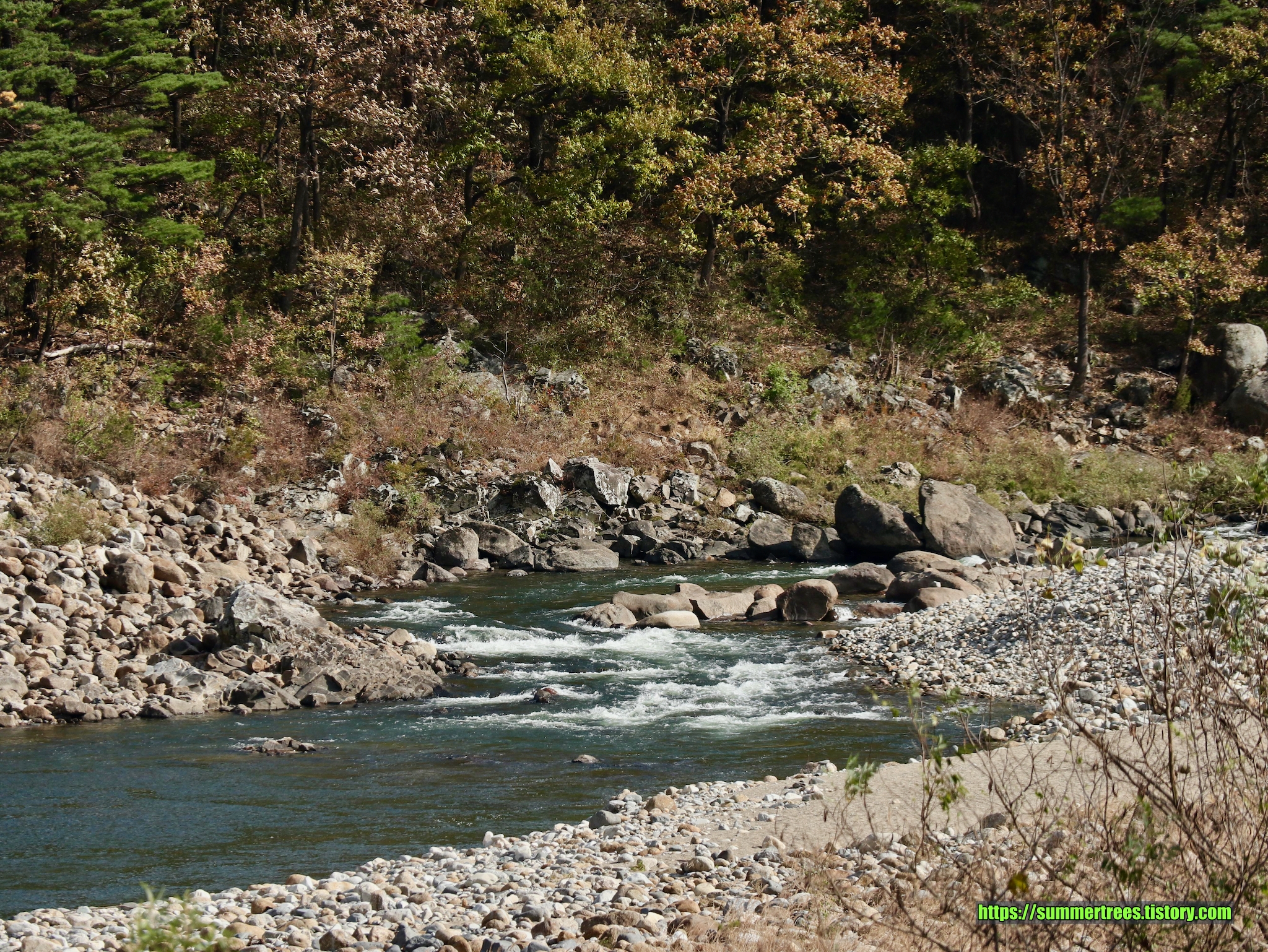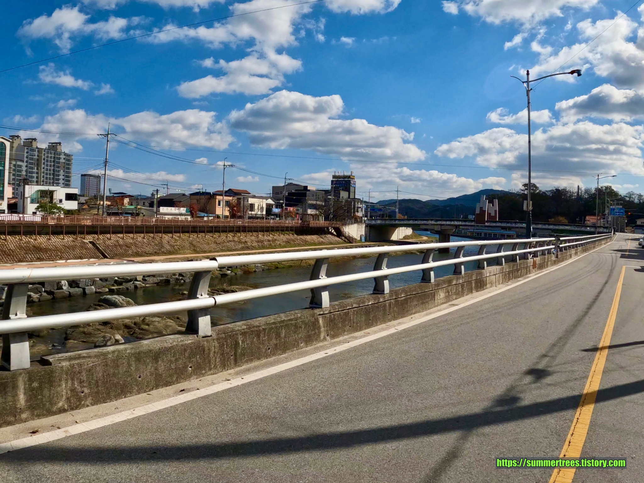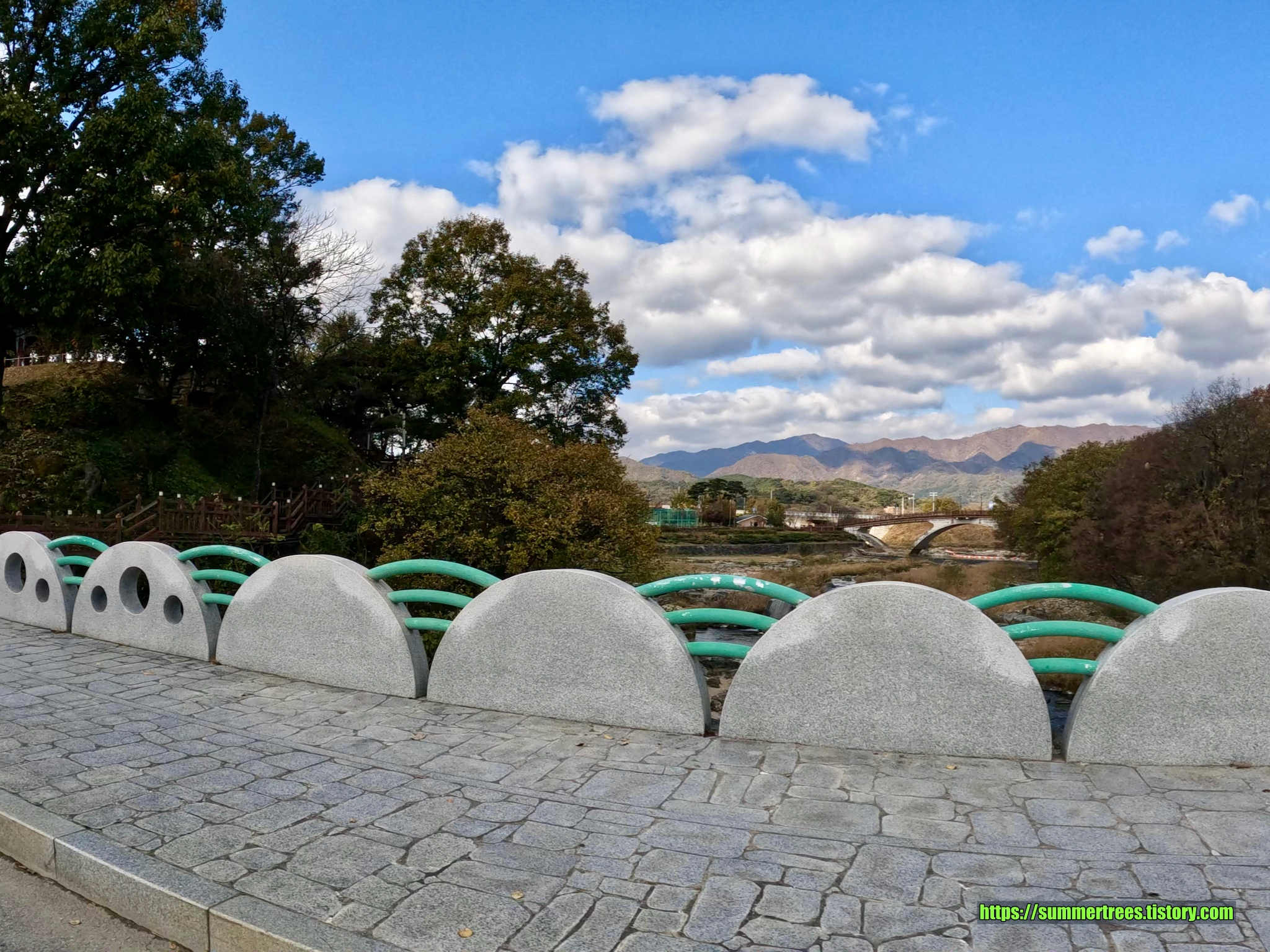 특이한 하천이고 계곡이다. 의령천과 남산천이 합류하는 지점인데 딱 3거리를 만들었다. 그 하천을 따라 구름다리를 만들었는데 절묘하다. 겨울에 접어들어 하천물이 깨끗해서 더욱 좋았다.