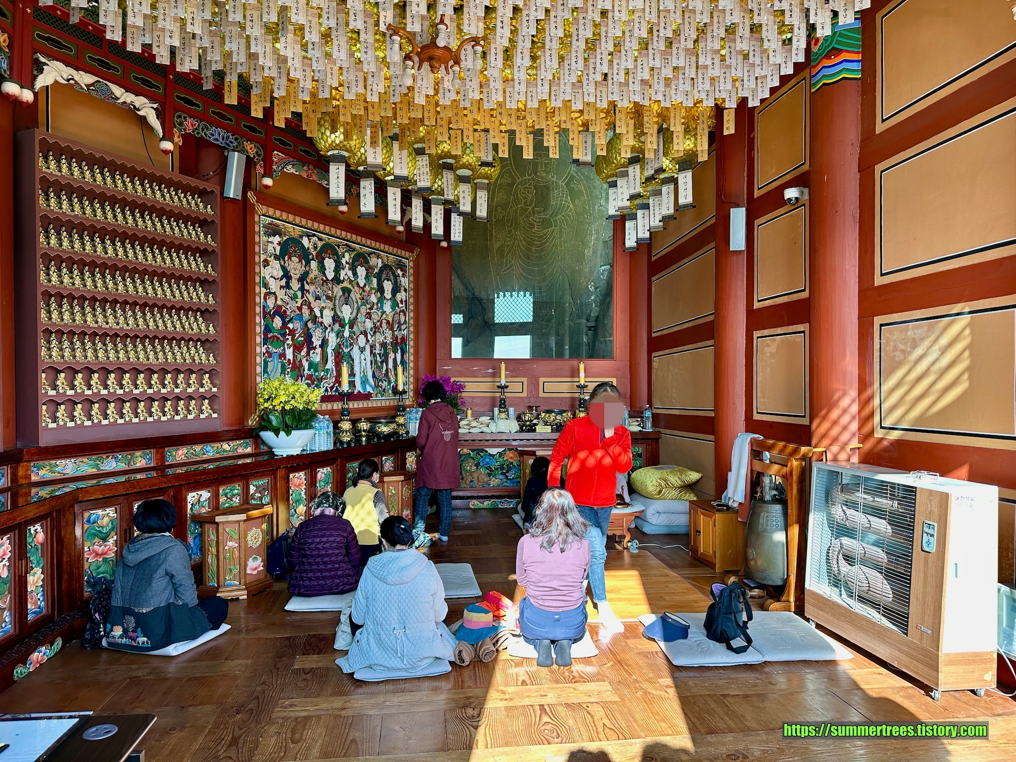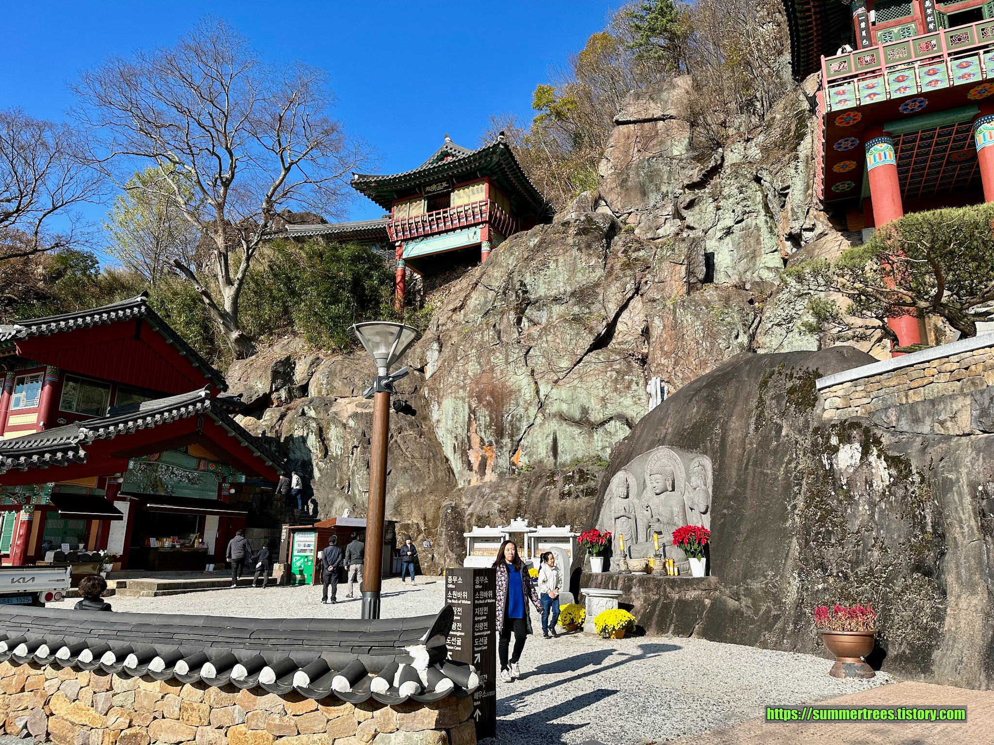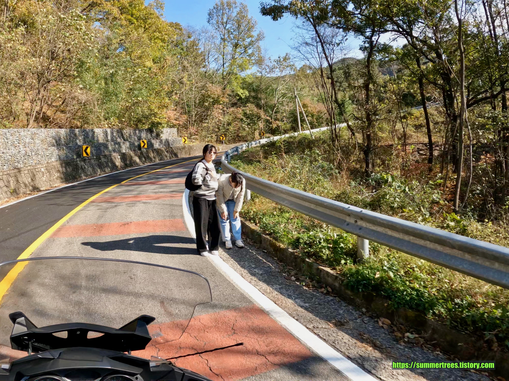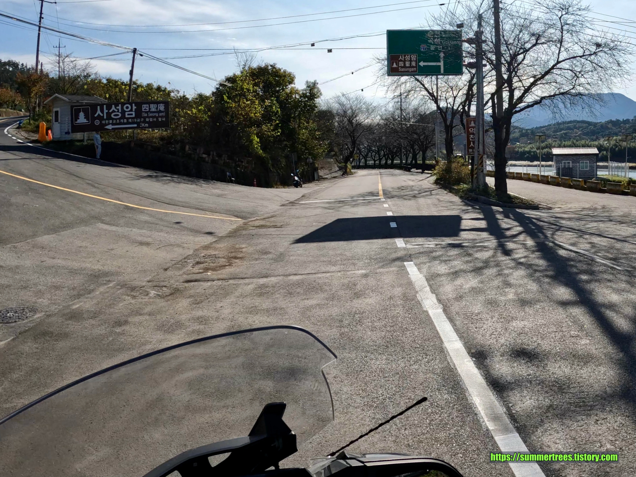 사성암에는 주차자리가 그리 많지는 않다. 그래서 많은 사람들이 아래에서 마을버스를 타고 사성암으로 향한다. 몇몇 사람들은 걸어서 사성암까지 가던데, 상당히 높은 언덕길을 올라야 하기 때문에 쉽지 않아 보였다. 거리를 재보니 삼거리에서 사성암까지 3.2 km였다. 이 거리를 걸어올라가면 두 시간은 걸릴 듯 하다. 차로 올라가서 주차자리가 없으면 다시 내려와서 버스를 타든가, 아니면 처음부터 버스를 타는 것을 권한다. 우리는 바이크니까 주차자리 걱정없이 바로 올라갔다.