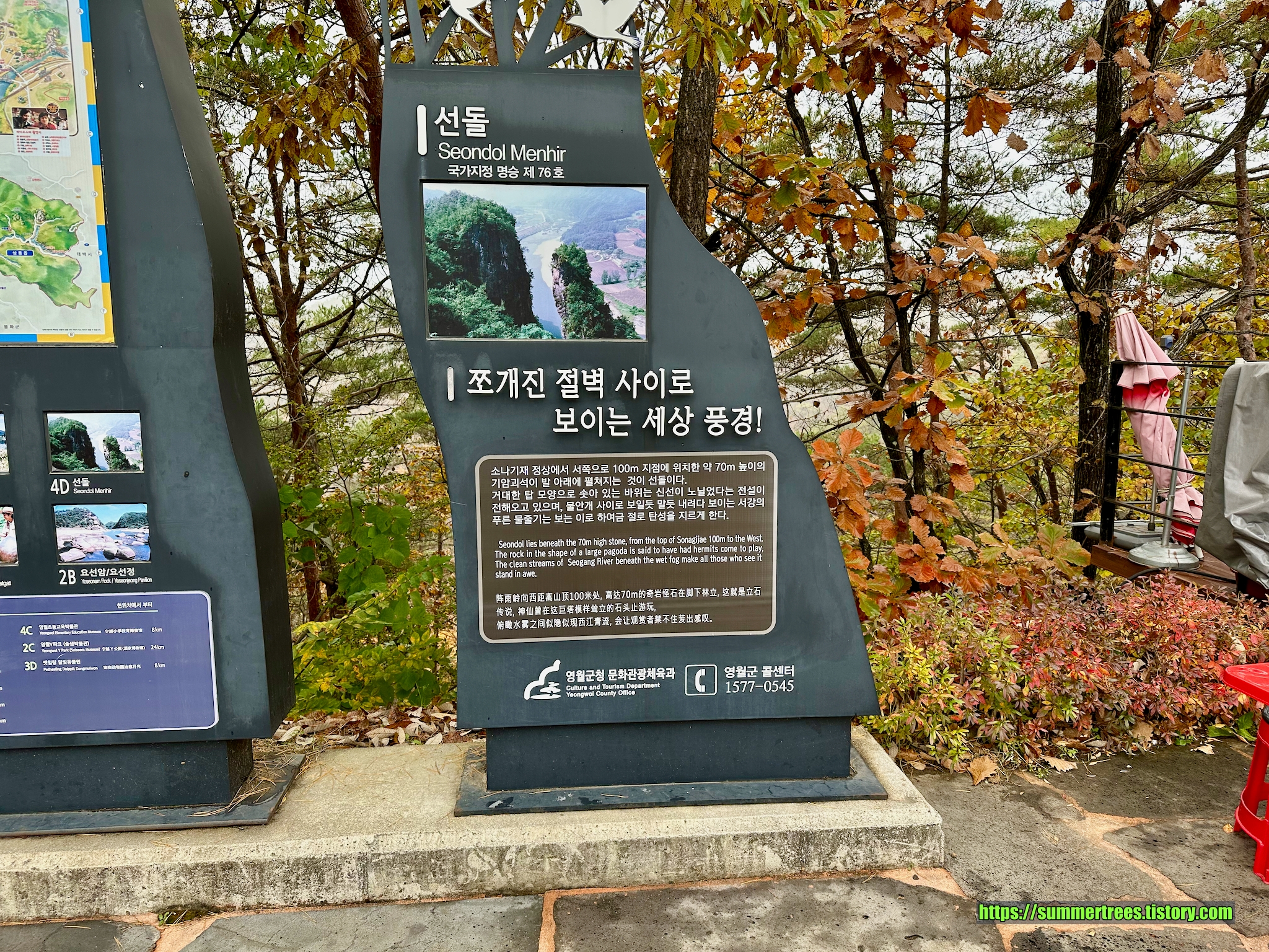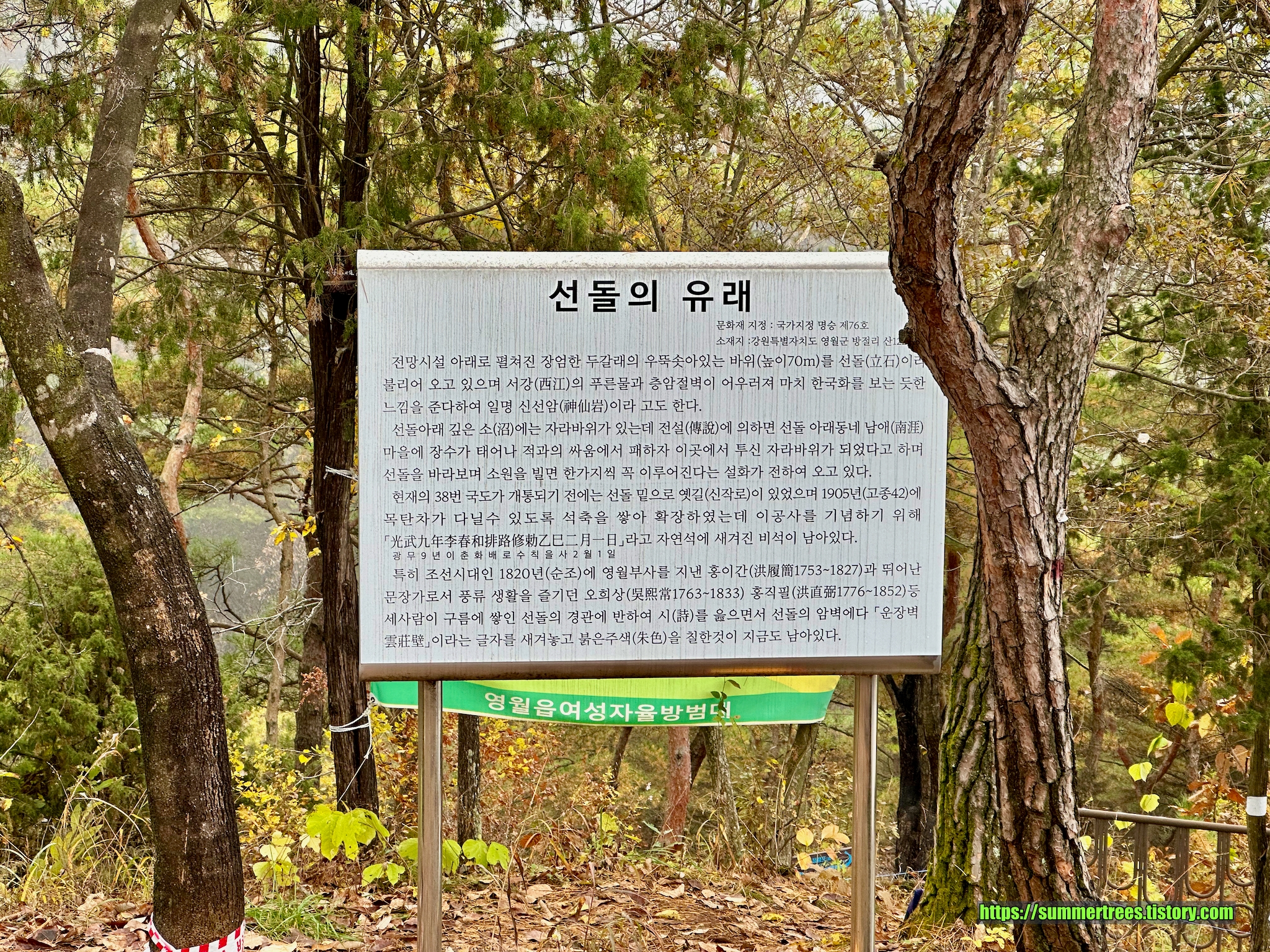 선돌은 사진으로 보던 것과는 전혀 다른 느낌. 사진으로는 별 감흥을 느끼지 못하고 영월 10경에 들어가 있어 의무적으로 스케줄에 넣었는데 직접 보니 감탄이 나왔다. 사진으로는 표현할 수 없는 웅장함과 신비로움이 느껴졌다. 꼭 가봐야 하는 곳으로 생각된다. 구경하는데 1시간을 잡았는데 가보니 주차장에서 잠깐만 걸으면 도착할 수 있었다.