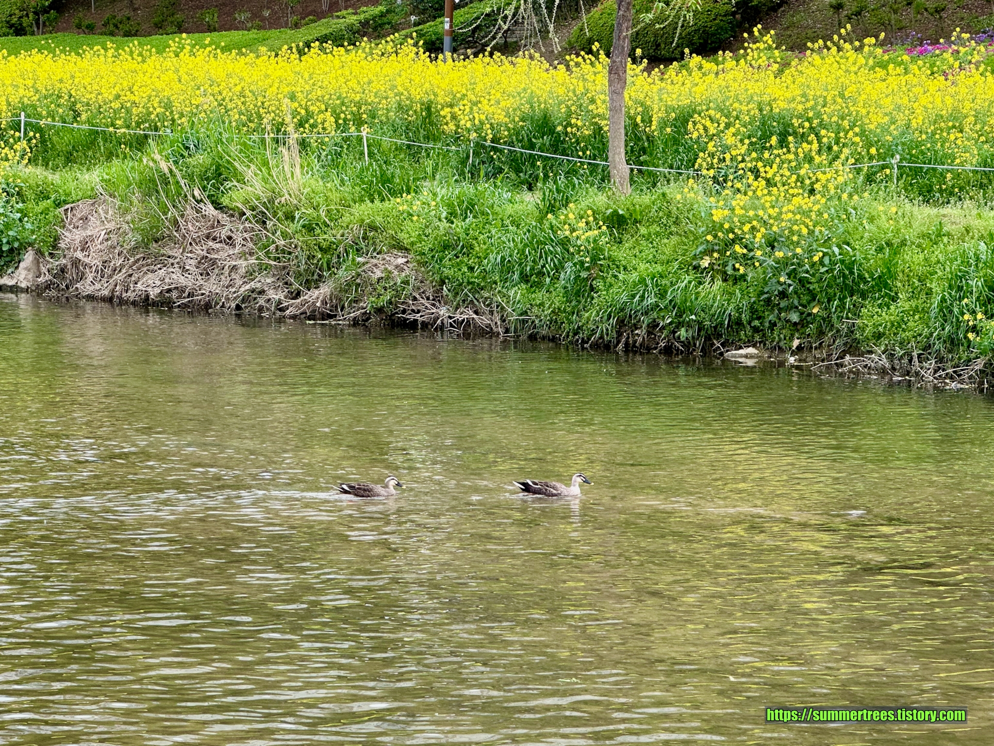 흰뺨검둥오리와 왜가리, 그리고 유채꽃.