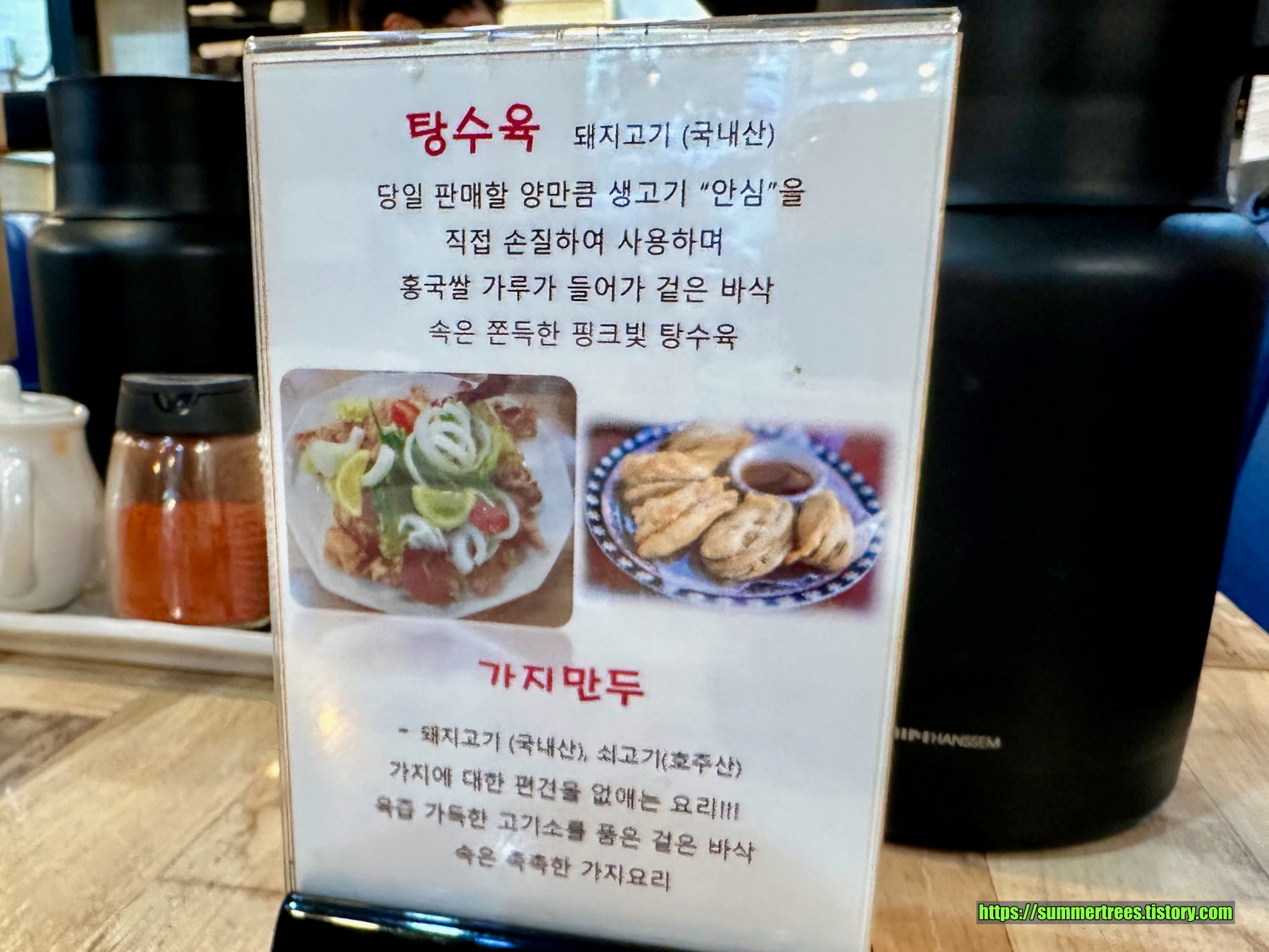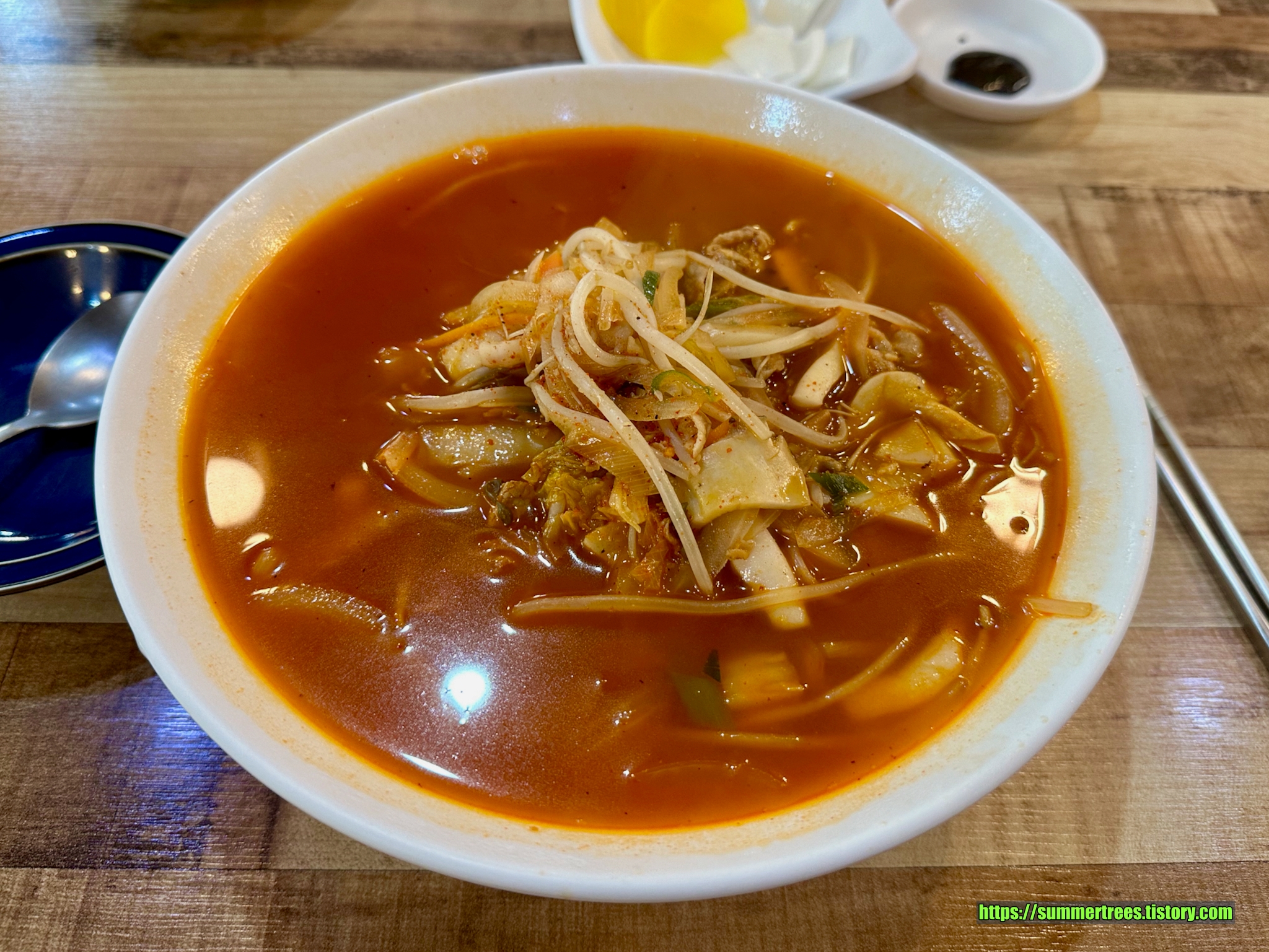 국물이 깔끔하다. 콩나물이 아닌 숙주나물을 써서 그런 것 같고 건더기가 적당히 있고 너무 자극적이지 않다. 돼지고기도 약간 들어있다. 나는 짬뽕에 들어가는 오징어는 특이한 느낌 때문에 먹지 않는데 이곳의 오징어는 먹을 수 있었다. 내가 알기로 다른 중국집에 들어가는 오징어는 진짜가 아닌 냉동오징어라고 알고 있는데 이 집의 것은 부드럽고 먹을 만했다. 내 취향에 맞았다.