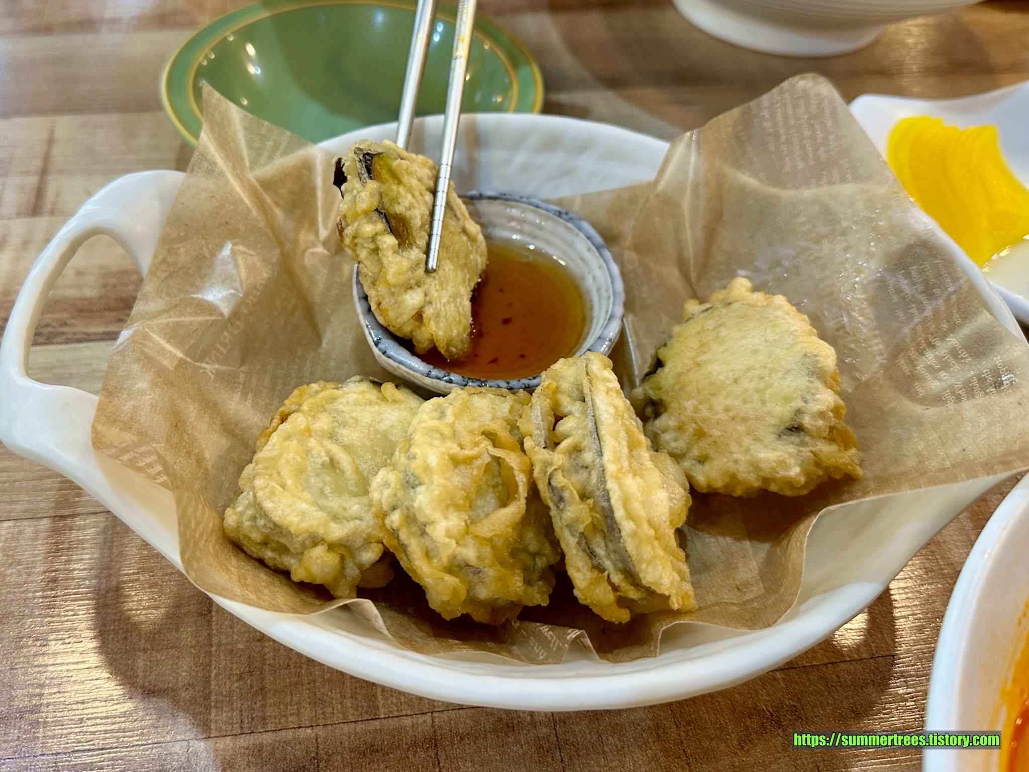 가지만두는 소고기와 돼지고기를 섞은 만두소를 가지사이에 넣은 요리라는데 먹을 만 했다.