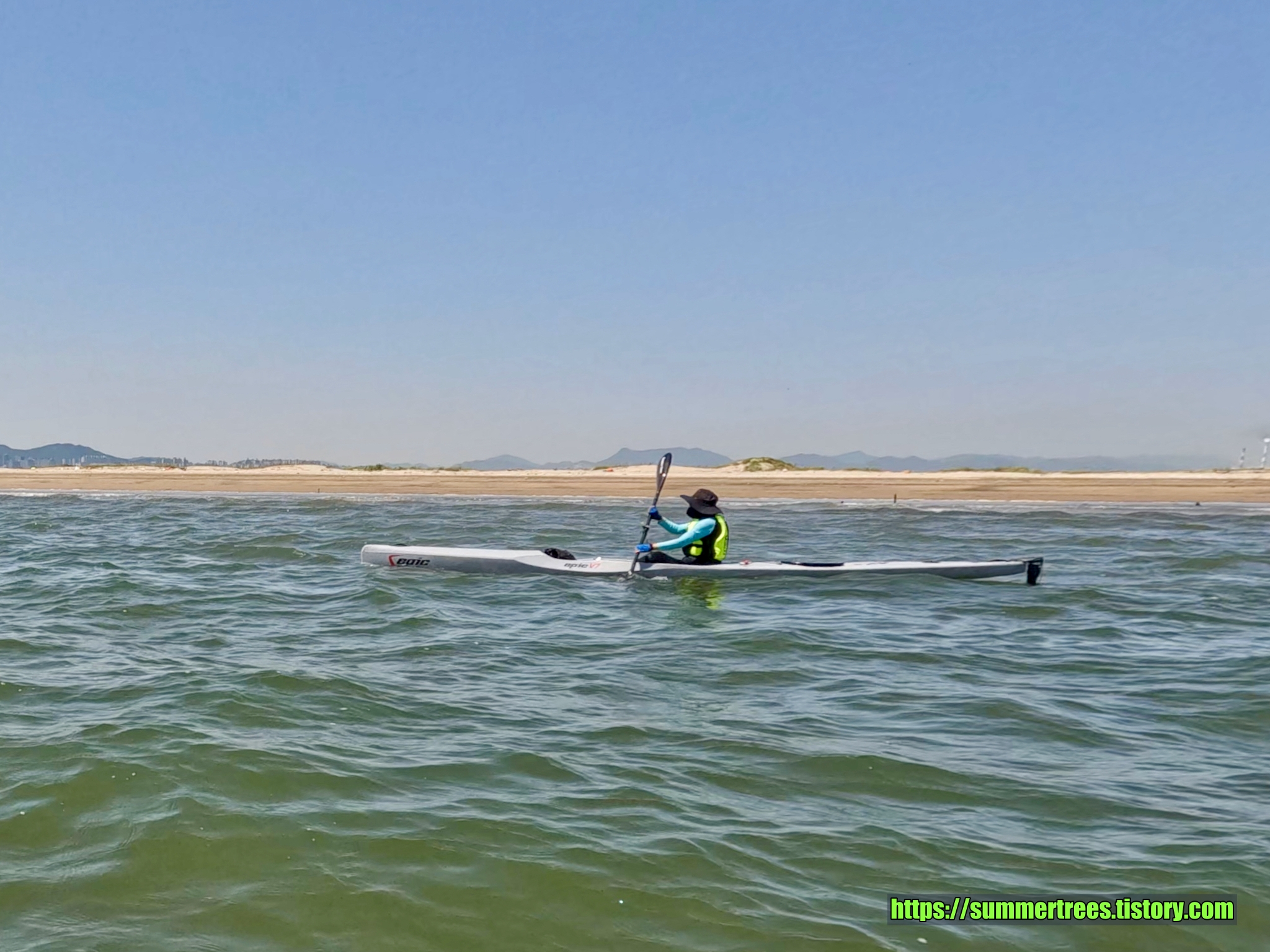 도요등을 따라 한참 패들링을 하고 끝자락에 도착했을 때 파도가 얕은 모래바닥에 부딪히는 것을 볼 수 있었다. 도요등 같은 낙동강 하류의 모래섬들은 습지보호구역이라 상륙금지라고 한다.