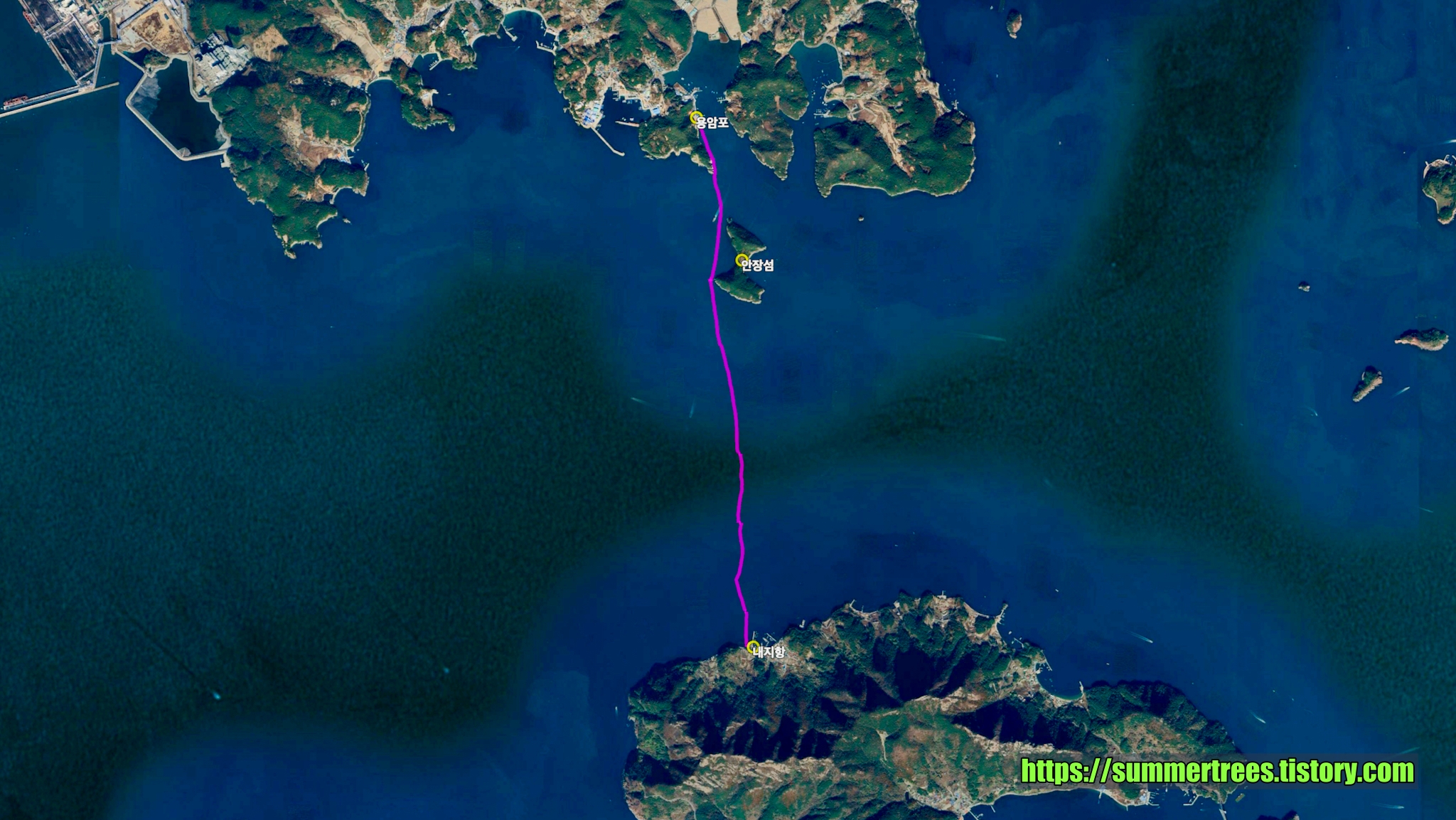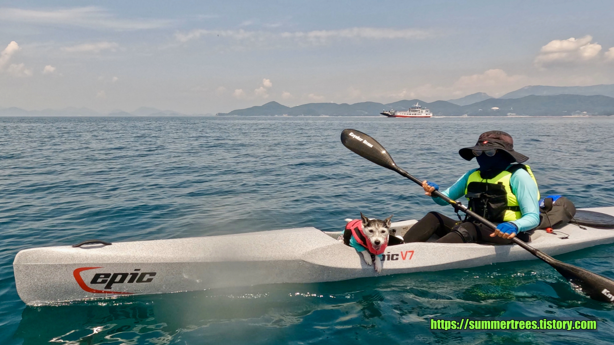 우리는 단 둘이 카약을 타기 때문에 다른 선박과의 충돌 가능성을 고려해서 가능한 한 섬을 연결하는 루트를 만든다. 그래서 이번에선 안장섬과 사량도, 농가도를 웨이포인트로 두었다. 실제로는 어선보다 사량도를 왕래하는 페리들이 많았다.