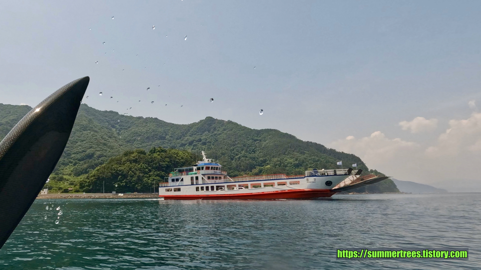 양식장에 붙어 카페리가 떠나길 기다린 후 패들링.