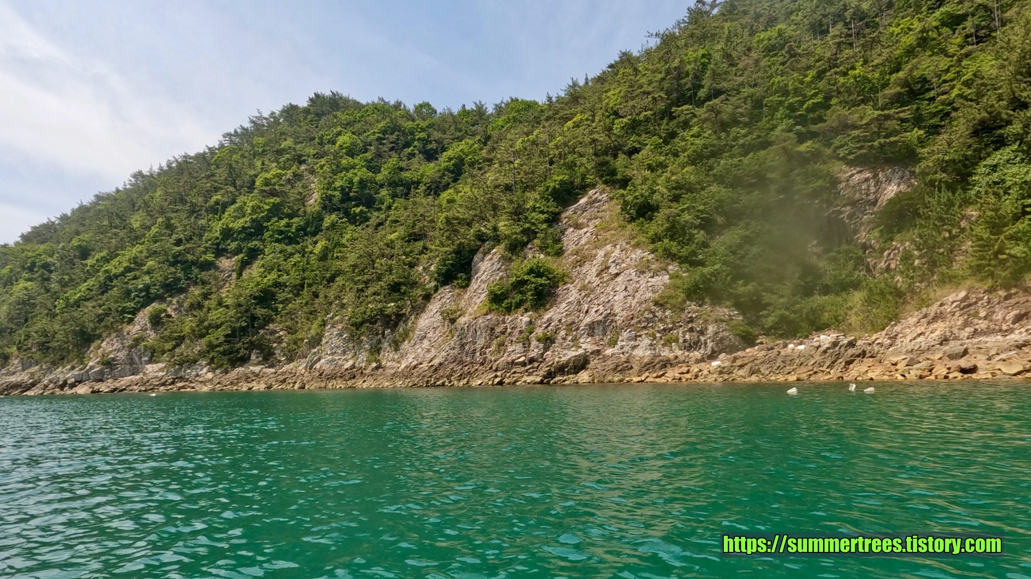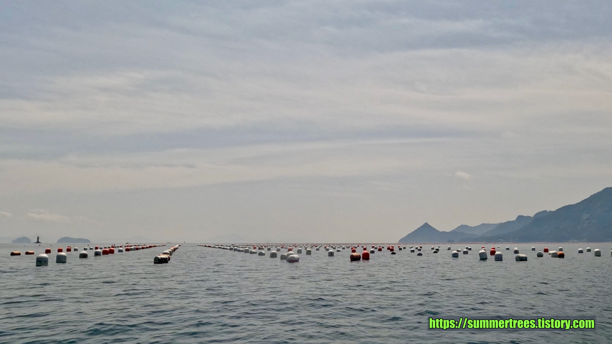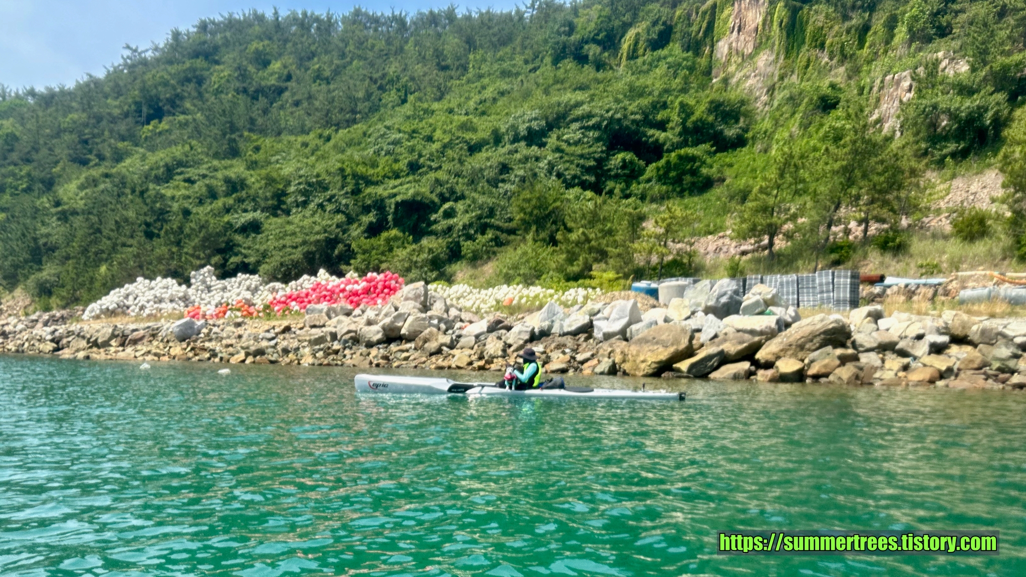안장섬을 지나니 양식장이 있었는데 덕분에 배를 피할 수 있겠다 싶어 반가웠다. 송정에서는 양식장을 빙돌아다녀야 해서 귀찮게 여겼었는데 투어를 다닐 때는 양식장이 오히려 보호구역을 만들어주는 존재였다.