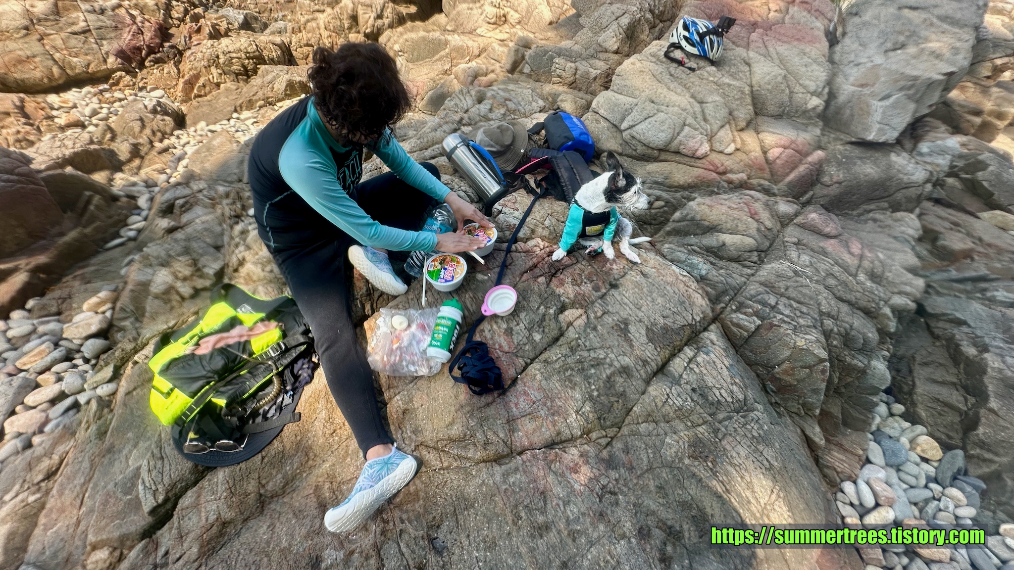 수우도에는 식당이 없어 끓인 물과 사발면, 삶은 달걀을 가지고 와서 점심을 먹었다.