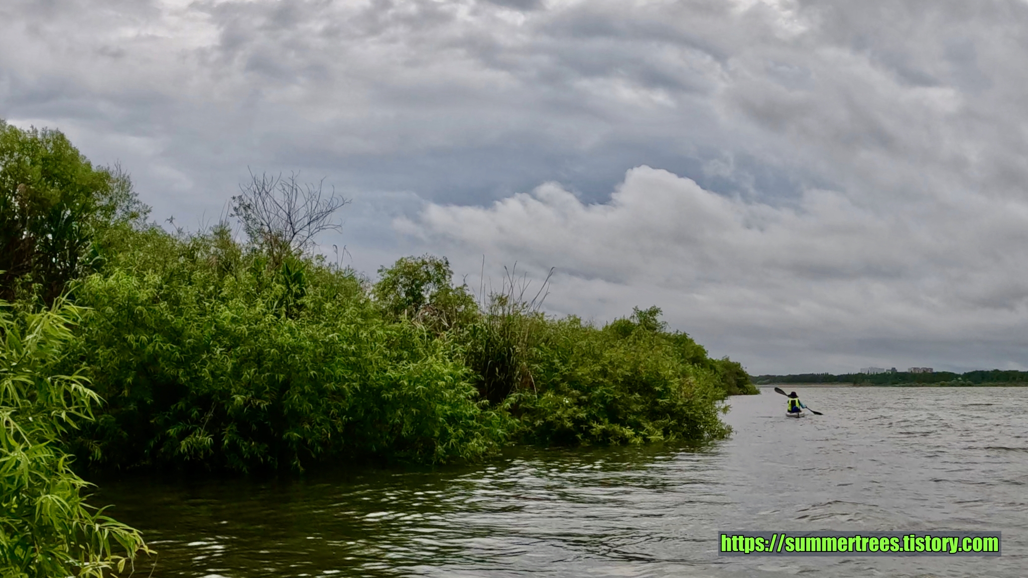 우리가 출발한 시간이 세 시 다 되어서인데 늦은 아침을 아점으로 떼우다보니 체력이 방전됐다. 쉬면서 준비해 온 과자와 음료수를 먹고 나니 그제서야 정상적인 패들링을 할 수 있었다. 먹는 게 중요하다는 걸 다시 느꼈다.