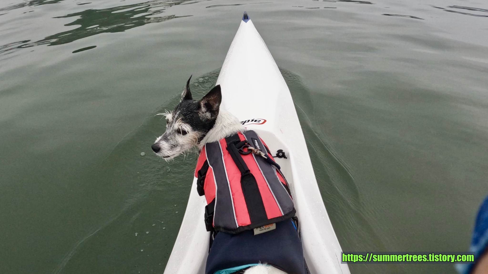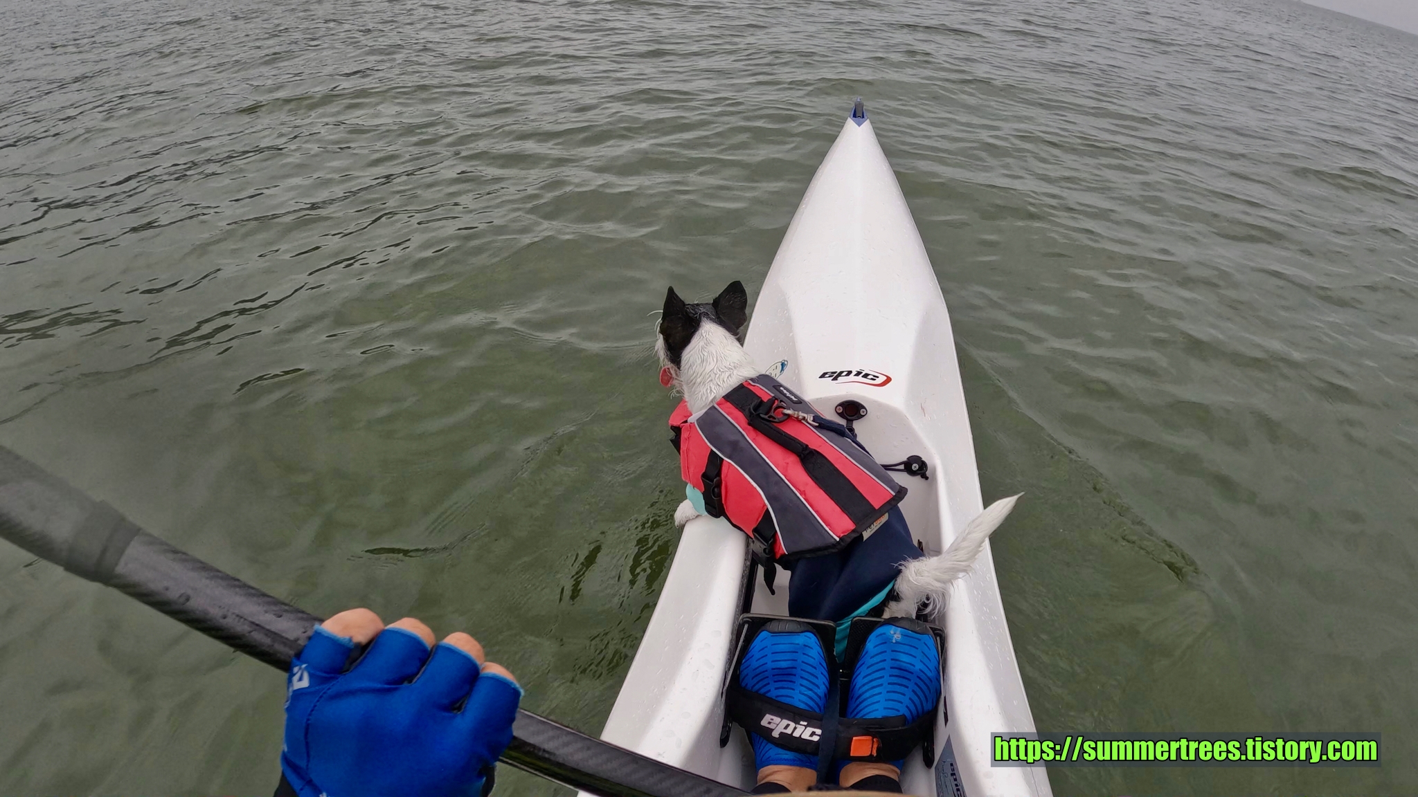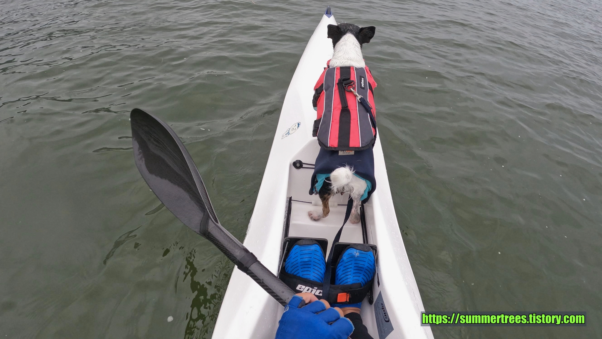 마야는 항상 어딘가에 올라가서 무언가를 보려는 경향이 있는데 카약을 탈 때도 역시 조금이라도 더 높은 곳을 오르려 한다. 그래서 올라선 곳이 러더 조절줄 위다. 덕분에 발을 다칠까봐 걱정이 되는데 V8은 모양이 틀리다는 걸 이번에 알았다.