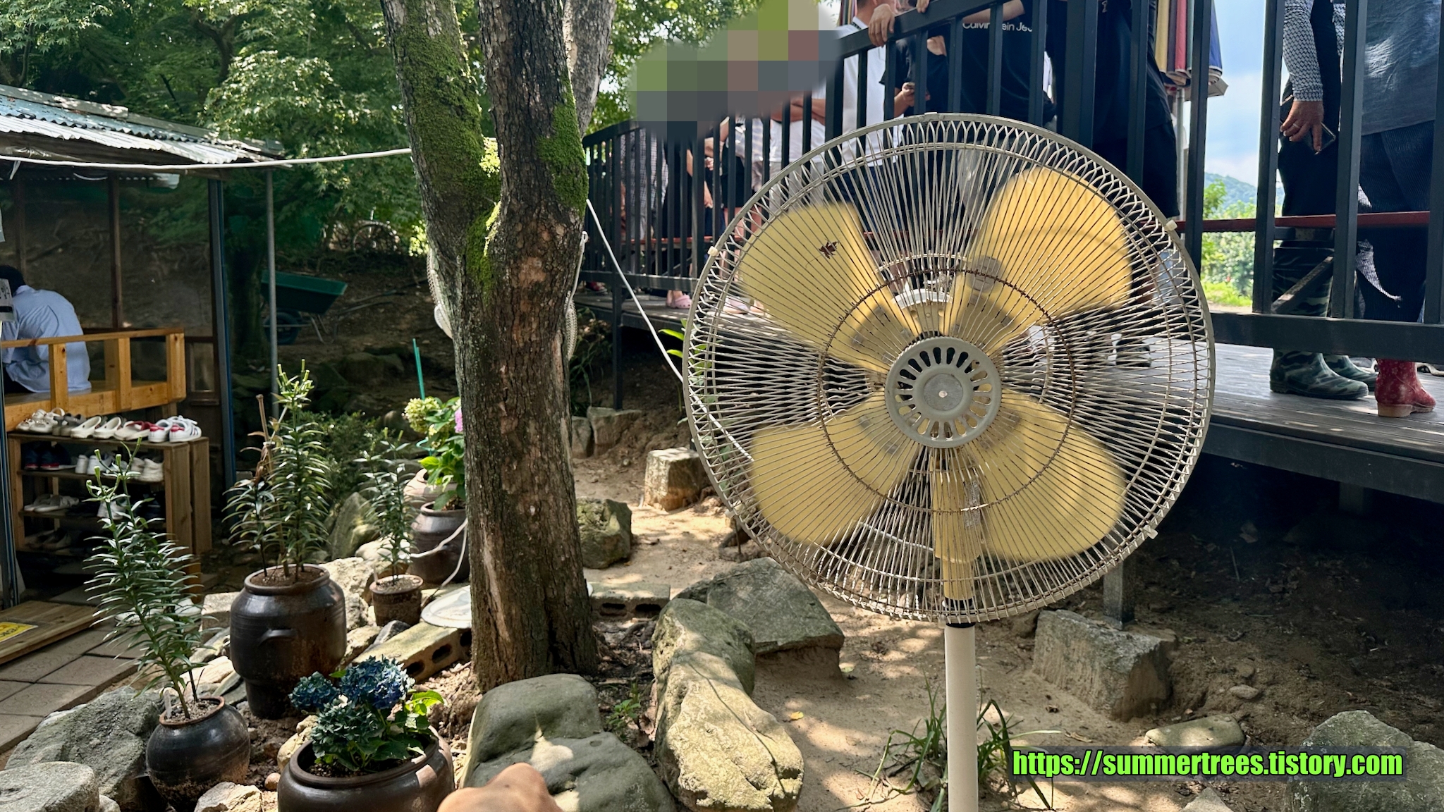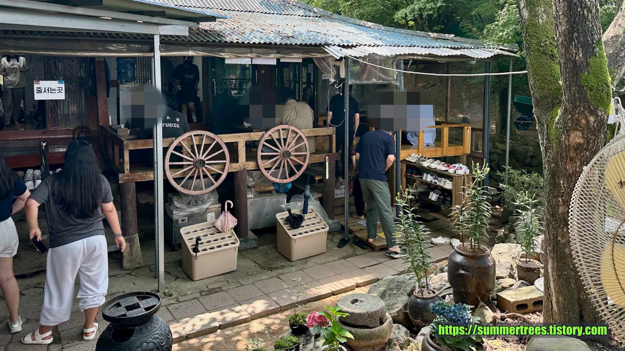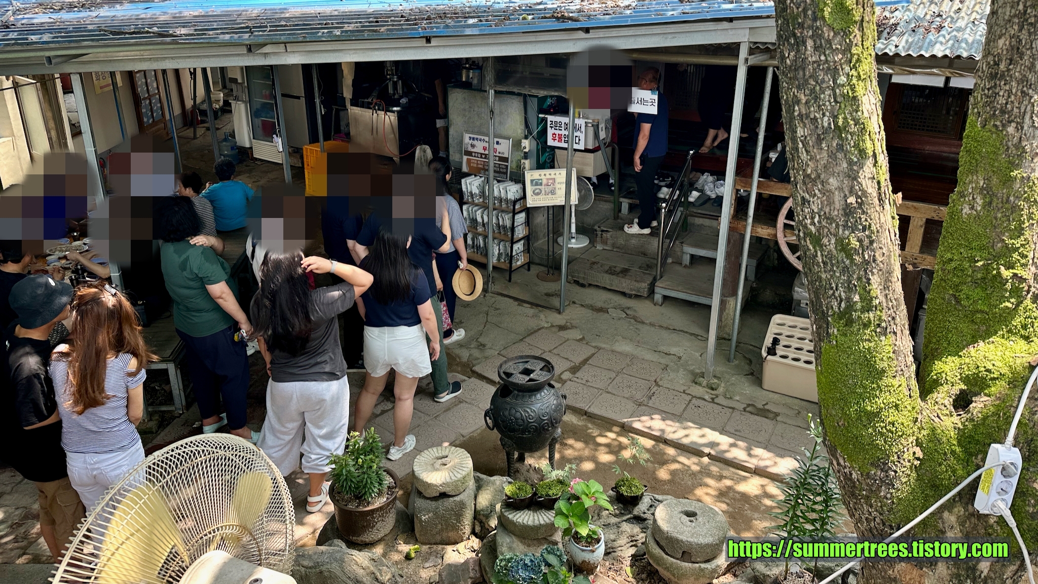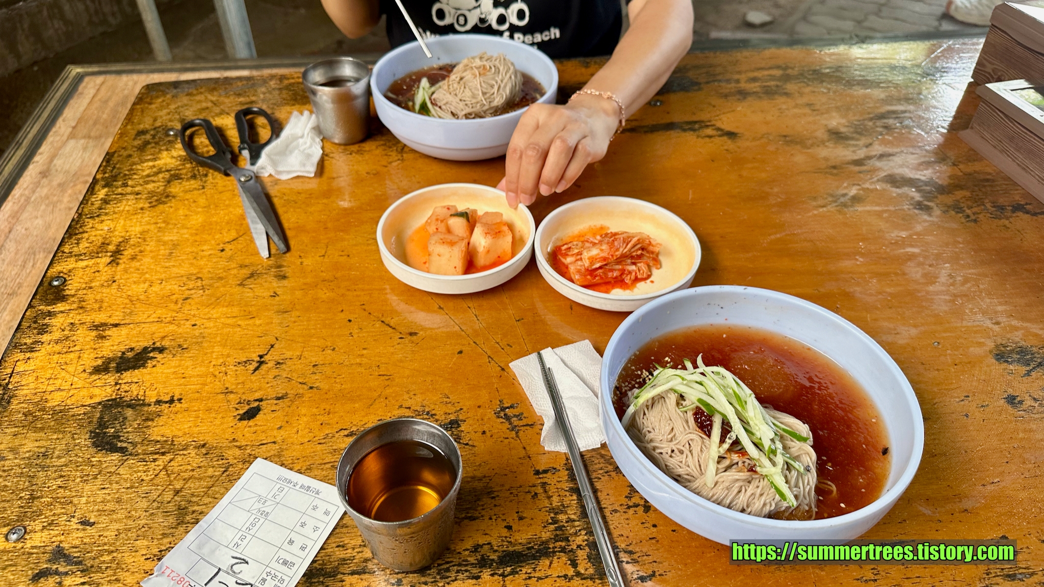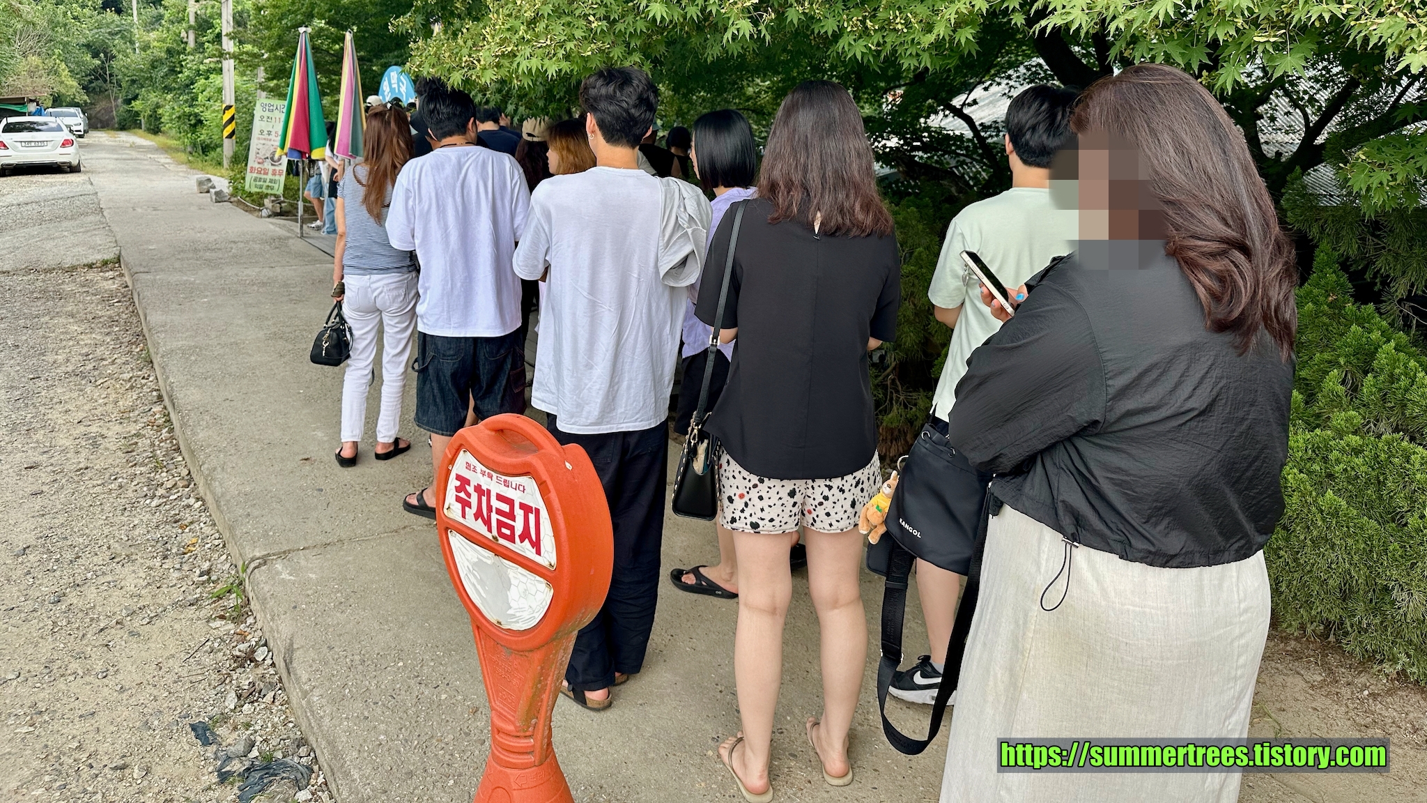 몇년 전 카약대회 때 이곳을 지나쳤을 때도 사람들이 줄을 서서 기다리고 있었는데 이 날도 역시 줄이 길었다. 리뷰를 보니 평일에는 사람이 그리 많지 않은데 주말마다 줄이 길어져 관광객들이 고생을 한다고 한다. 하지만 막국수 먹는 시간이 길지 않은 관계로 길어보이는 줄도 금새 순서가 온다. 무척 더운 날이었는데 식당에서 친절하게 대기줄을 위해 대형 선풍기 두 대를 돌려줘서 다행이었다.
