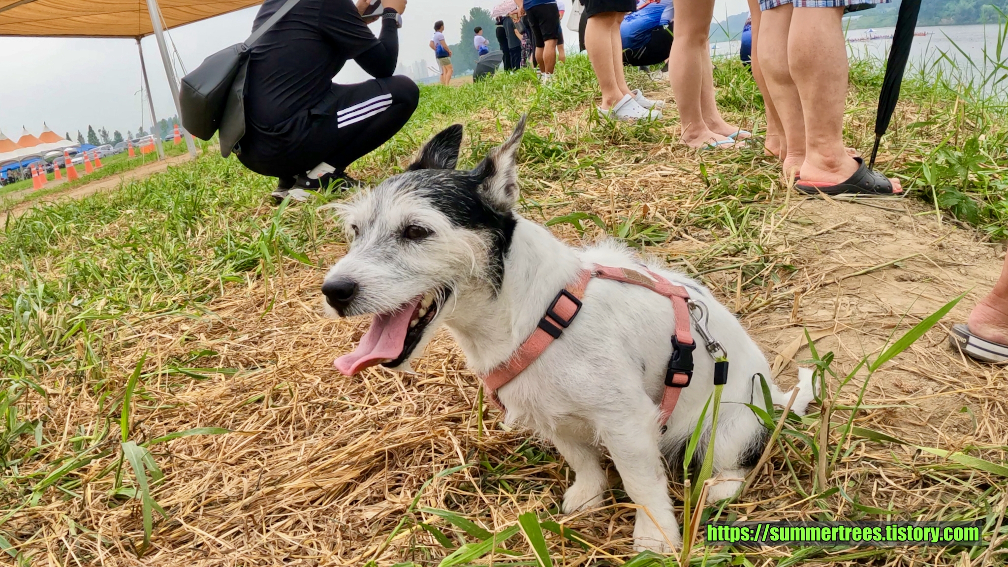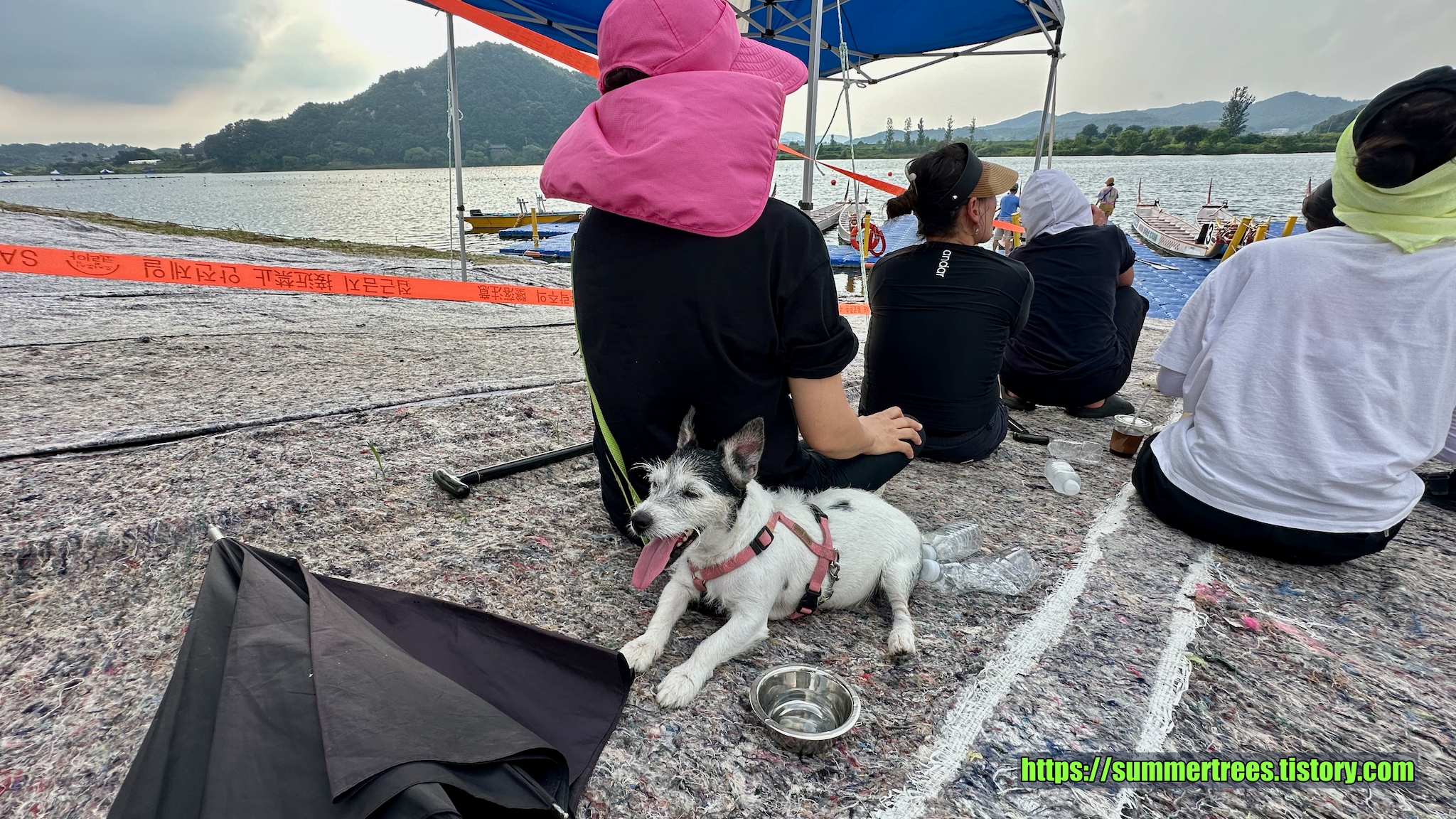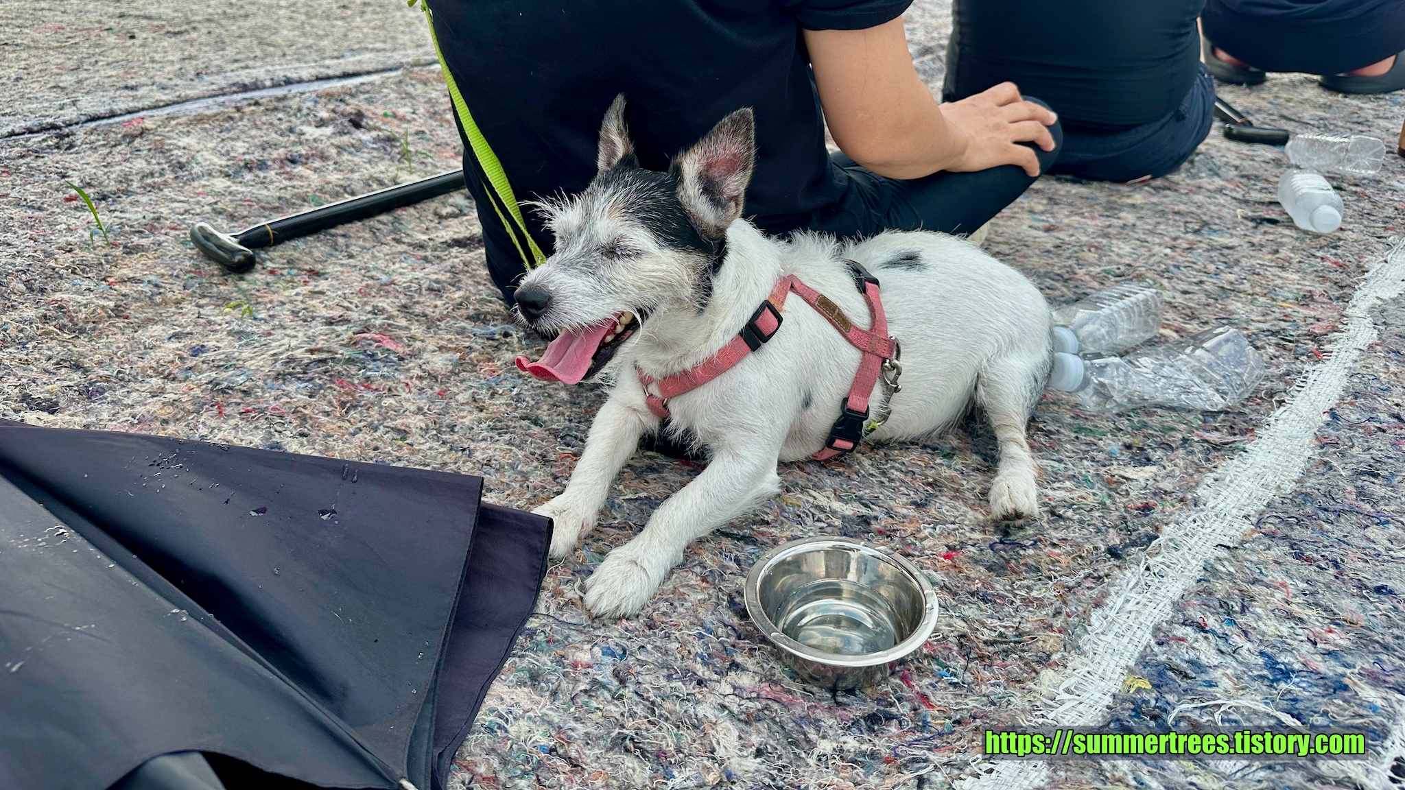 용선대회 내내 마야가 제일 고생을 했다. 내내 헐떡거렸다. 내가 우리 팀들 경기를 고프로로 찍을 때 그늘을 벗어나면 힘들다고 투정을 부릴 정도였다. 마야는 뭔가 요구를 하거나 힘들 때 앞 발을 들어 툭 치는데 두 번이나 그랬다. 그래서 수시로 얼음물을 몸에 뿌려줬다. 물에 젖어 바닥의 흙까지 묻으니 몰골이 말이 아니었다.
