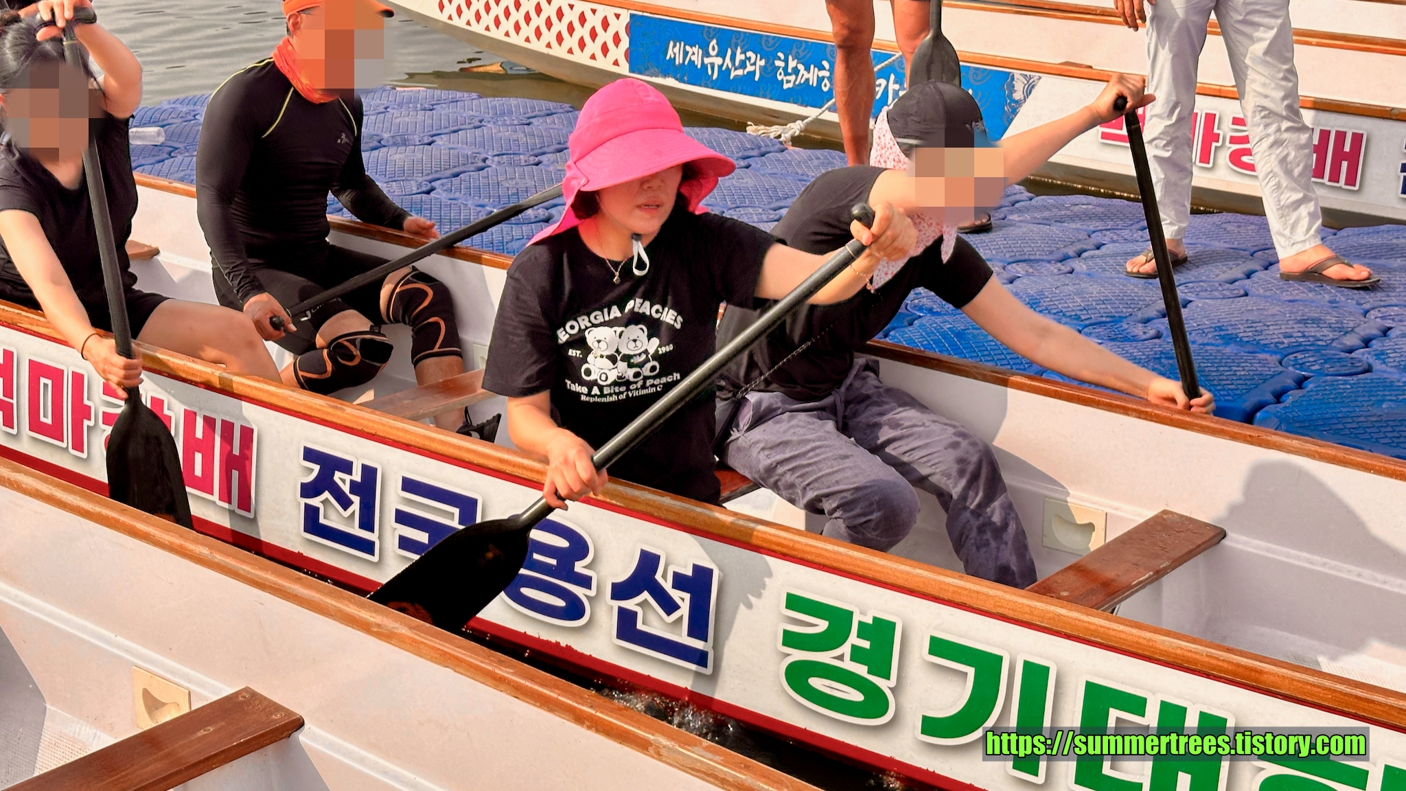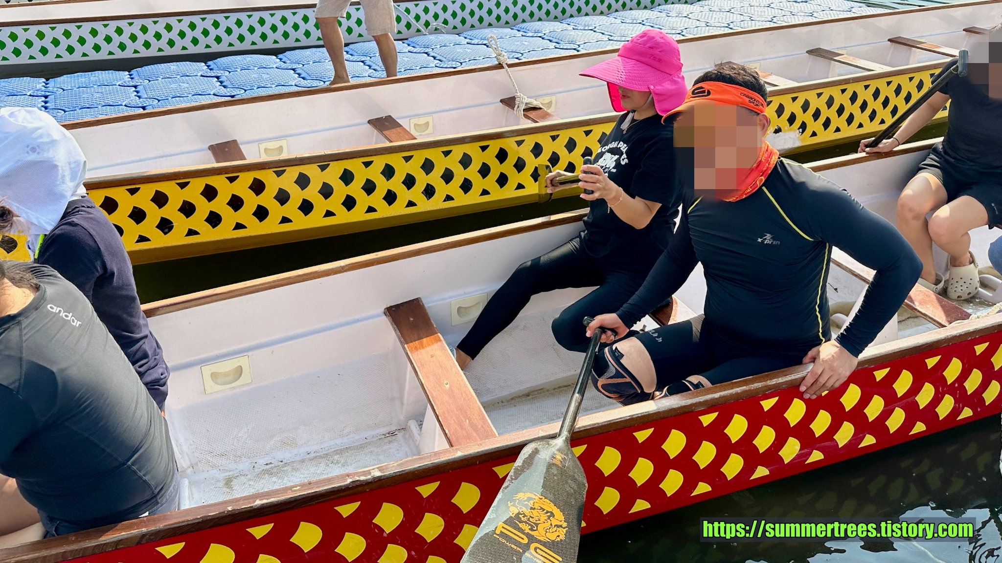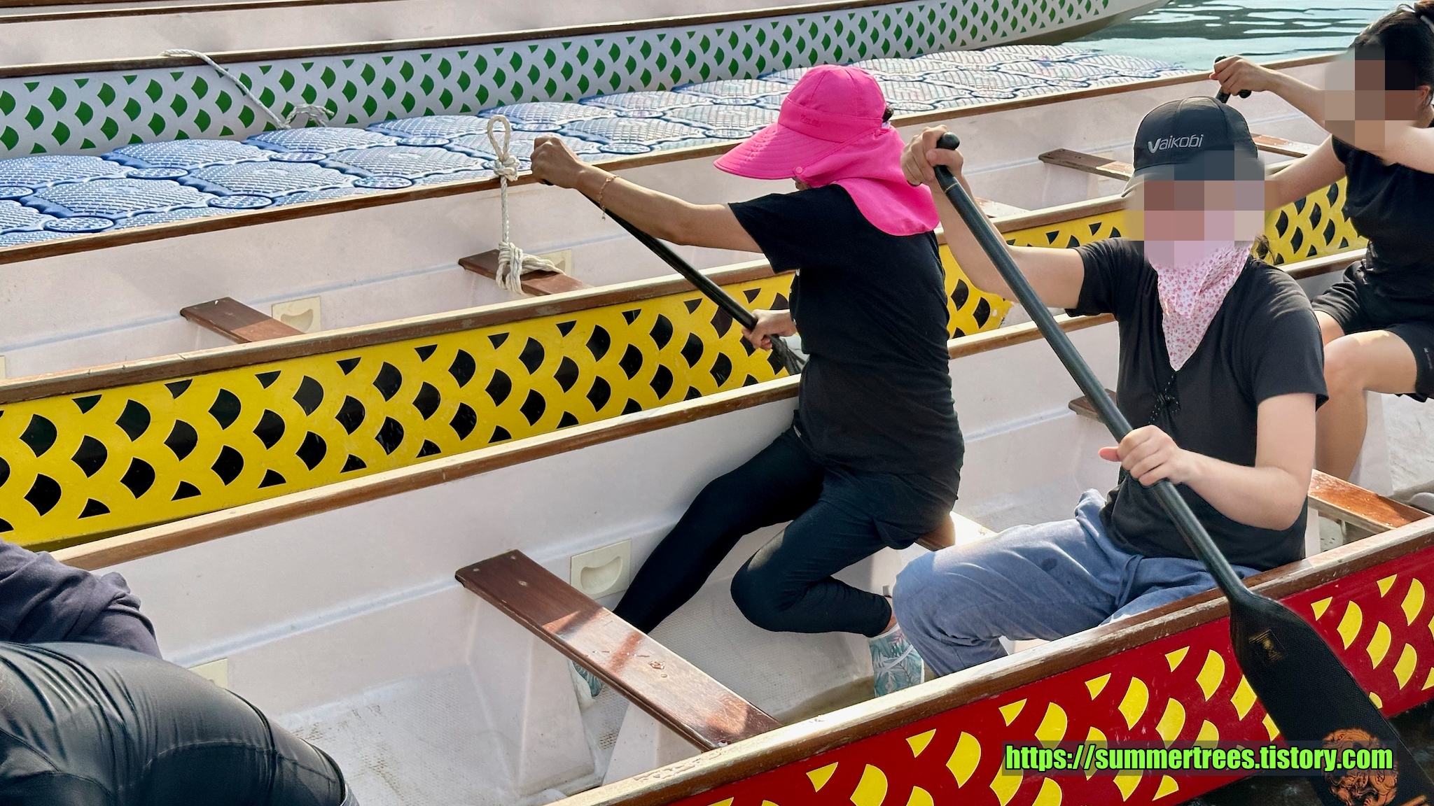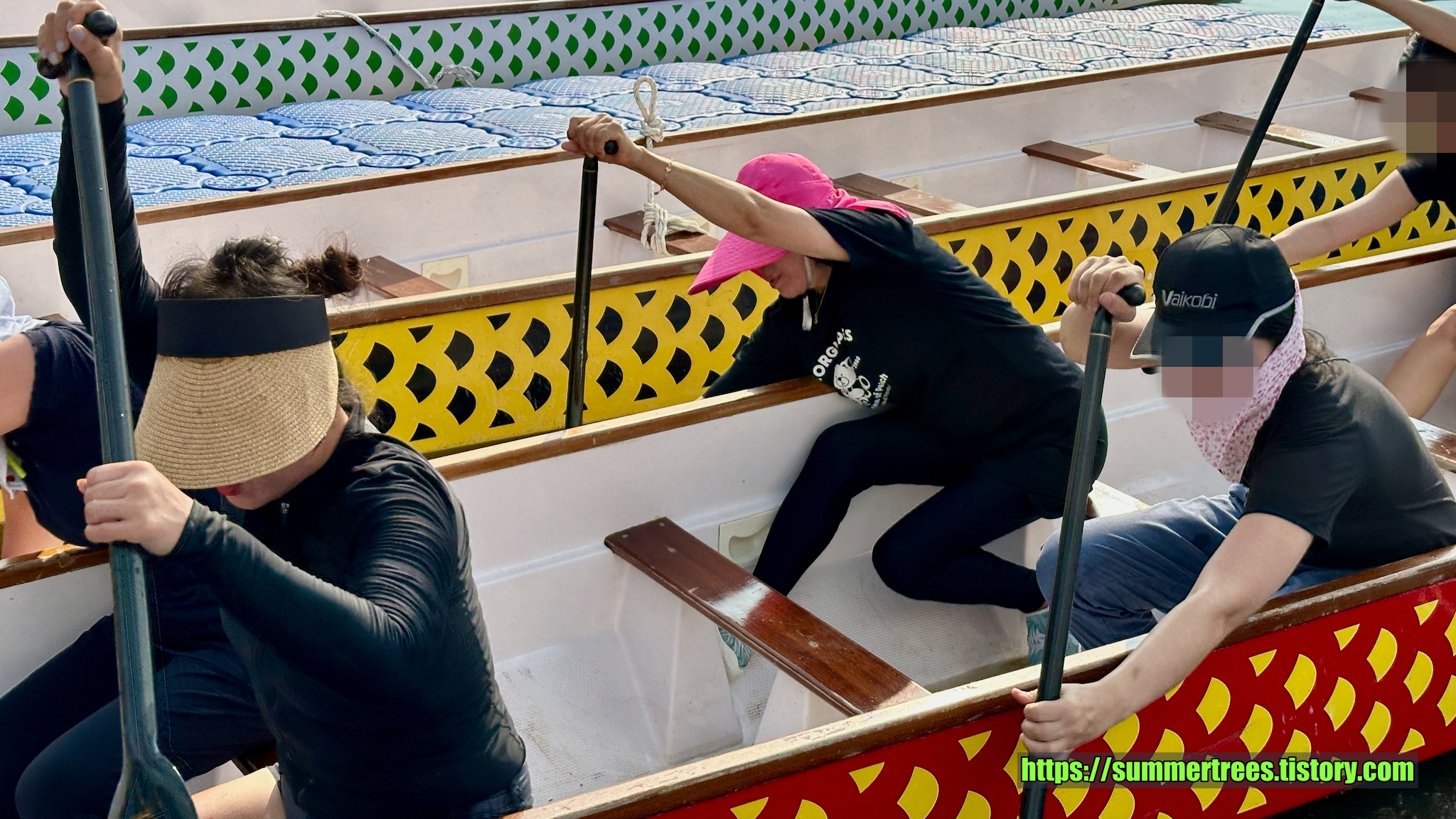 실내에서의 패들링 자세 연습을 마치고 실제 용선에서 연습. 마님도 그렇고 대부분의 사람들이 용선을 생전 처음 타봤다. 무더운 날 밖에서 다들 힘든데도 아주 진지하게 열심히 연습했다.