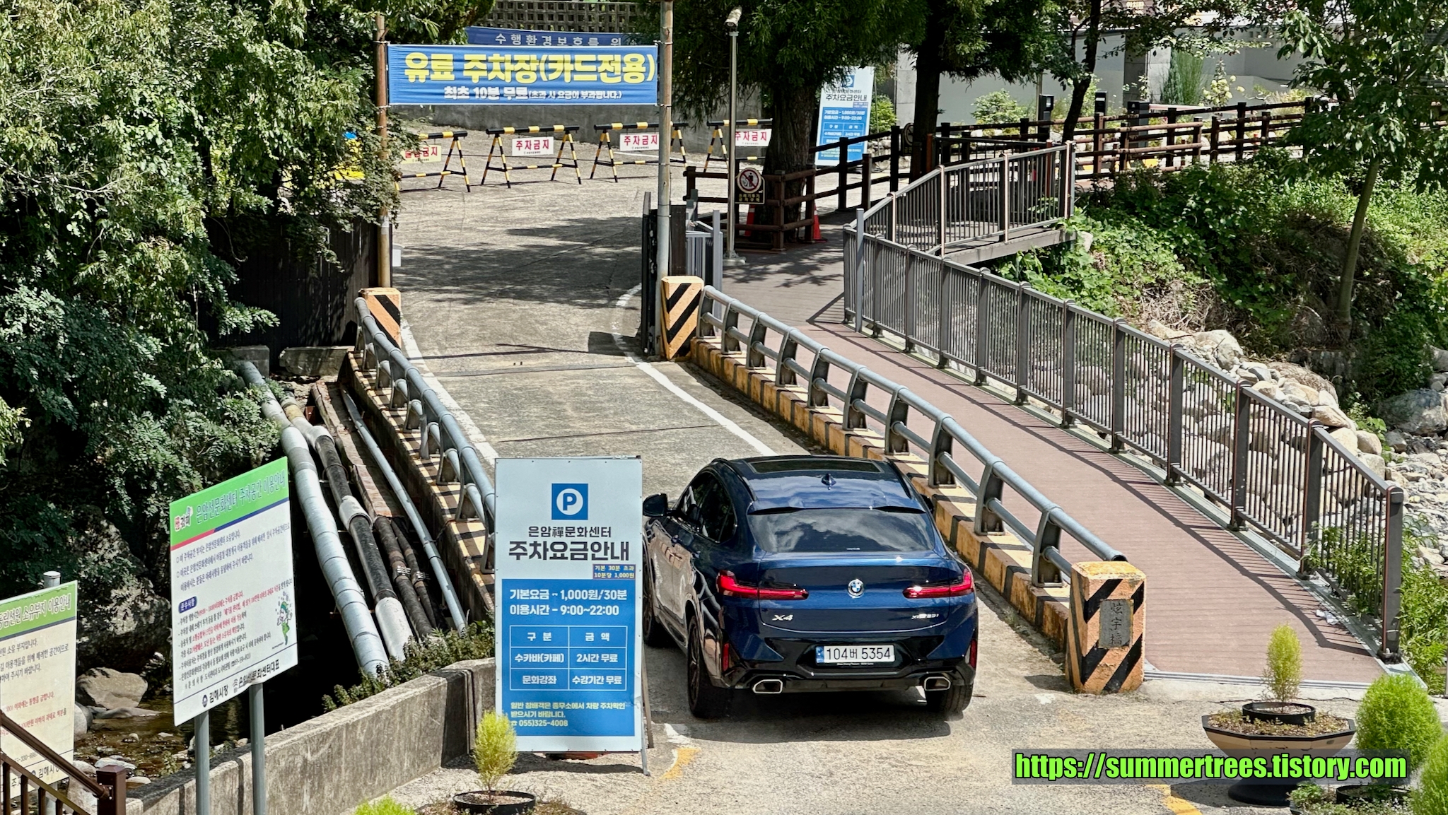 부근의 온암선문화센터 주차장을 이용할 수 있는데 30분당 1000원이다. 계곡물놀이를 길게 할 사람들에겐 비싸겠지만 잠깐 즐기다 갈 것이라면 나쁘지 않을 듯 했다. 카페에서 음료를 사오면 2시간은 무료니 그것도 괜찮을 것 같았다.