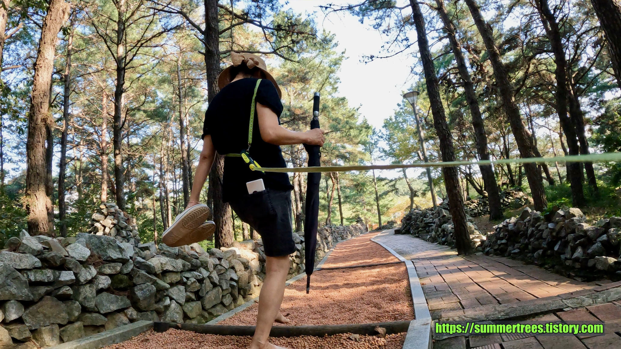 나무 때문에 안보인다. 내려오는 길에는 황토로 된 맨발로 걸을 수 있는 길이 있다. 동그란 흙덩이를 깔아놨는데 느낌이 신기했다. 걷고 난 후 발을 씻을 수 있는 수도가 있어 좋다.