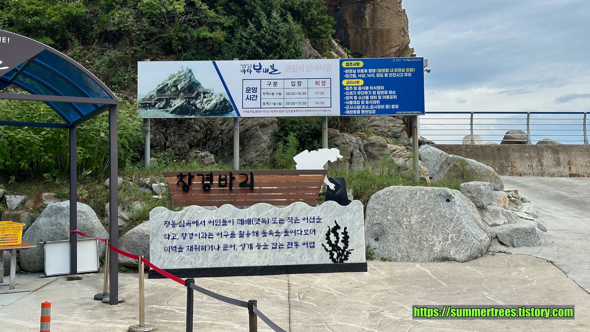 주차장에 차를 대고 잠깐 걸어가니 귀여운 캐릭터가 맞아준다.촛대바위를 먼저 보기로 하고 계단을 올라가면 능파대란 정자가 나오고 곧바로 촛대바위가 보인다. 길을 따라 촛대바위를 다양한