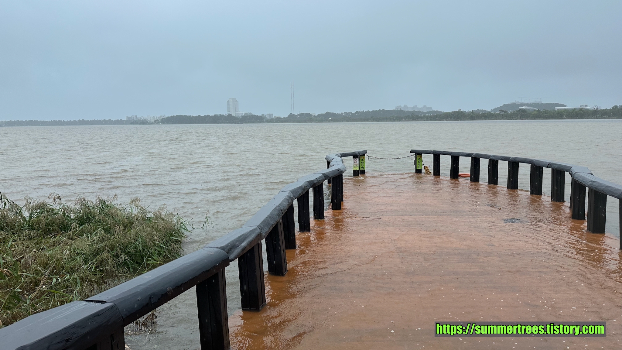 비가 많이 와서 경포대호수가 바다 같았다.
