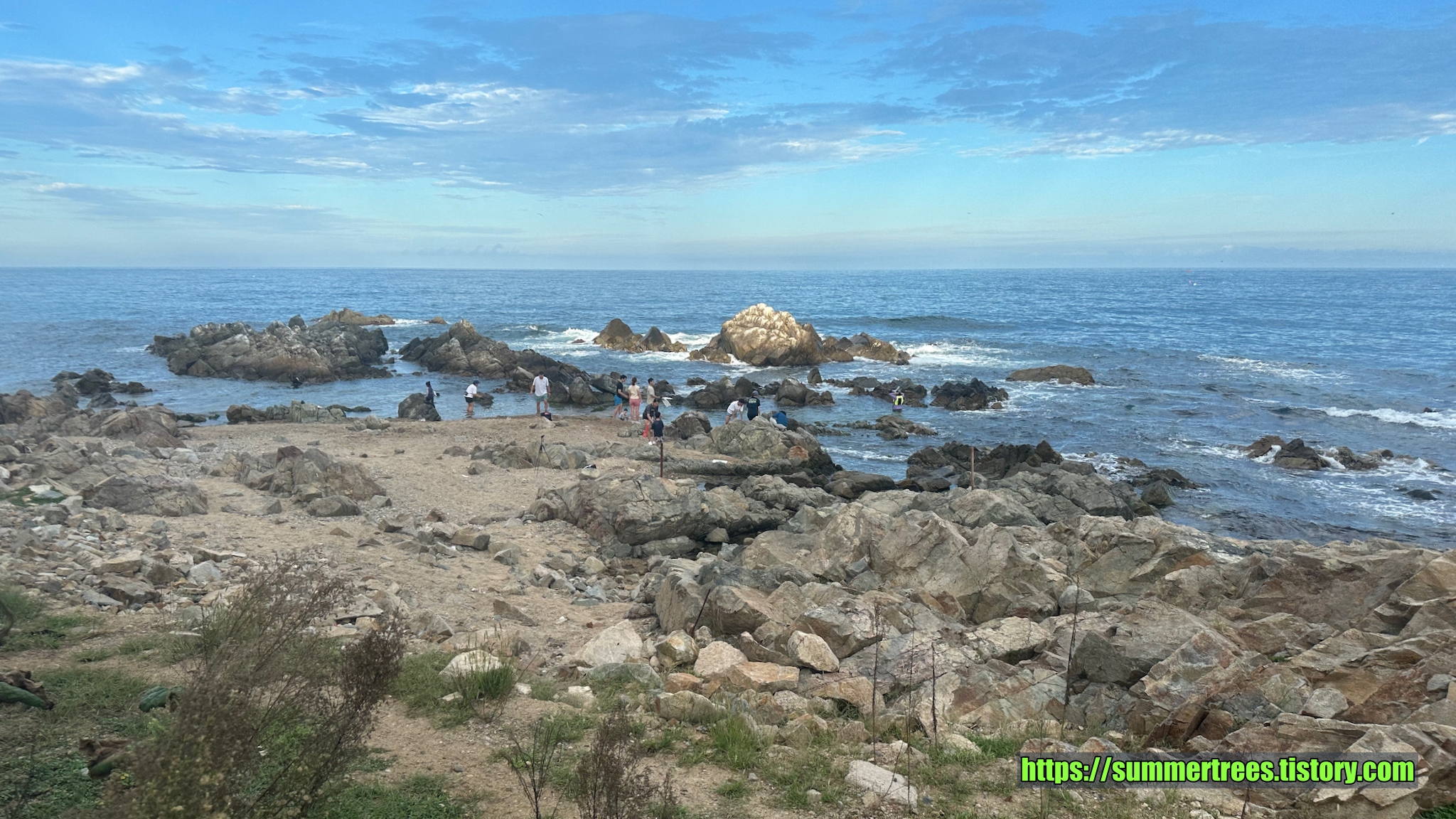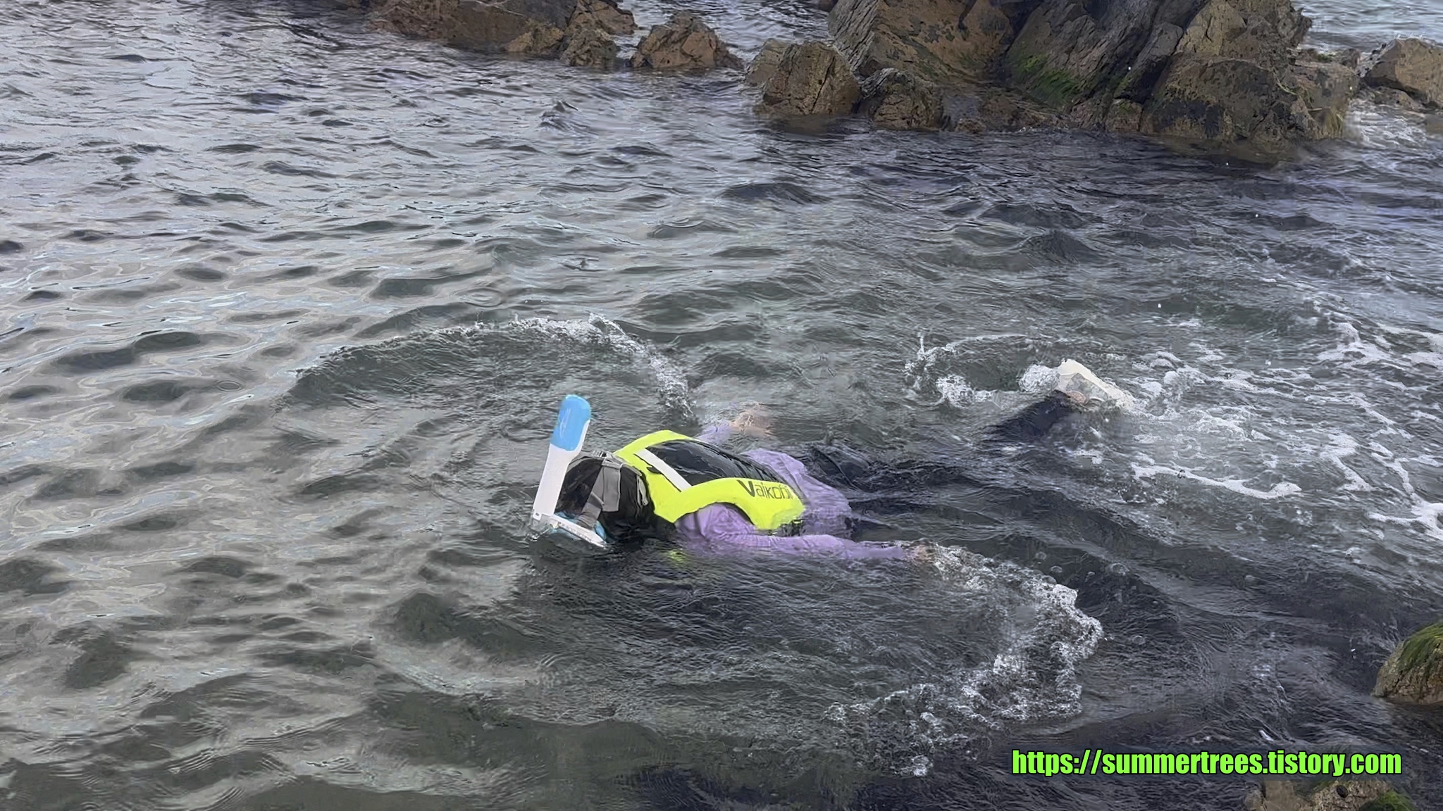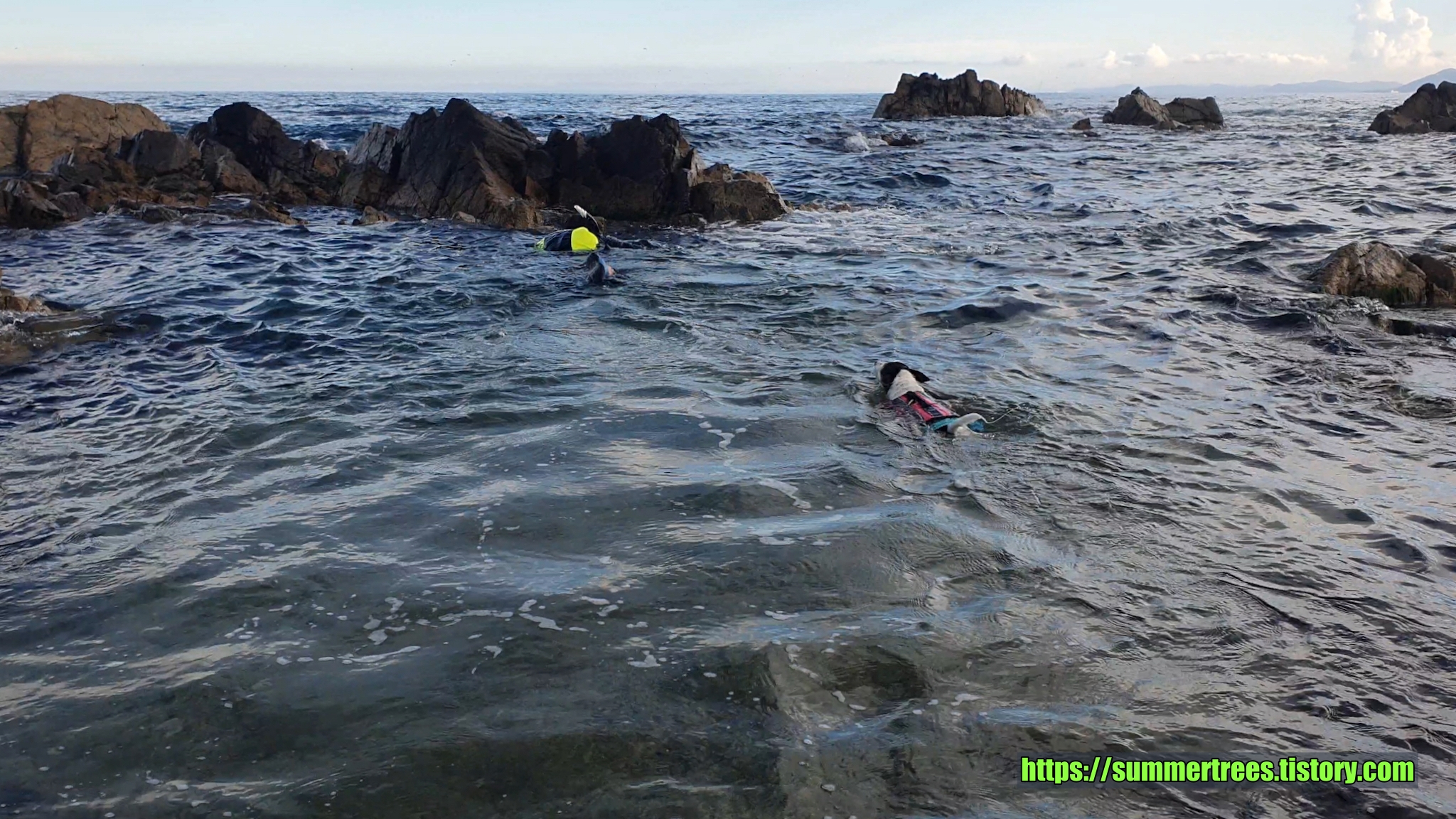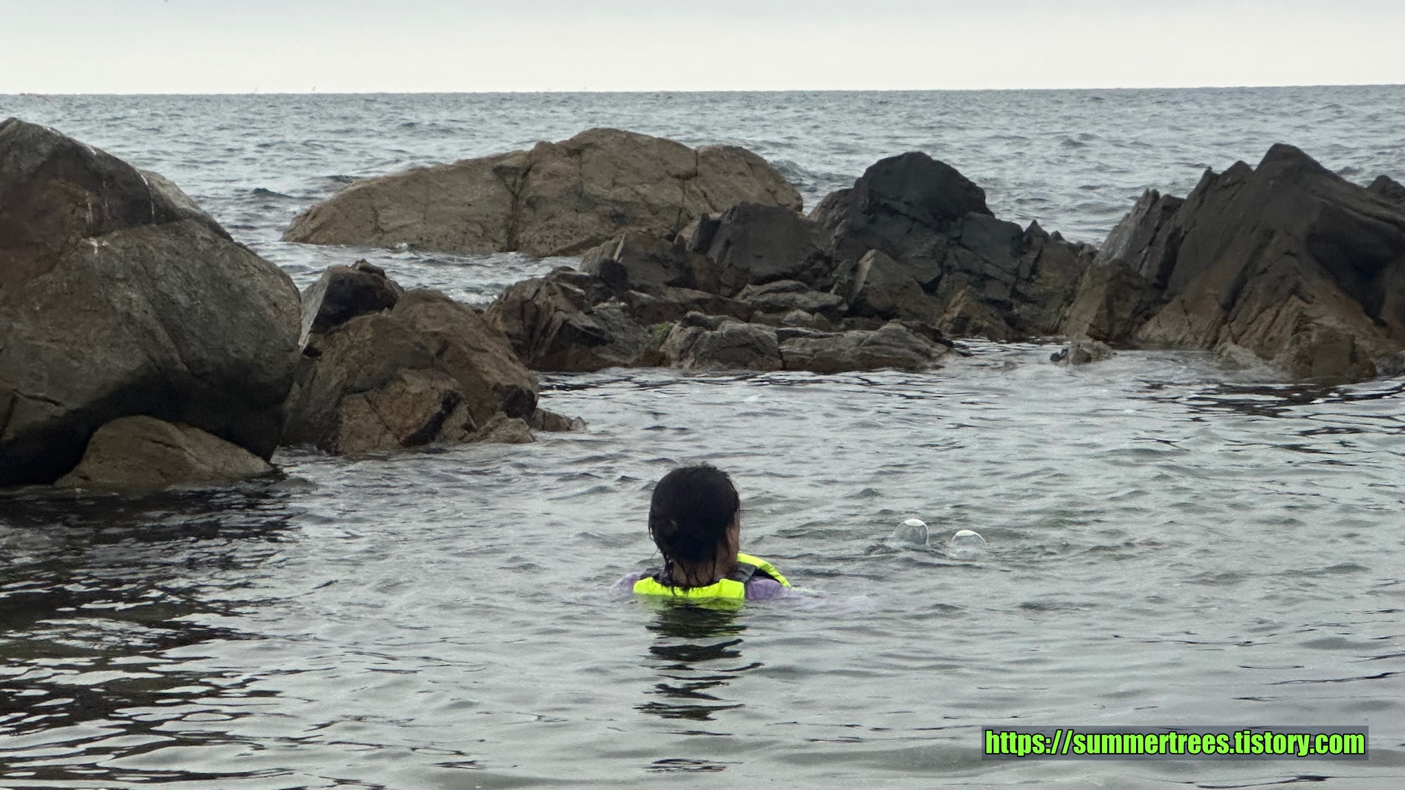 정말 좋았던 것은 펜션 앞의 바다에서 물놀이를 할 수 있다는 것이다. 조그만 모래해변이 있어 퐁당거리며 물놀이 하기 좋다. 스노클링을 즐길 수도 있다. 우리 같은 초보들은 바위 안쪽에서 퐁당거리며 스노클링을 즐기고, 좀 해 본 사람들은 바위 바깥까지 나가기도 했다.