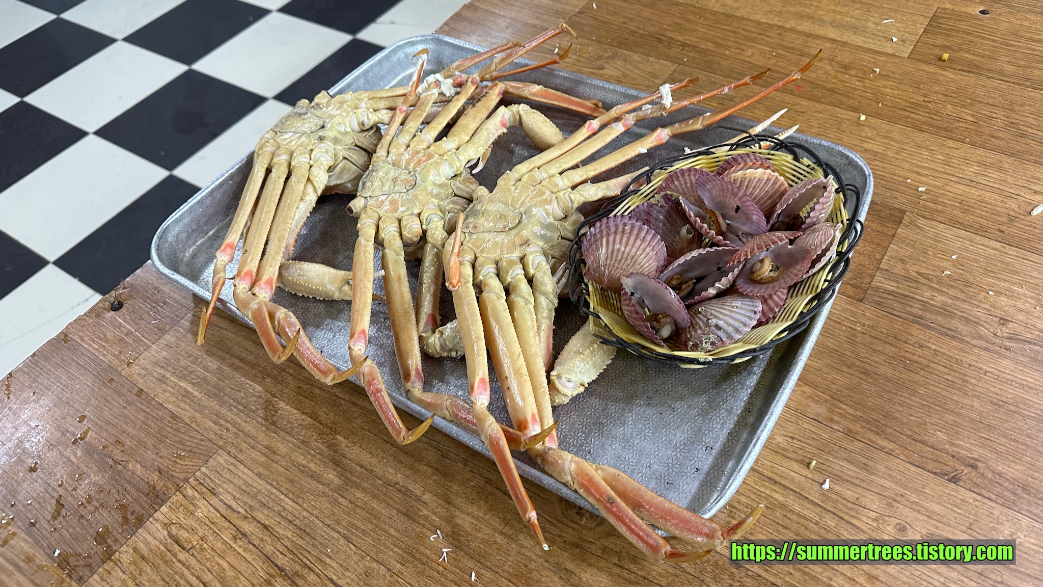 여러 가게에서 가격을 물어보고 대게를 사는 것이 좋다고들 하는데, 알고 있지만 지켜지지 않는다. 이번에도 예전이랑 같은 집에서 샀는데 항상 첫 집에 잡혀 사고 만다. 나중에 같은 가게에서 산 다른 사람의 가격을 훔쳐 들었는데, 우리가 좀 더 싸게 샀다.