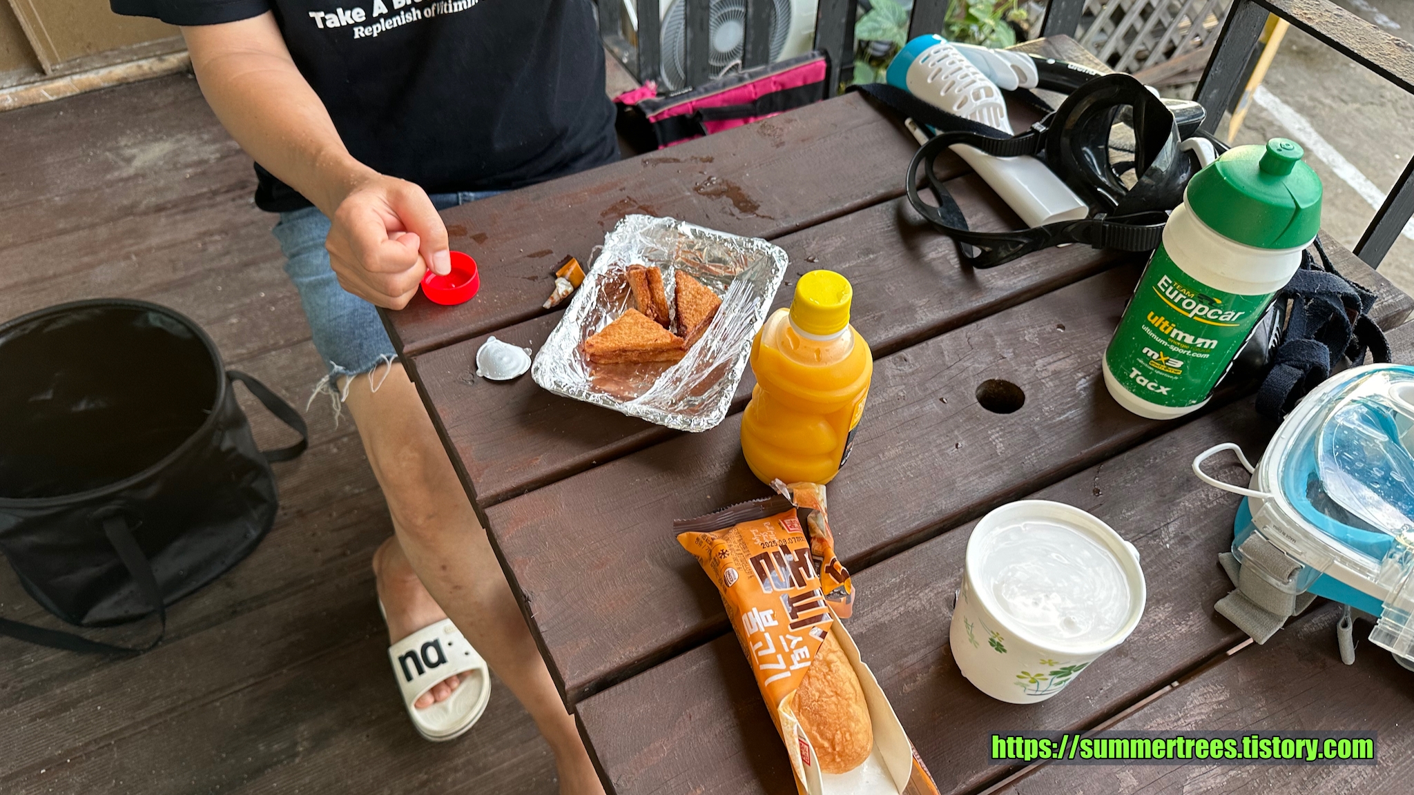 아침식사는 전날 사뒀던 군것질거리로 때웠다.