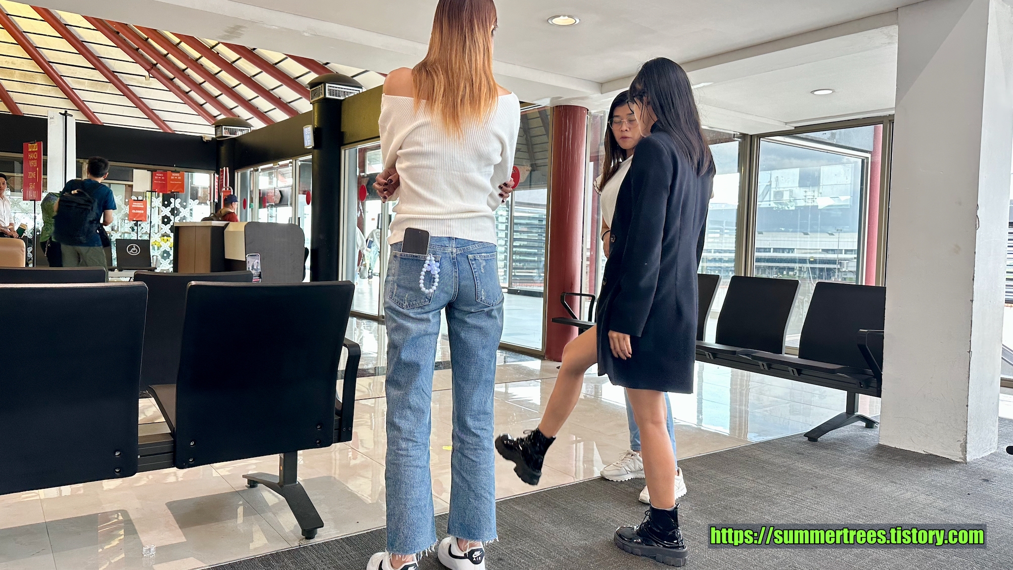 아가씨 셋이서 공항 탑승장 부근에서 춤을 추며 놀고 있었다. 유튜브를 찍는 듯.