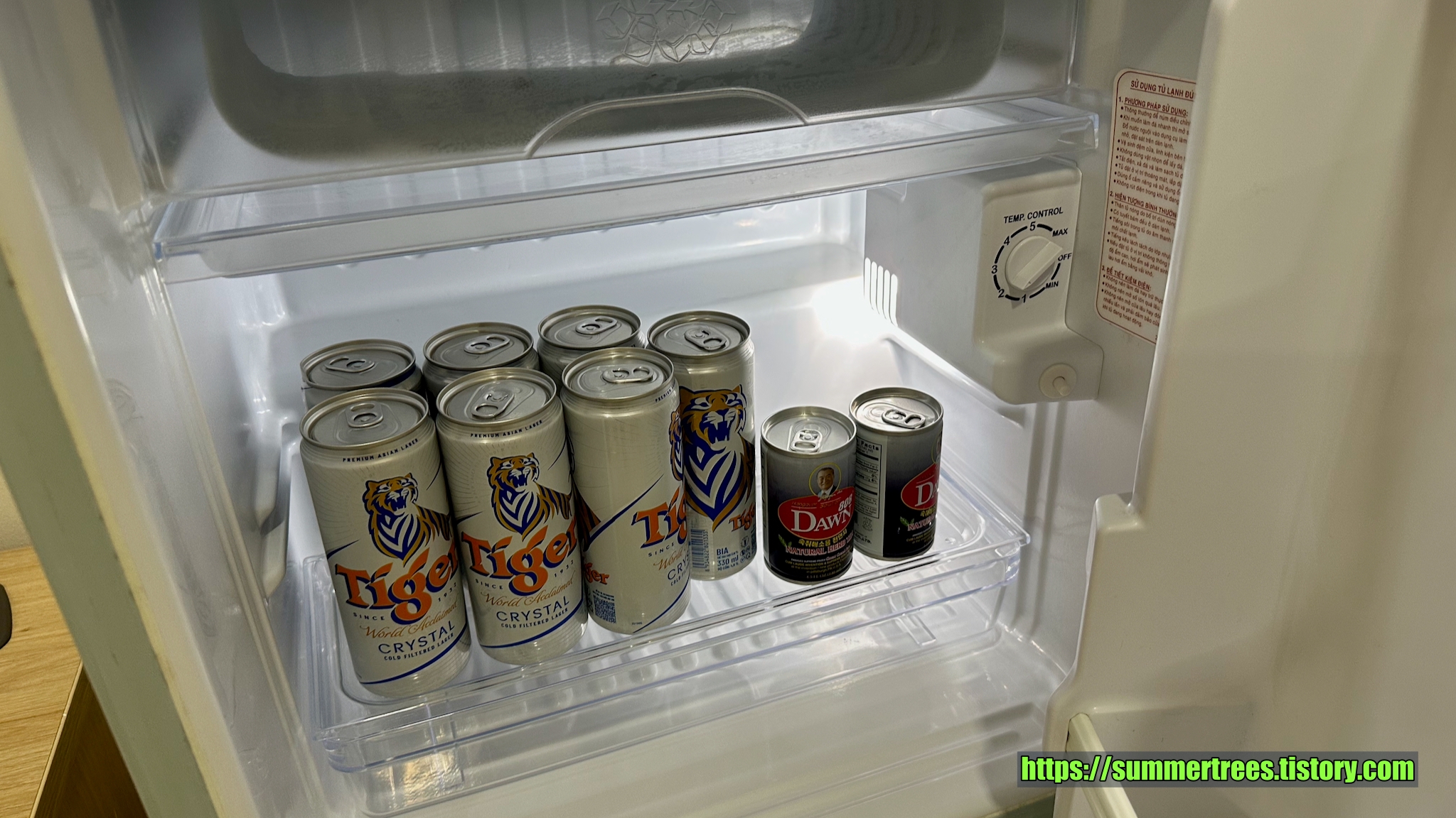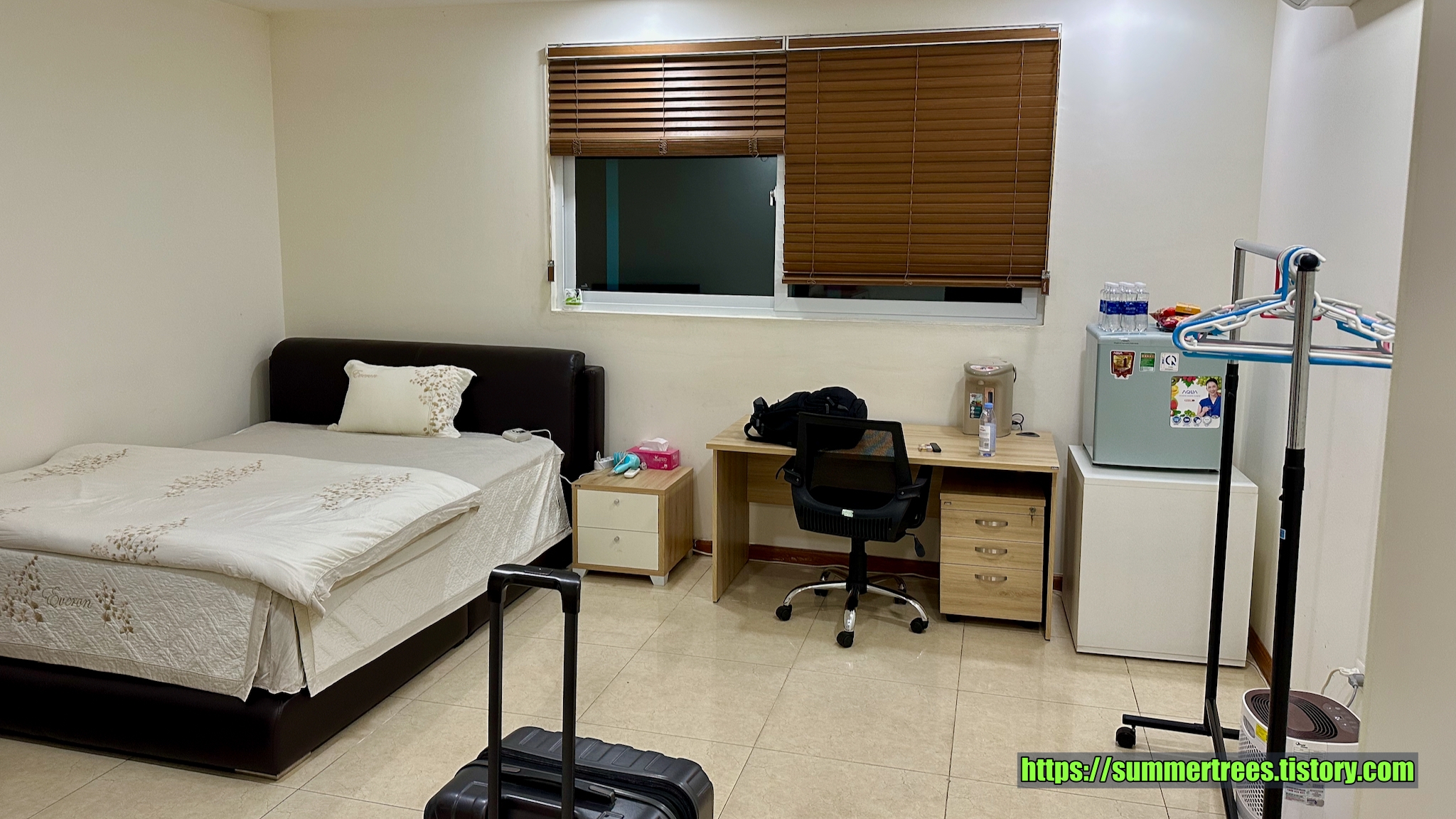 기숙사의 VIP실. 일할 수 있는 책상도 있고 냉장고엔 맥주와 여명까지 준비돼 있었다.