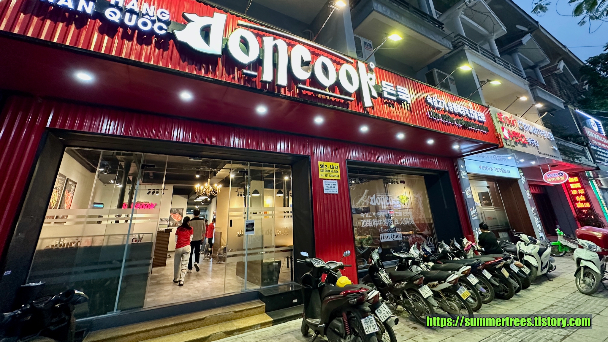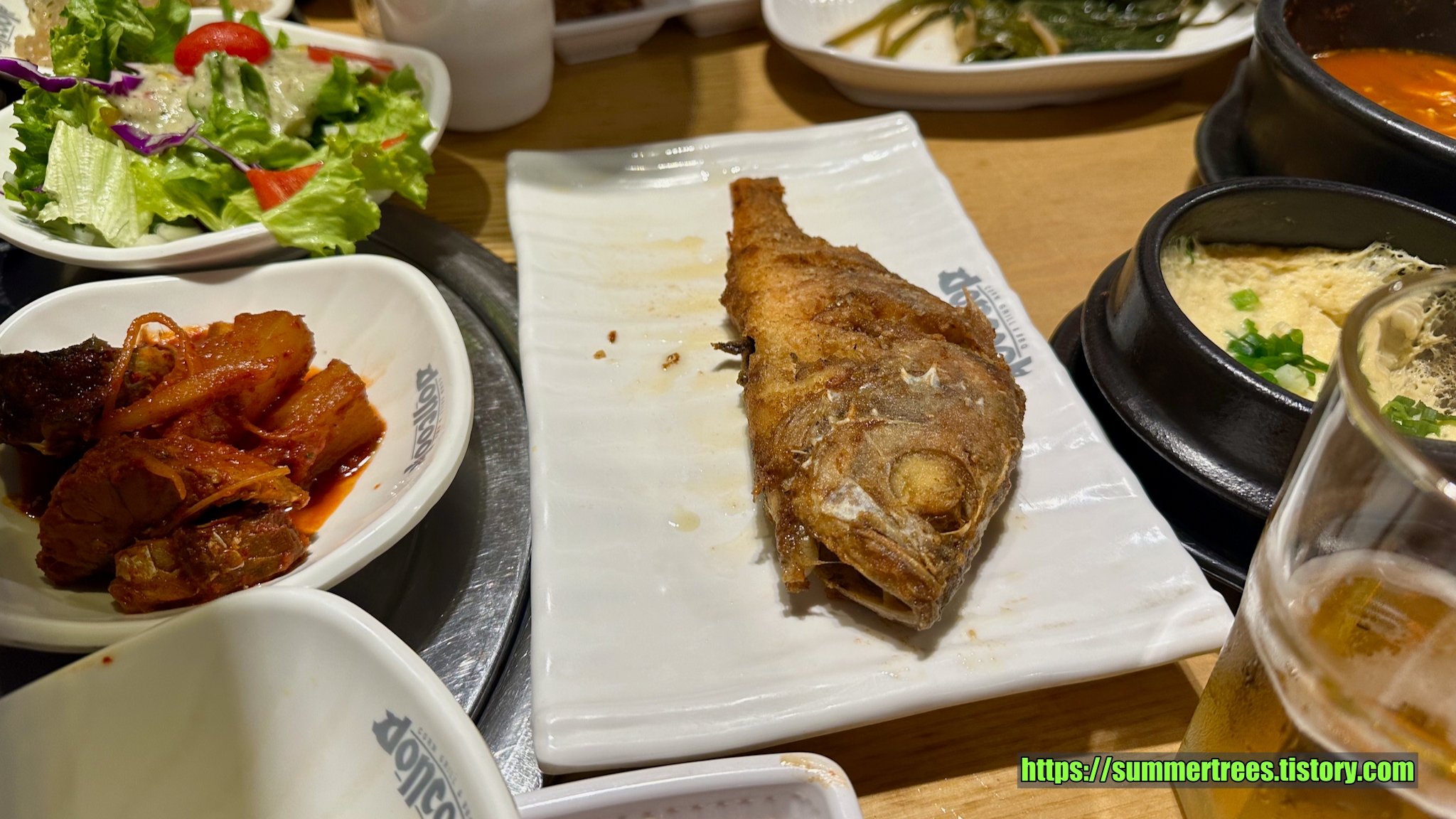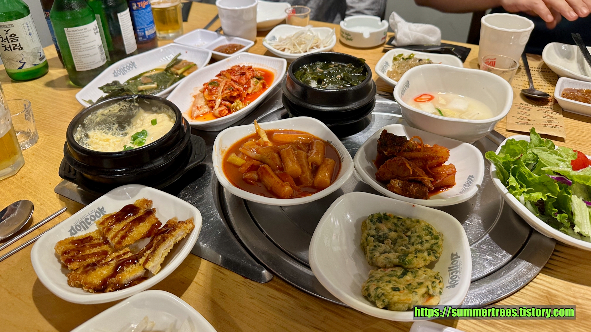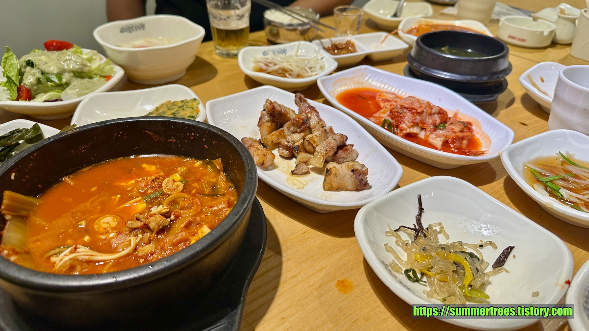 돈쿡이라는 식당에서는 삼겹살을 먹었는데 직원이 고기를 구워주는 방식이고 반찬 종류가 많으면서 맛있었다.