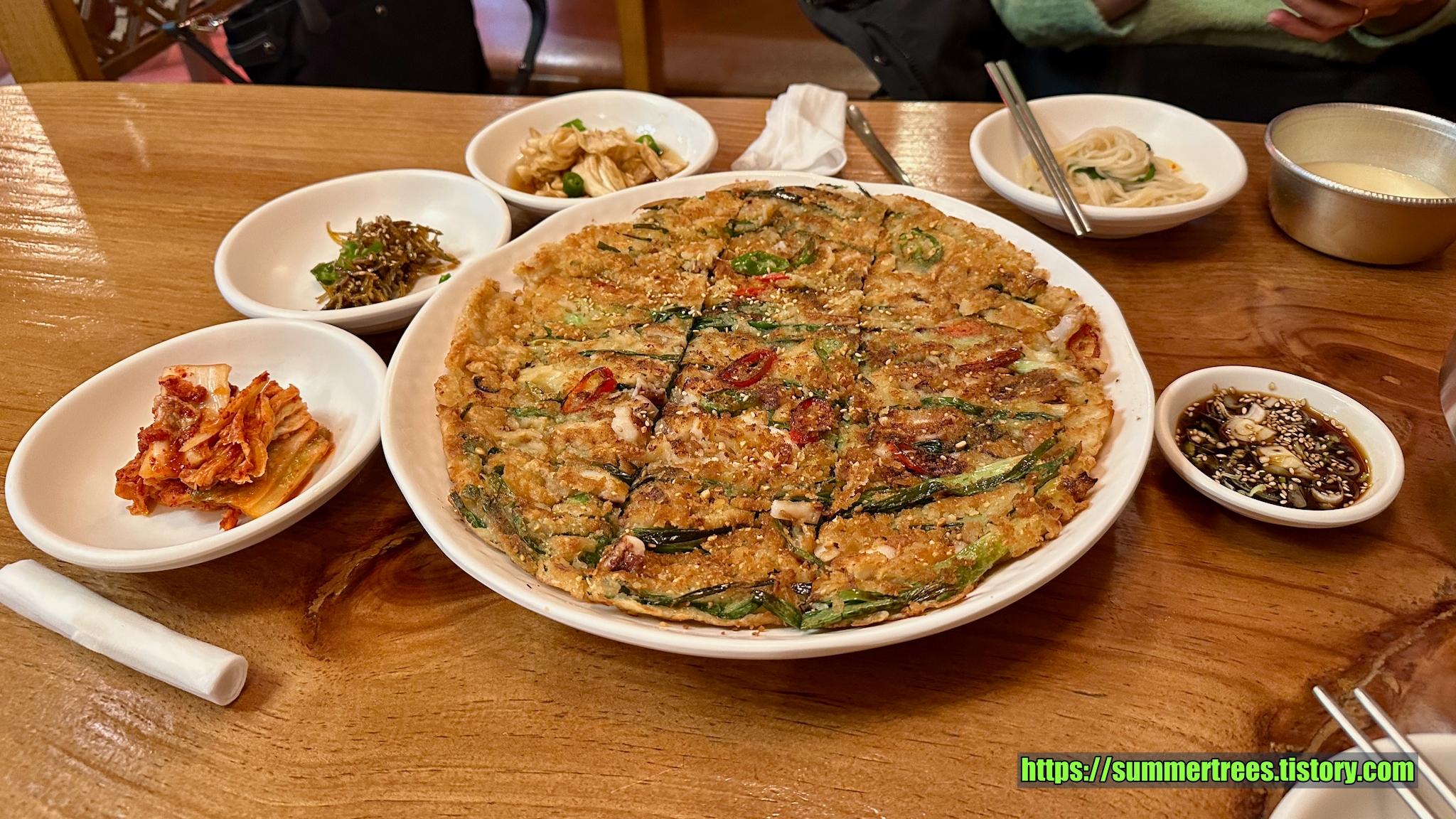 국수와 함께 파전을 시켰는데 만족스러웠다. 해산물이 듬뿍 들어있고 막걸리와 잘 어울렸다.