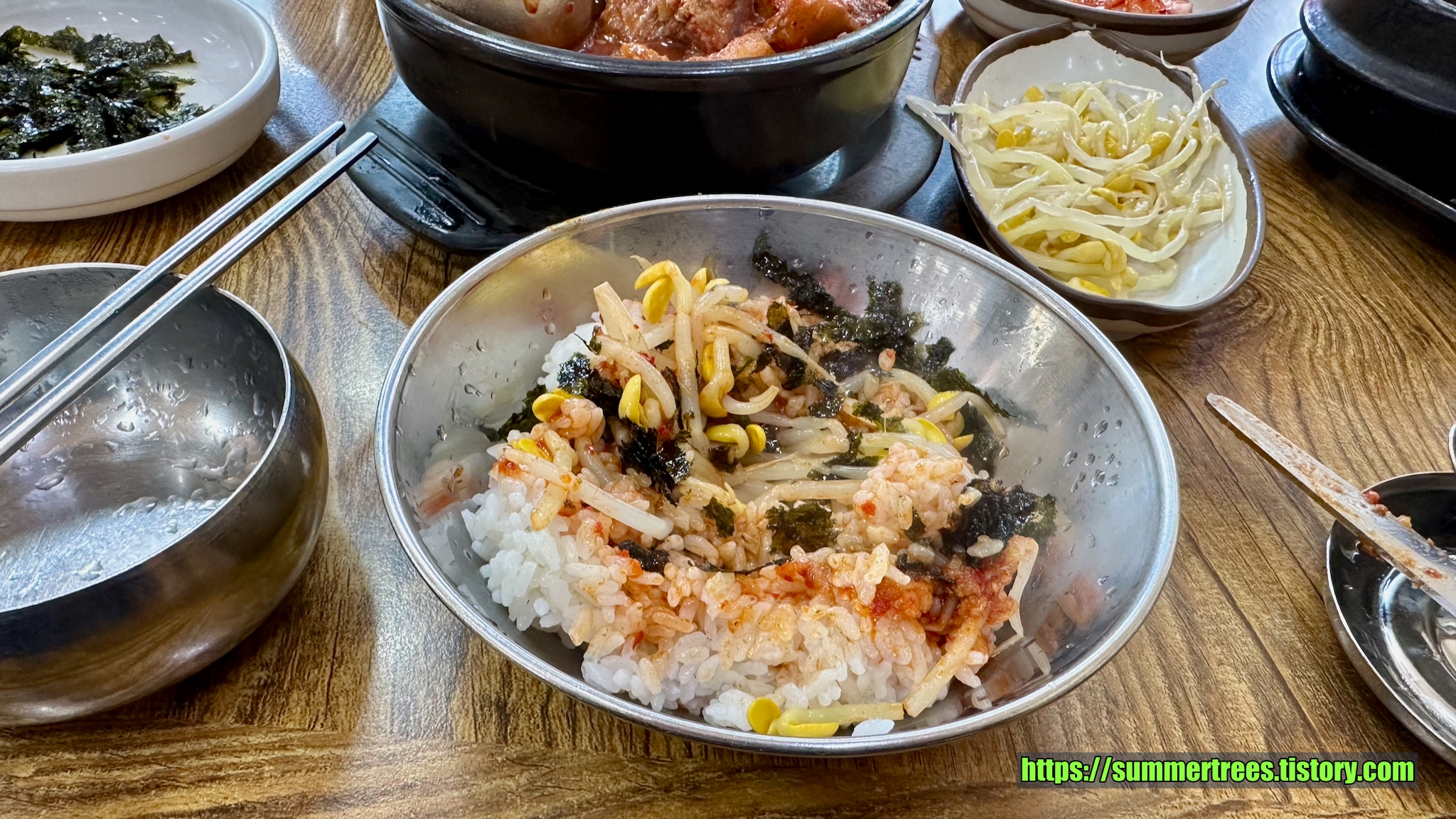 소갈비는 여느 소갈비와 같고, 양념이 얼큰하고 달달한게 밥과 비벼먹기 좋다. 밥과 함께 콩나물을 더 달라고 해서 듬뿍 넣고 김과 함께 비벼먹으면 된다. 얼큰하지만 그리 맵지는 않아 좋다.