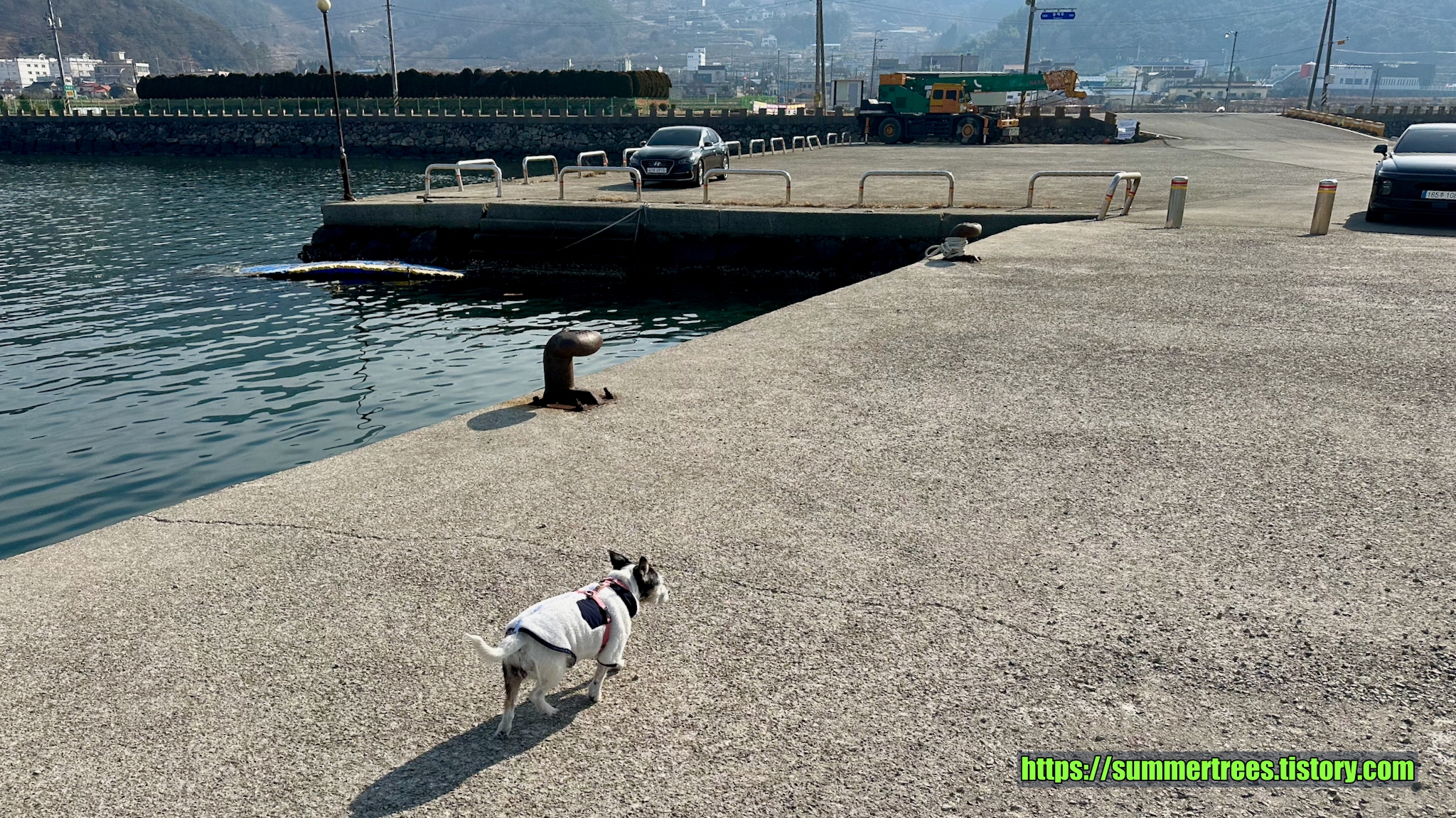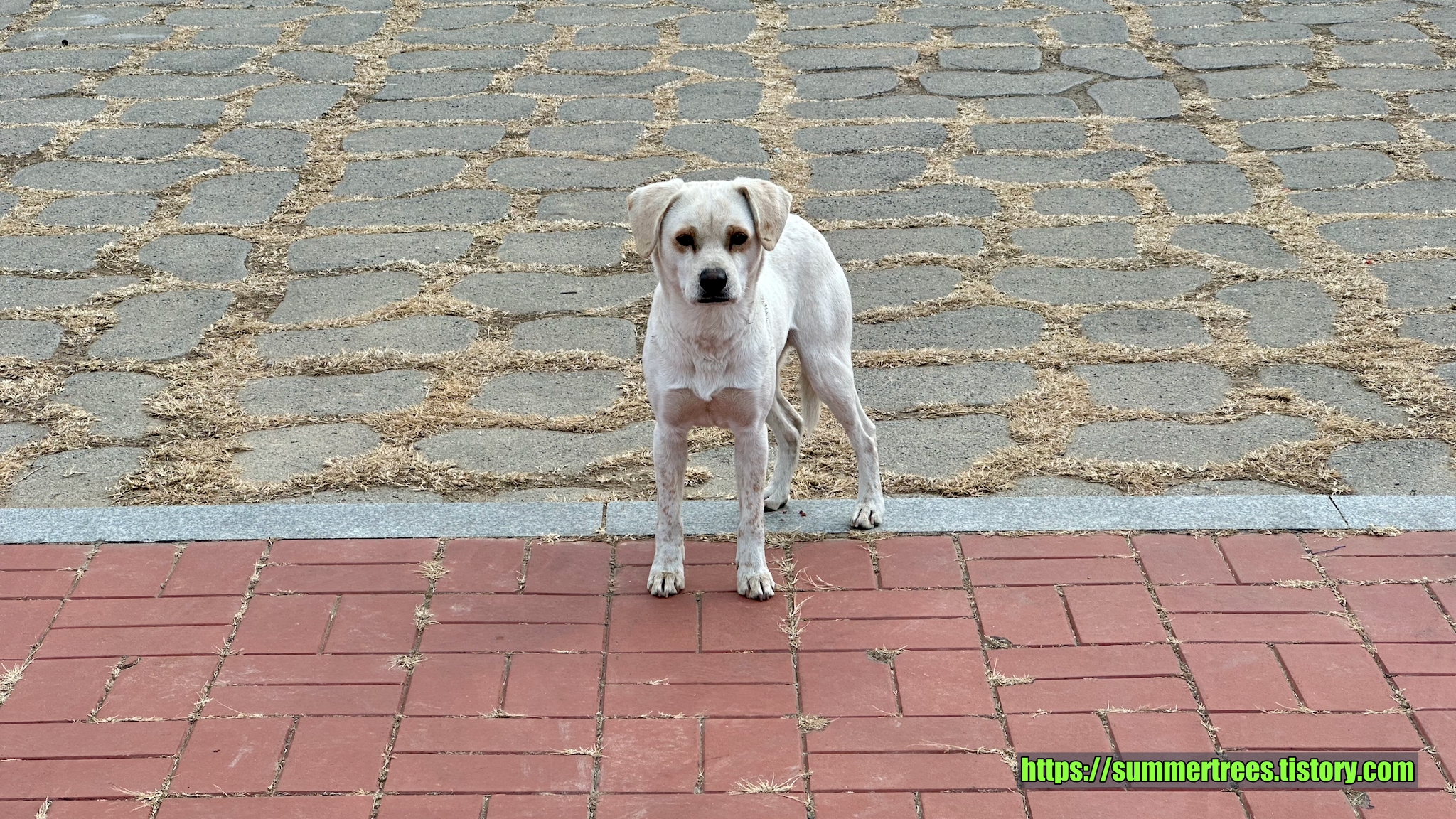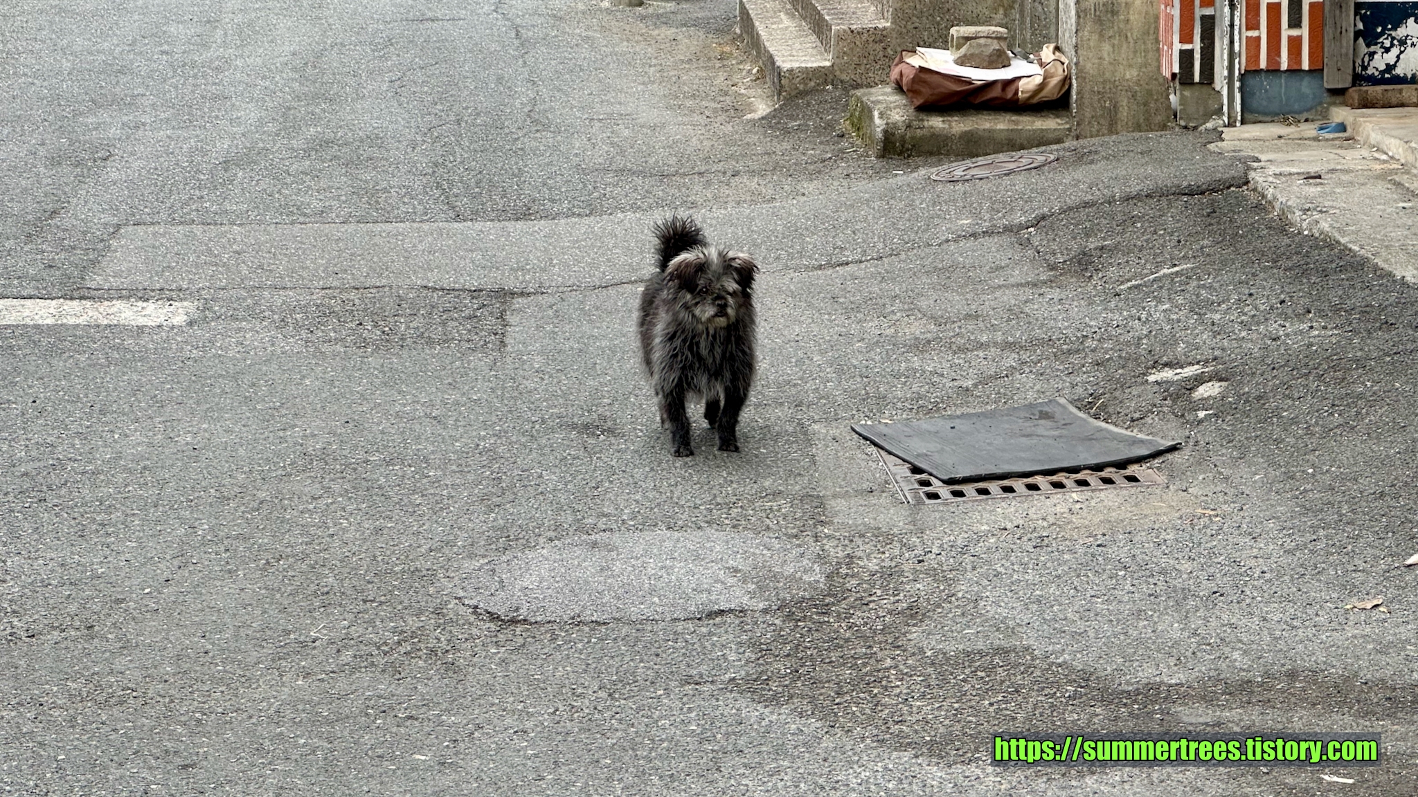 삼랑진 시장골목의 나이 많은 강아지. 마야가 물려도 덤벼도 얌전히 자리를 피했다. 주인이 있나 없나 궁금했다. 길에서 강아지들을 보면 마야와 대비가 되어 마음이 좋지 않다.