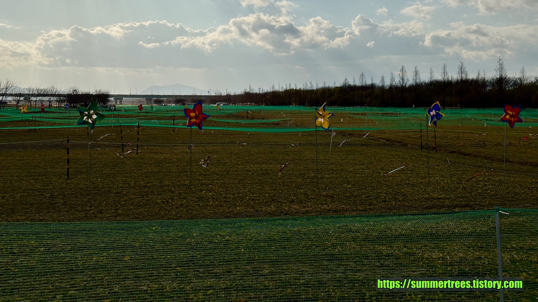 4월의 유채꽃축제를 준비하는지 씨를 뿌려둔 모양이었다. 새가 망치지 못하게 하려고 그러는지 바람개비를 많이 세워뒀다.