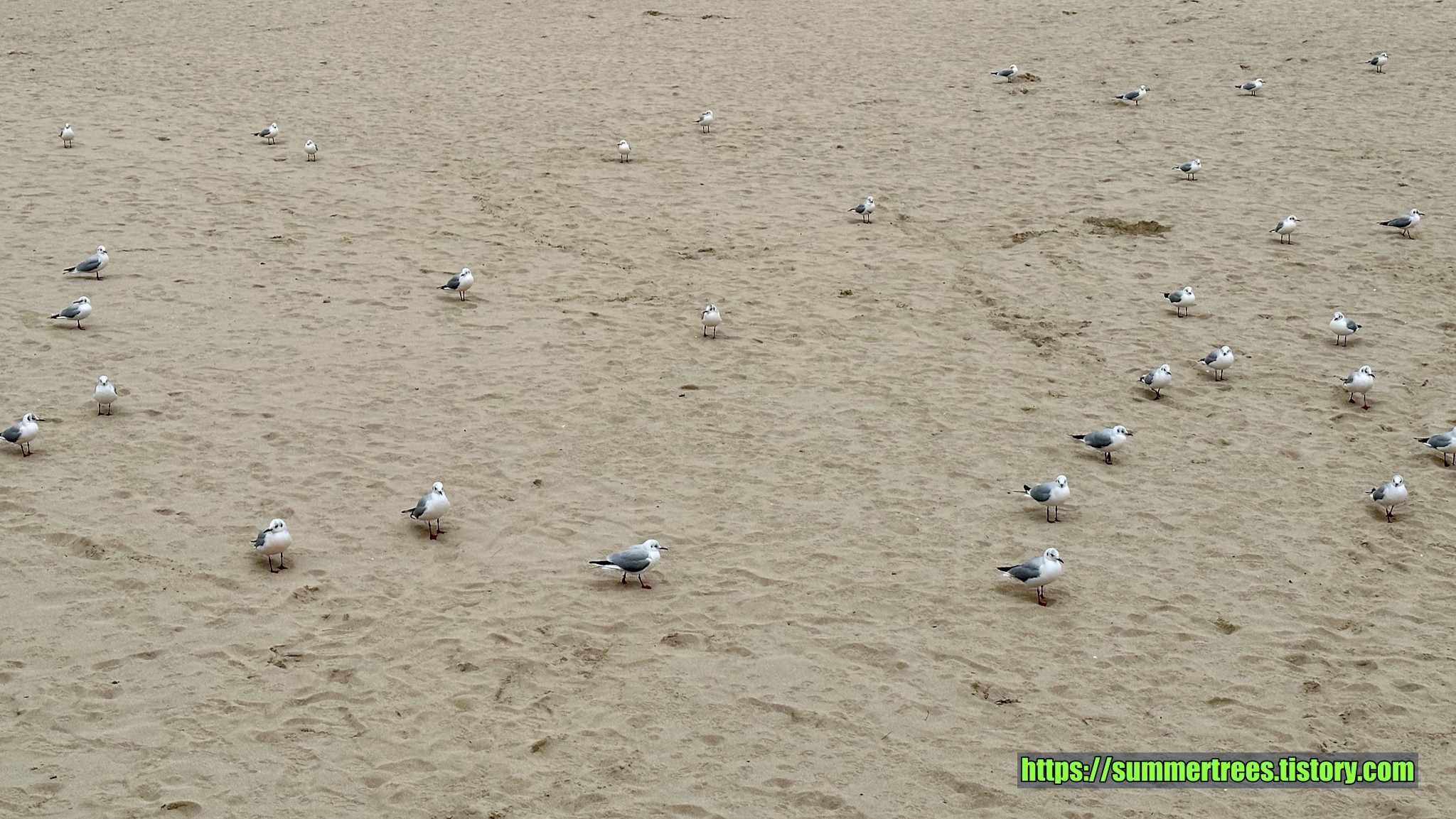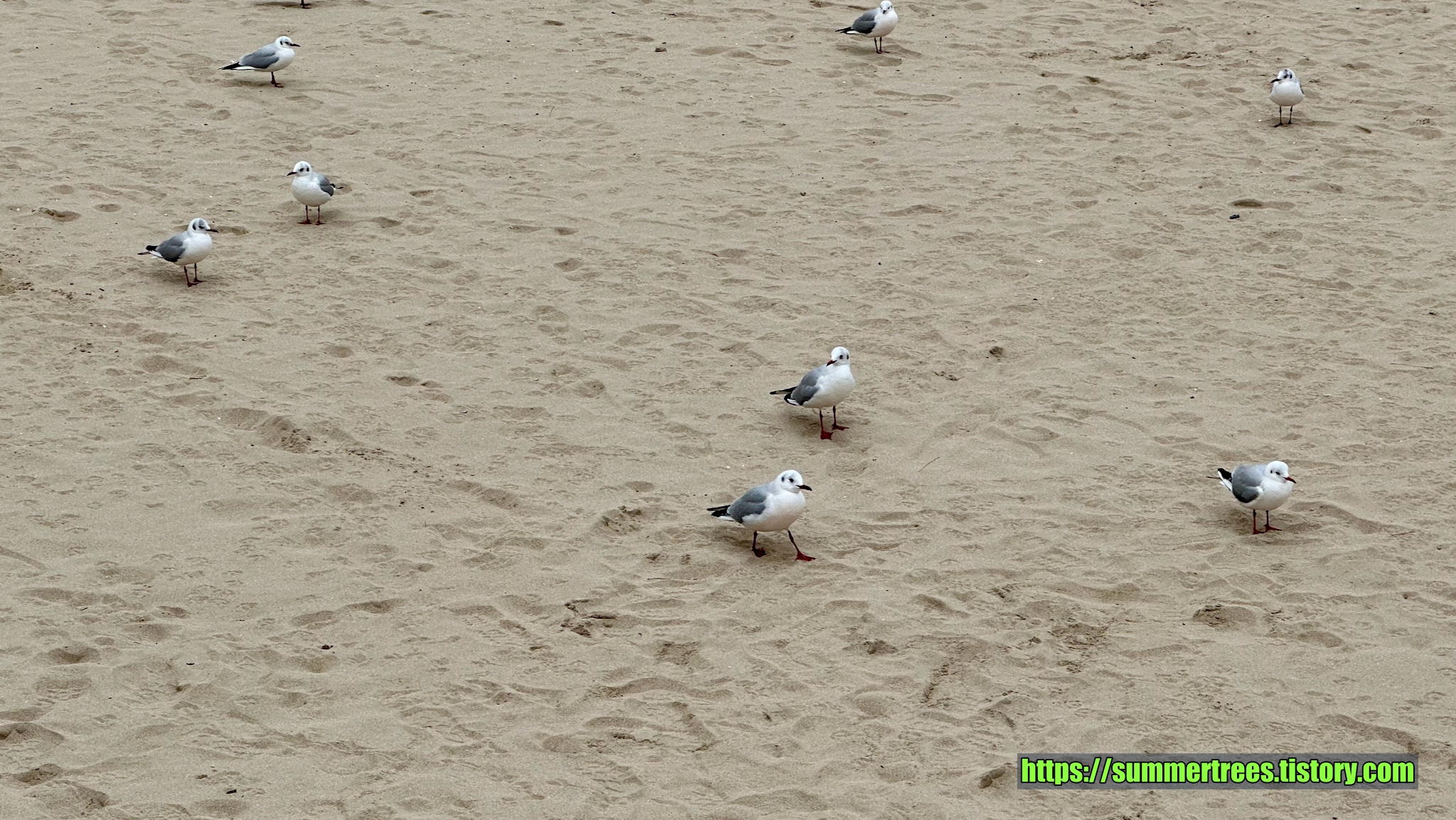 해변에서 쉬고 있는 갈매기들이 귀여웠다.